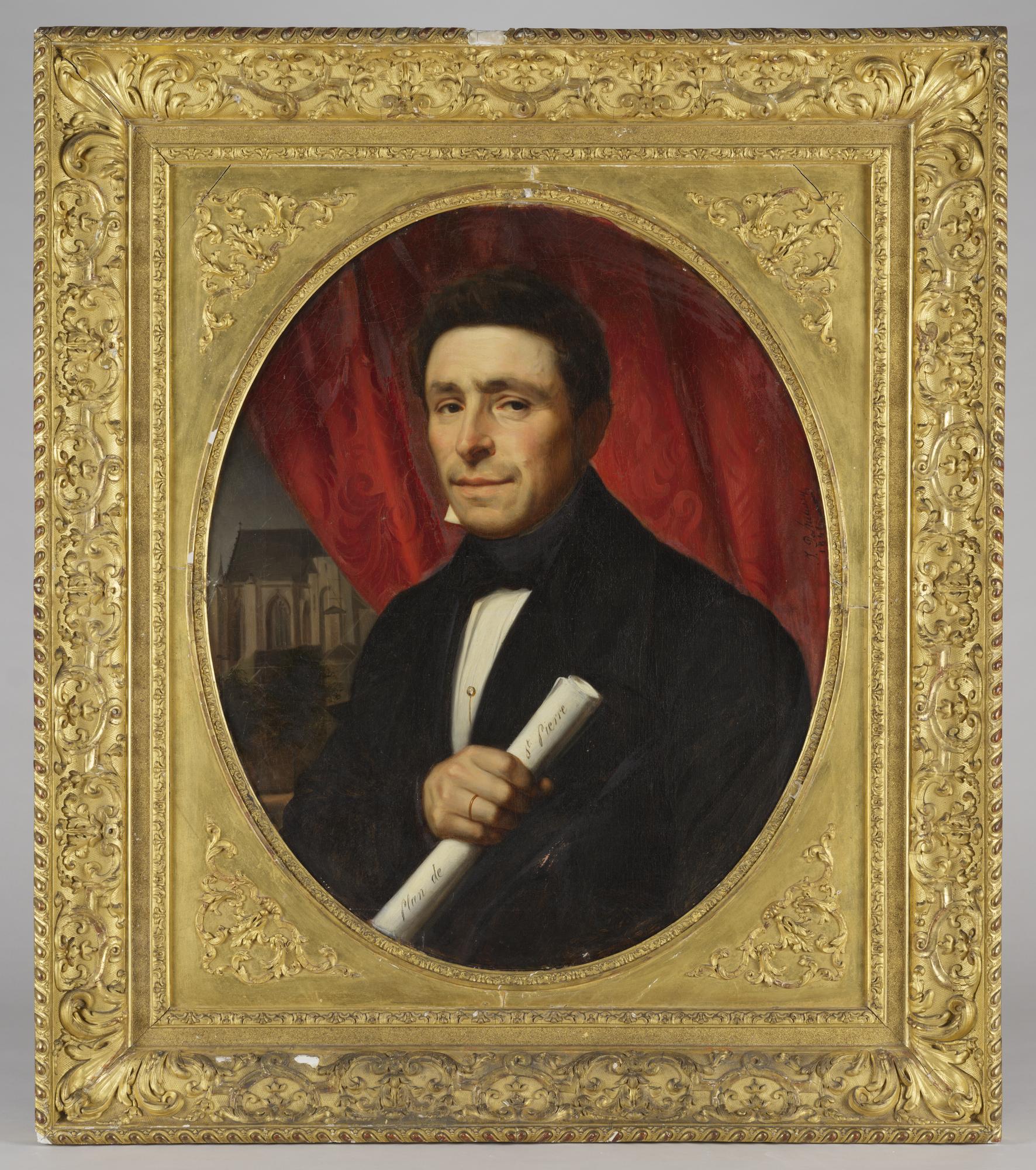 Ce portrait peint par Jean-Baptiste Jules Dehaussy (1812 – 1891) représente Jean-Pierre Garreau, urbaniste et architecte nantais. Jean-Pierre Garreau est chargé de la réfection de la cathédrale Saint-Pierre-et-Saint-Paul de Nantes de 1839 à 1848. Il est d’ailleurs représenté dans ce portrait tenant à la main le « Plan de St Pierre » tandis que le chevet de la cathédrale est dévoilé au second plan. Suite à la rénovation de la cathédrale de Nantes, un procès de 4 ans se tient de 1848 à 1852, l’architecte Jean-Baptiste-Antoine Lassus, chargé de contrôler les travaux, accusant Jean-Pierre Garreau et l’architecte Seheult de mauvaise gestion du chantier. Jean-Pierre Garreau est finalement innocenté et reçoit un dédommagement.