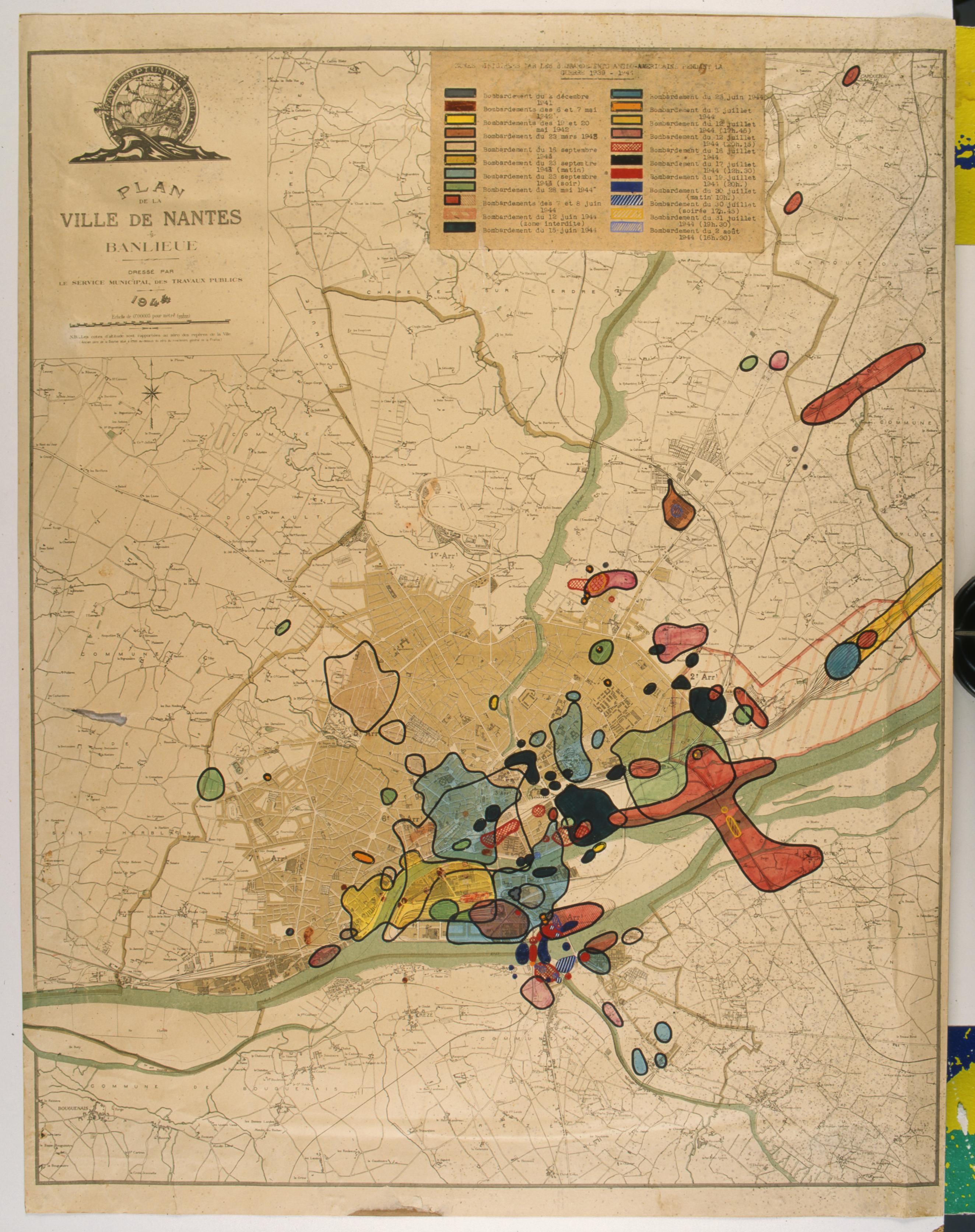 En août 1944, Nantes est libérée mais c’est une ville meurtrie. Un quart du territoire communal et 45 % du parc immobilier ont été touchés par les bombardements. Le centre-ville est ravagé. Ce document, réalisé à l’initiative du service municipal des travaux publics, montre l’impact des raids aériens sur la ville en 1944 et laisse présager l’ampleur des travaux de reconstruction une fois la paix revenue.