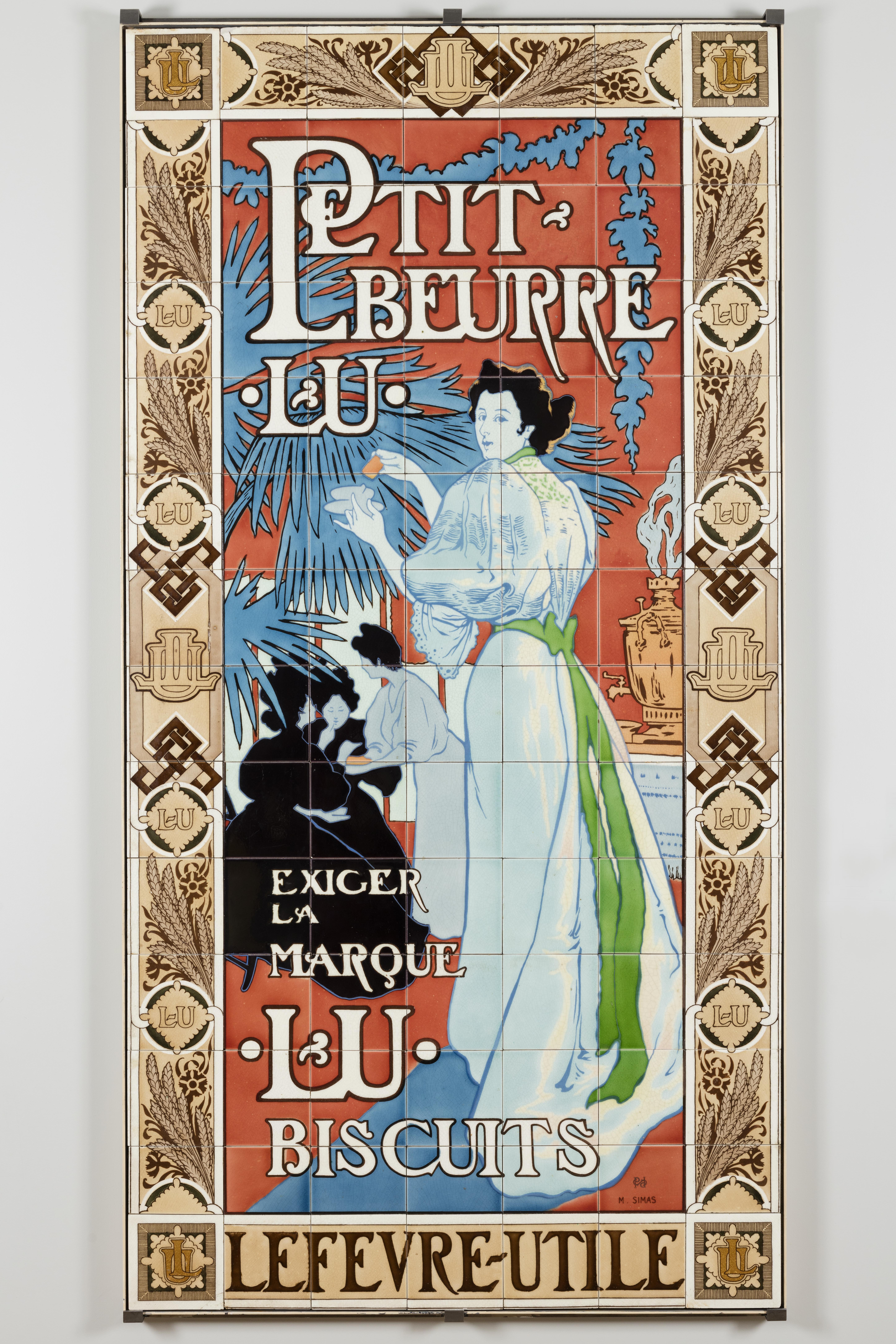 L’artiste Eugène Martial Simas réalise de nombreux objets publicitaires pour LU. Ces deux panneaux en céramique émaillée de Sarreguemines sont exécutés pour le pavillon LU à l’Exposition universelle de Paris en 1900. Rapatriés ensuite à Nantes, ils décorent les murs de l’entreprise avant leur transfert au musée en 1976.