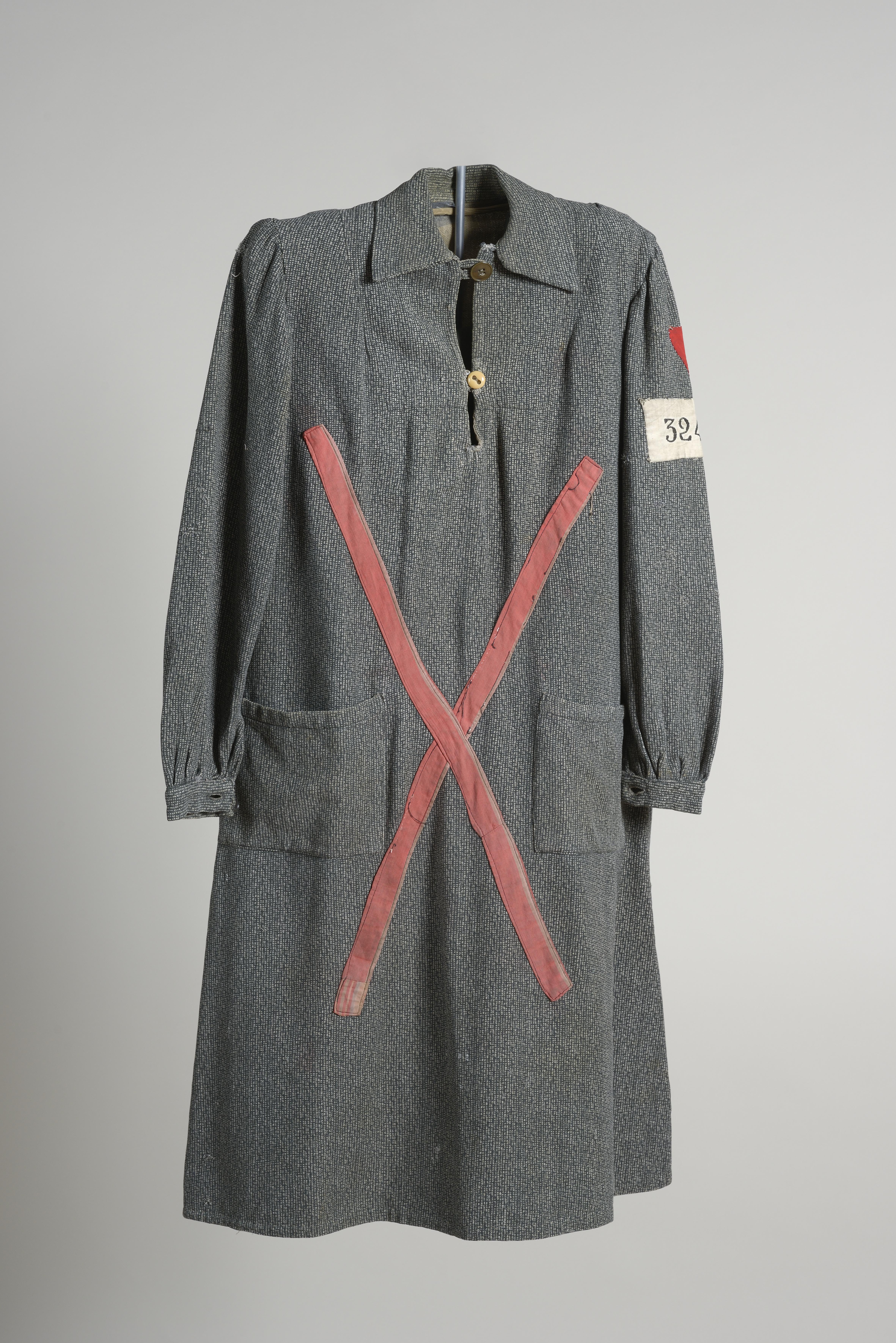 Cette robe a été portée par Jeanne Bouvron au moment de son internement au camp concentrationnaire de Ravensbrück en 1944-1945.