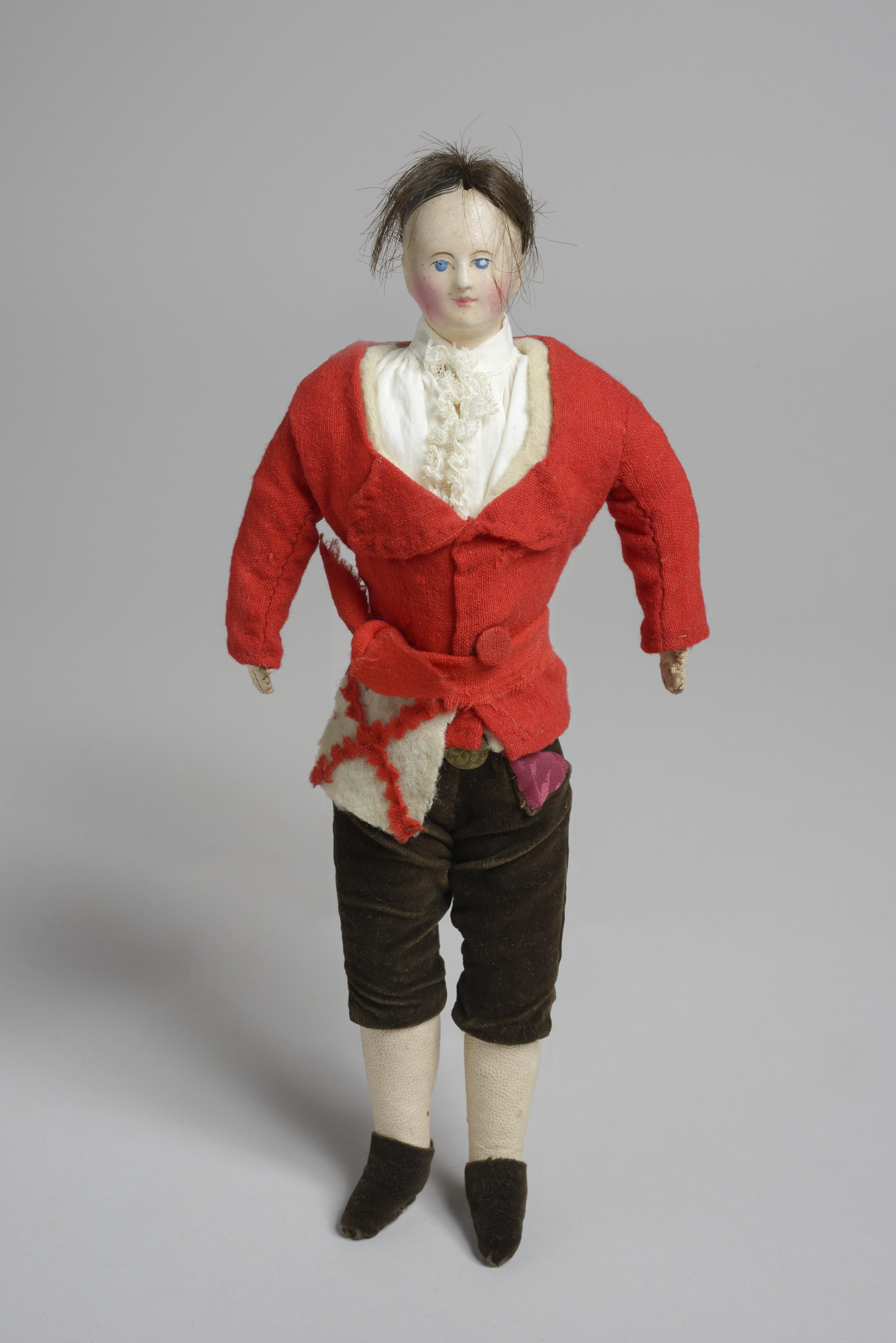 Cette petite poupée masculine, vêtue d’un pantalon de velours brun et d’une veste rouge, provient de Suisse.
