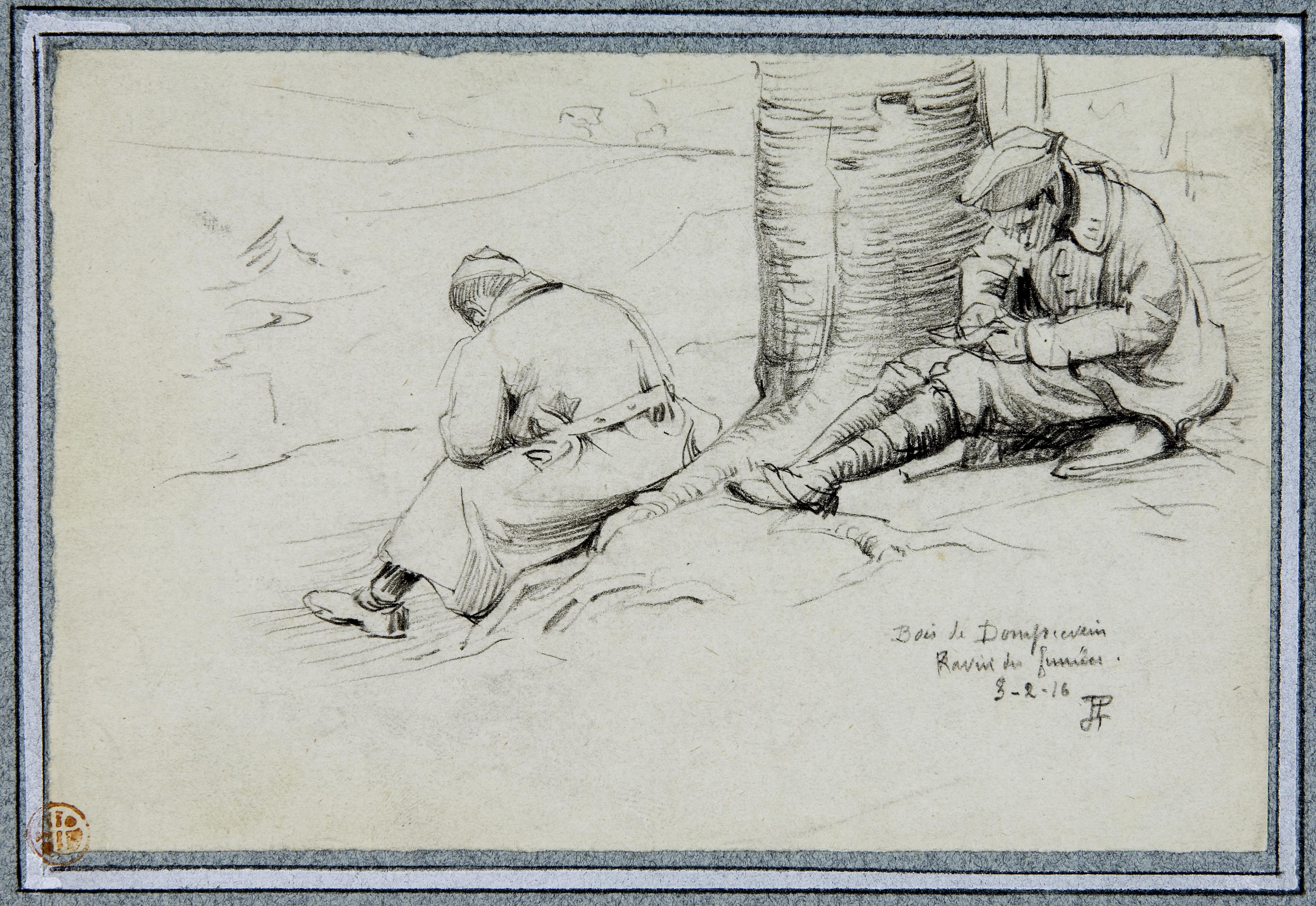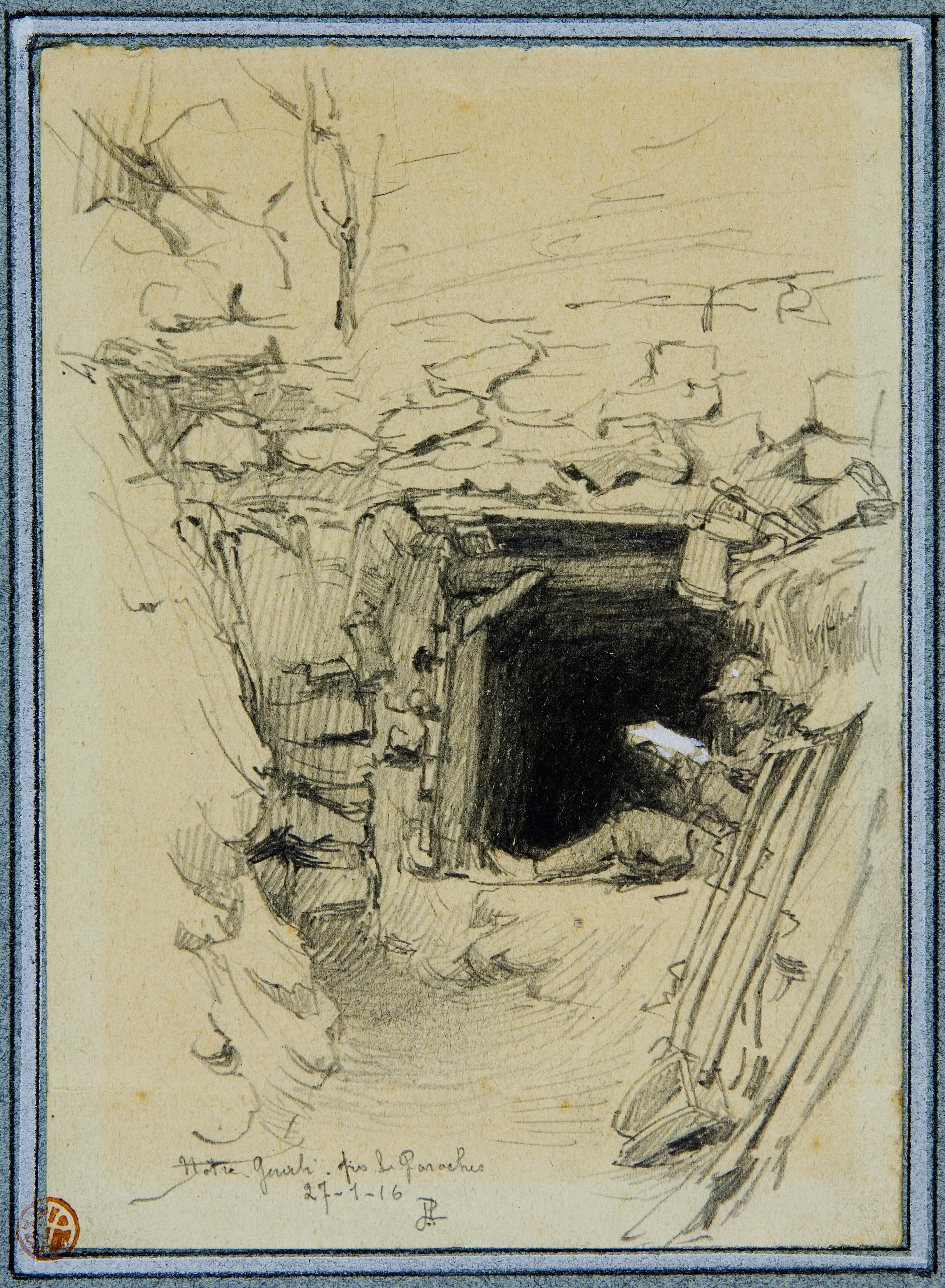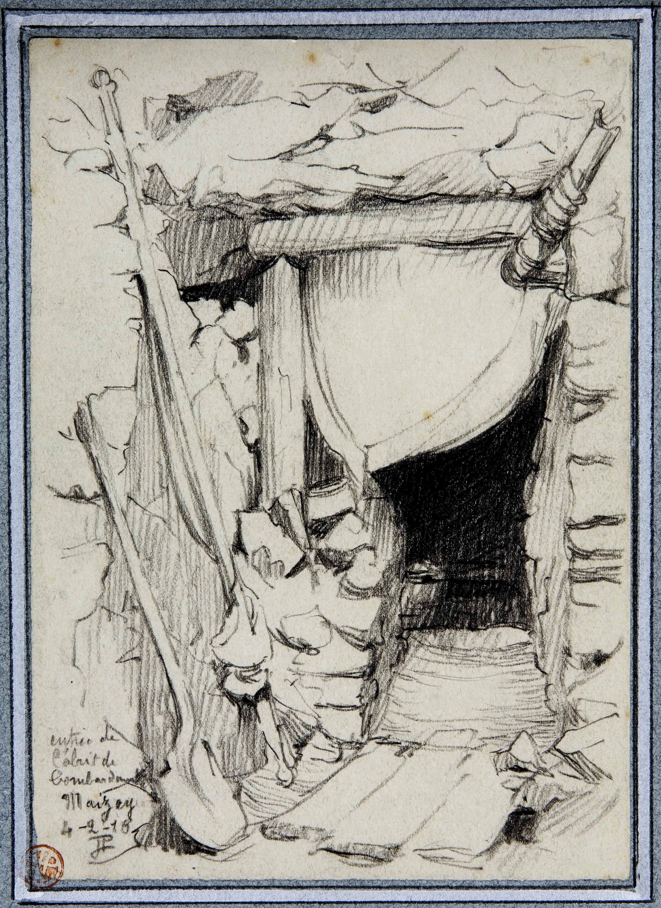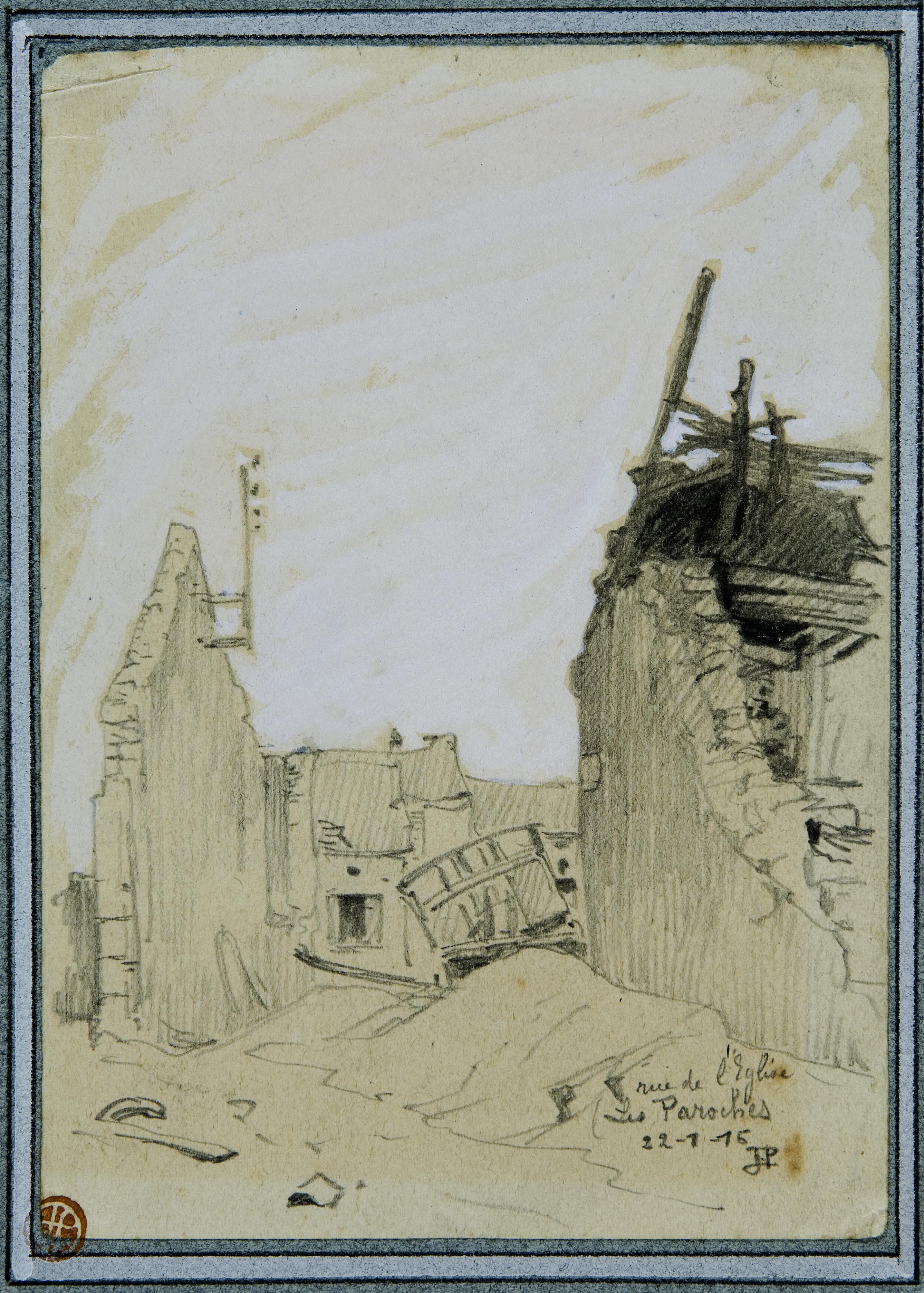 Âgé de 33 ans en 1914, l’artiste nantais Jules Ponceau, ancien élève de Louis Olivier Merson, Gervais et Clairin, récompensé quatre ans plus tôt au Salon des artistes français, pour son œuvre gravé, est incorporé au 106e régiment d’infanterie territoriale, régiment de réservistes. Il participe aux combats qui se déroulent dans la région de la Meuse, notamment dans le canton de Saint-Mihiel durant les deux premières années de la guerre. Blessé en 1916, il reste à l’hôpital plusieurs mois. Après la guerre, il réalise un album à partir des dessins et des croquis qu’il a faits sur le front, le dédiant à son fils, Yves, qu’il exhorte à lutter pour le maintien de la paix. Son œuvre montre toute l’horreur des combats.