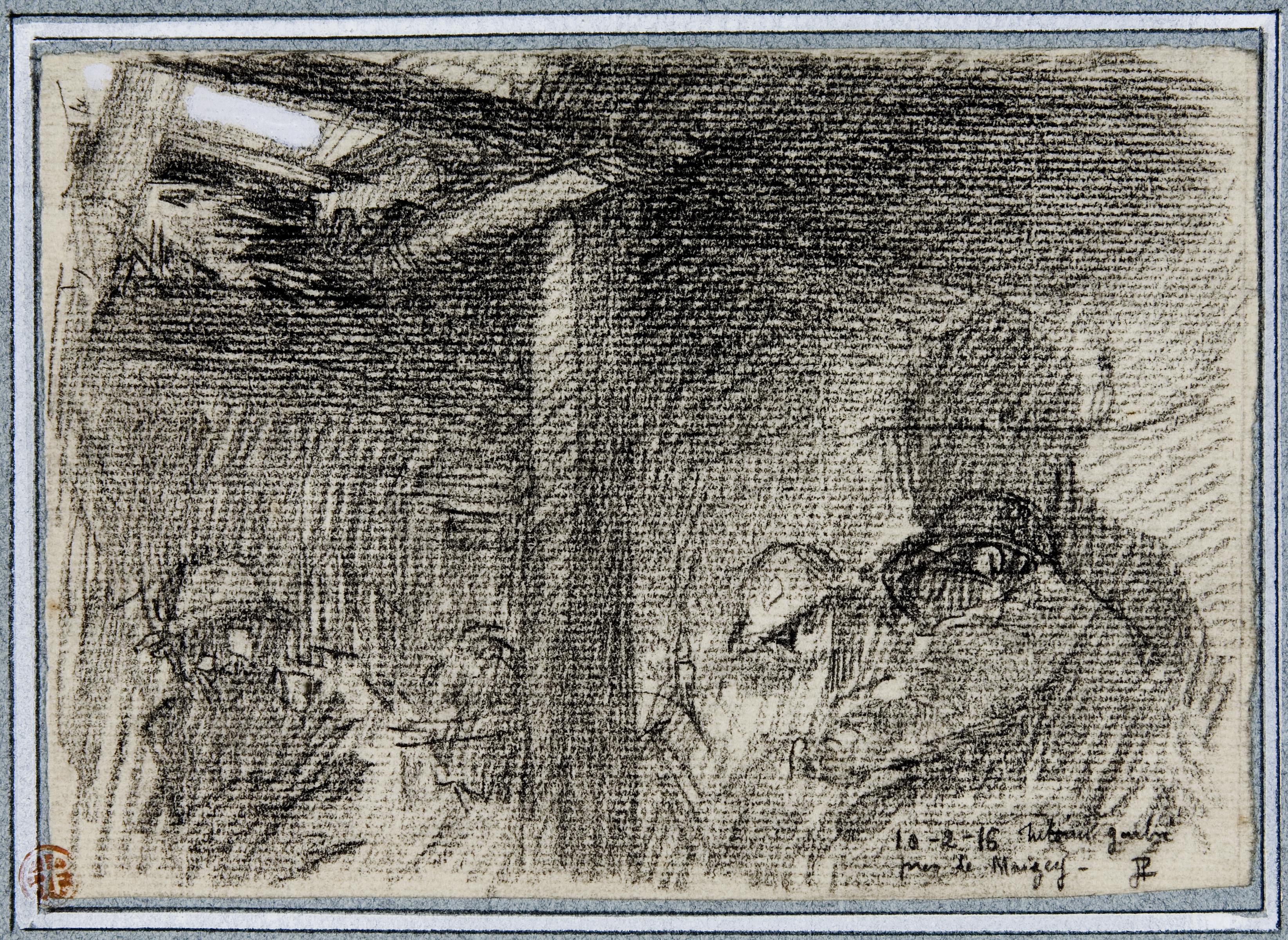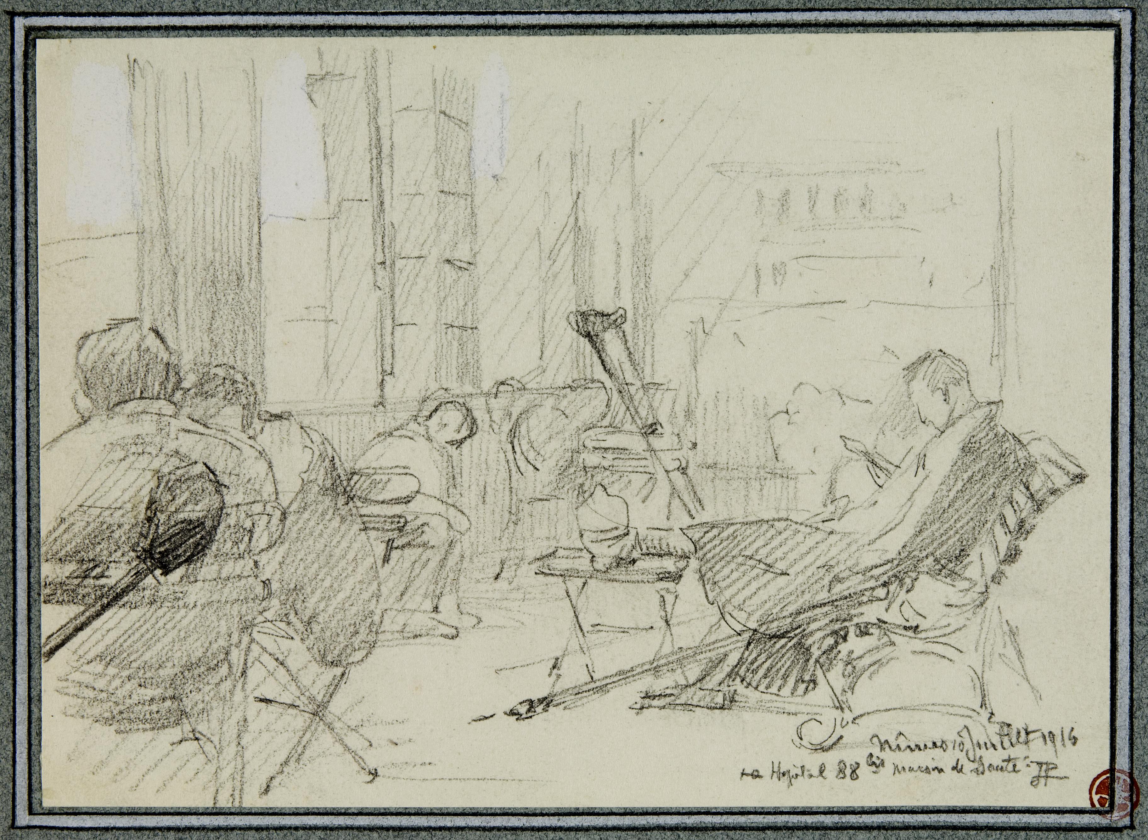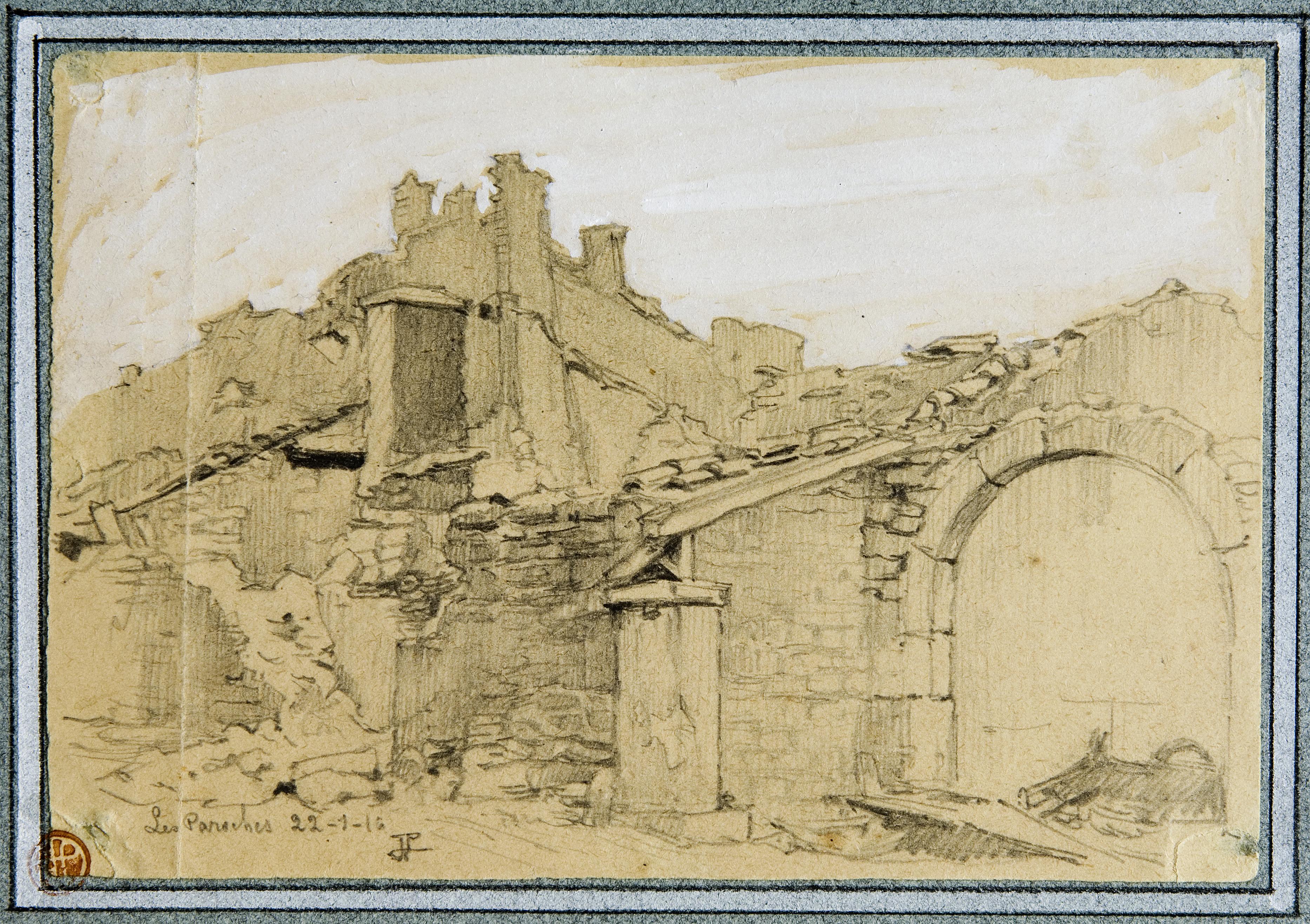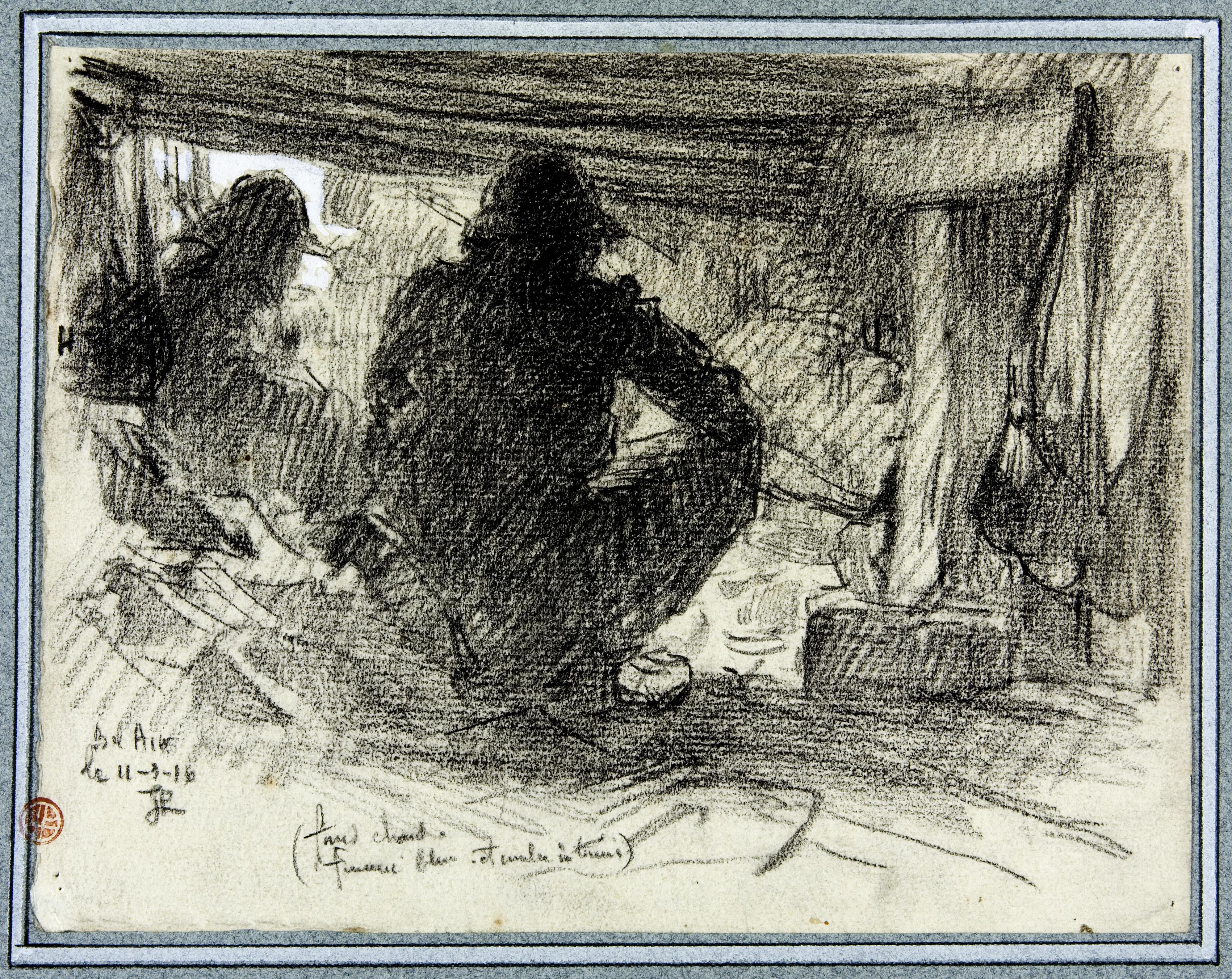 Âgé de 33 ans en 1914, l’artiste nantais Jules Ponceau, ancien élève de Louis Olivier Merson, Gervais et Clairin, récompensé quatre ans plus tôt au Salon des artistes français, pour son œuvre gravé, est incorporé au 106e régiment d’infanterie territoriale, régiment de réservistes. Il participe aux combats qui se déroulent dans la région de la Meuse, notamment dans le canton de Saint-Mihiel durant les deux premières années de la guerre. Blessé en 1916, il reste à l’hôpital plusieurs mois. Après la guerre, il réalise un album à partir des dessins et des croquis qu’il a faits sur le front, le dédiant à son fils, Yves, qu’il exhorte à lutter pour le maintien de la paix. Son œuvre montre toute l’horreur des combats.
