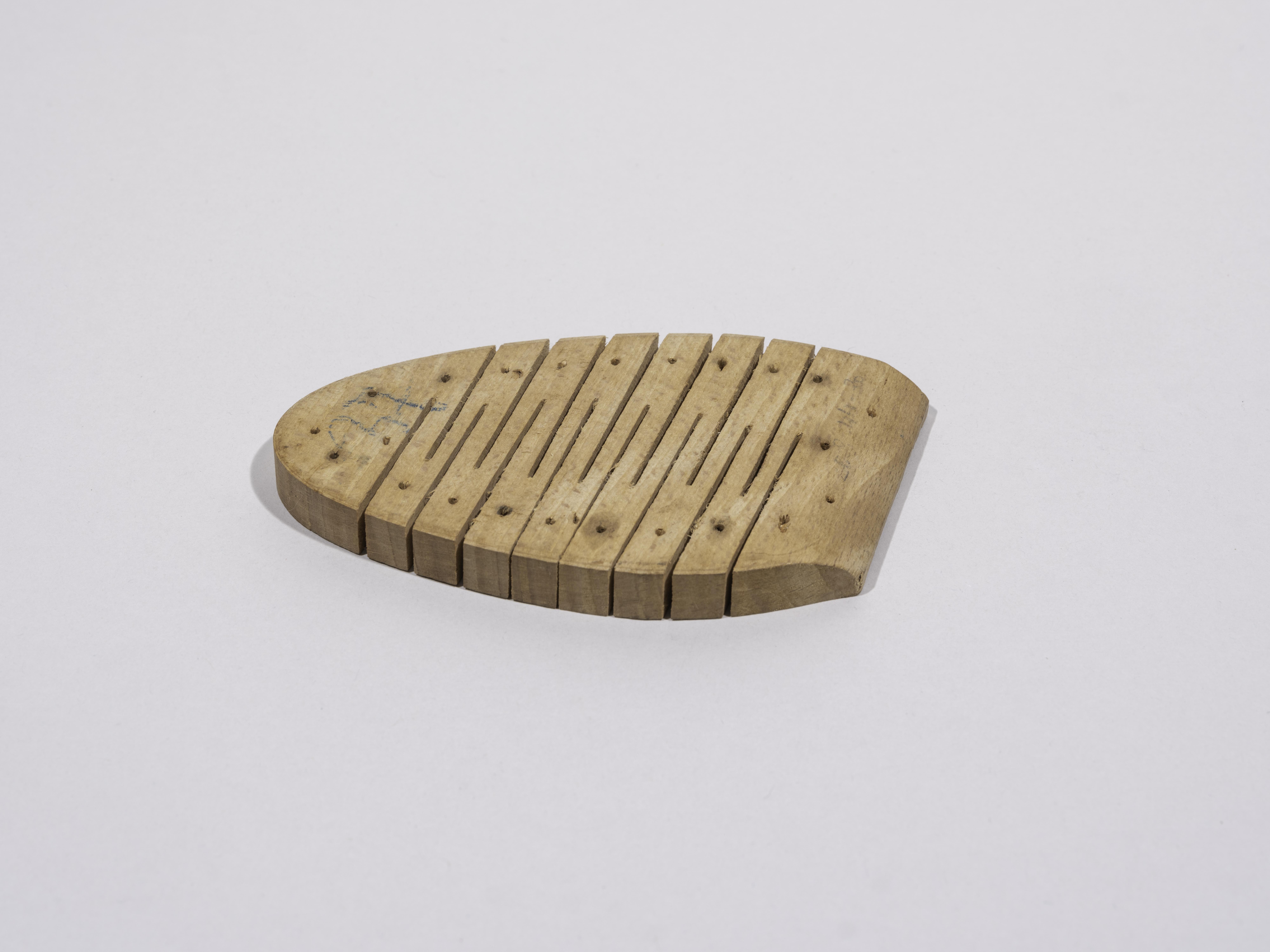 Cette semelle en bois a été réalisée à Nantes durant l’Occupation allemande. La pénurie de matériaux amène la population à recourir à des produits de substitution : le bois remplace le cuir des semelles des chaussures.