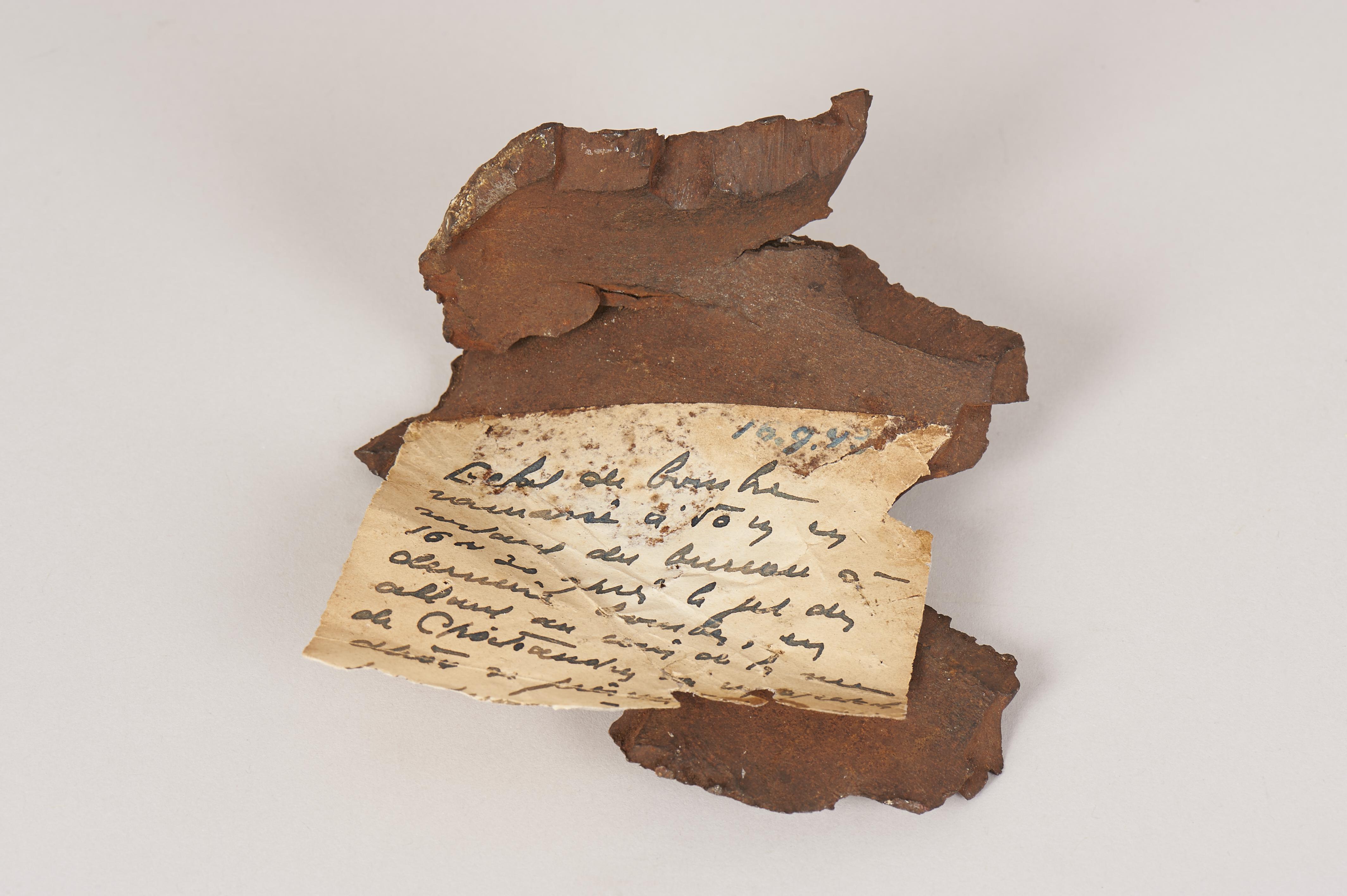Cet éclat de bombe a été ramassé à Nantes en septembre 1943. Il est accompagné d’une note manuscrite collée au revers, qui explique le contexte.
