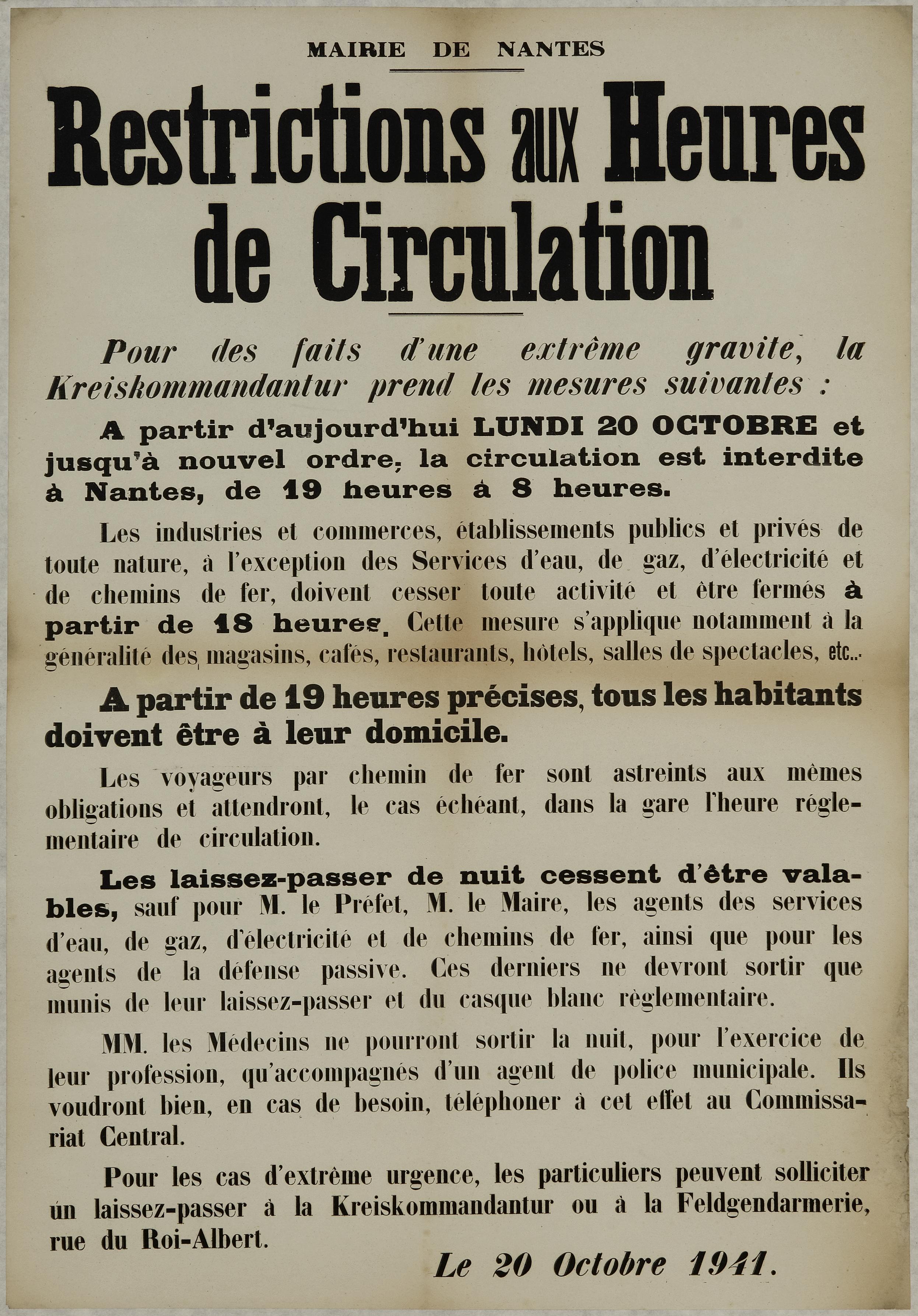 Il s’agit d’une affiche concernant les restrictions aux heures de circulation à partir du 20 octobre 1941.