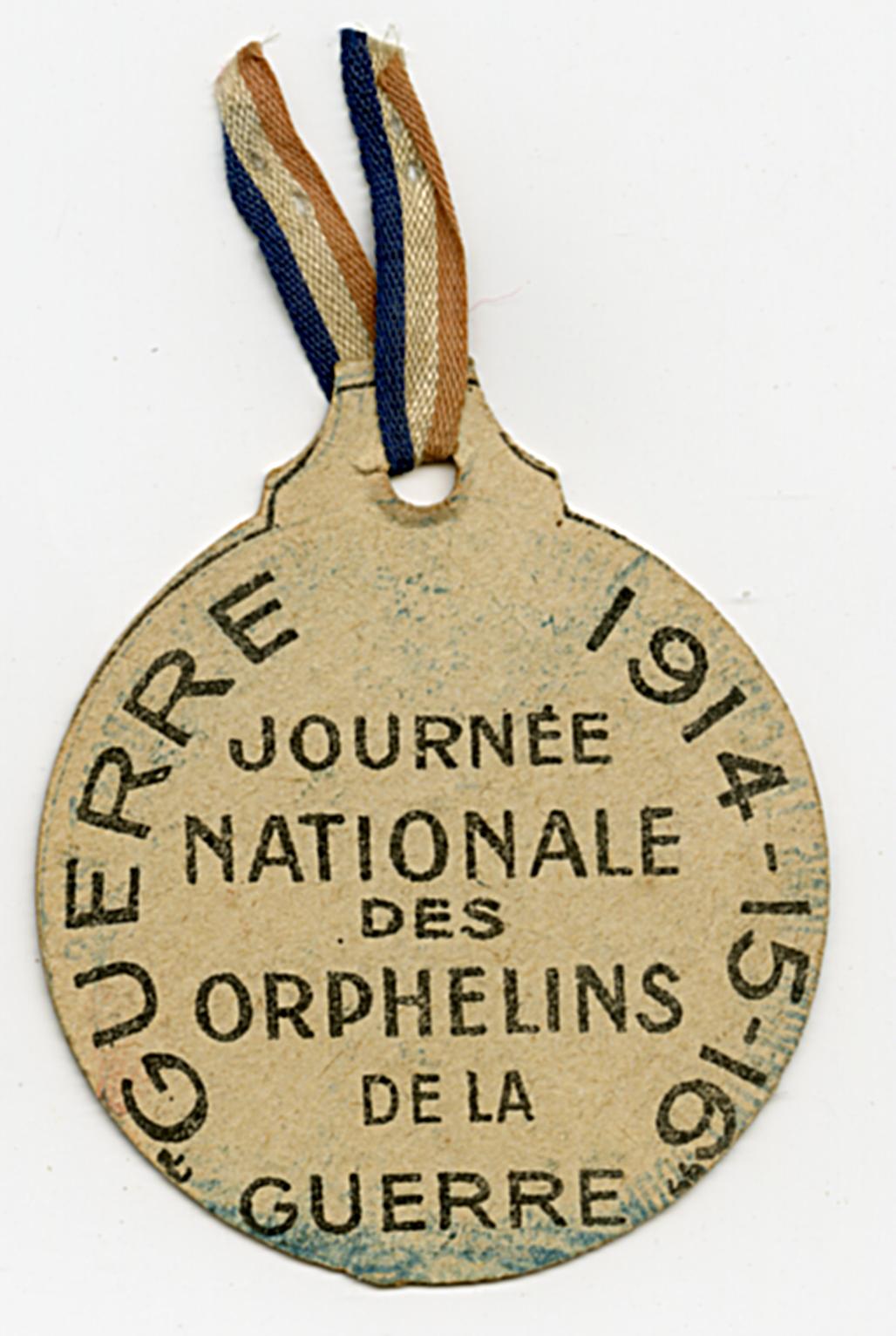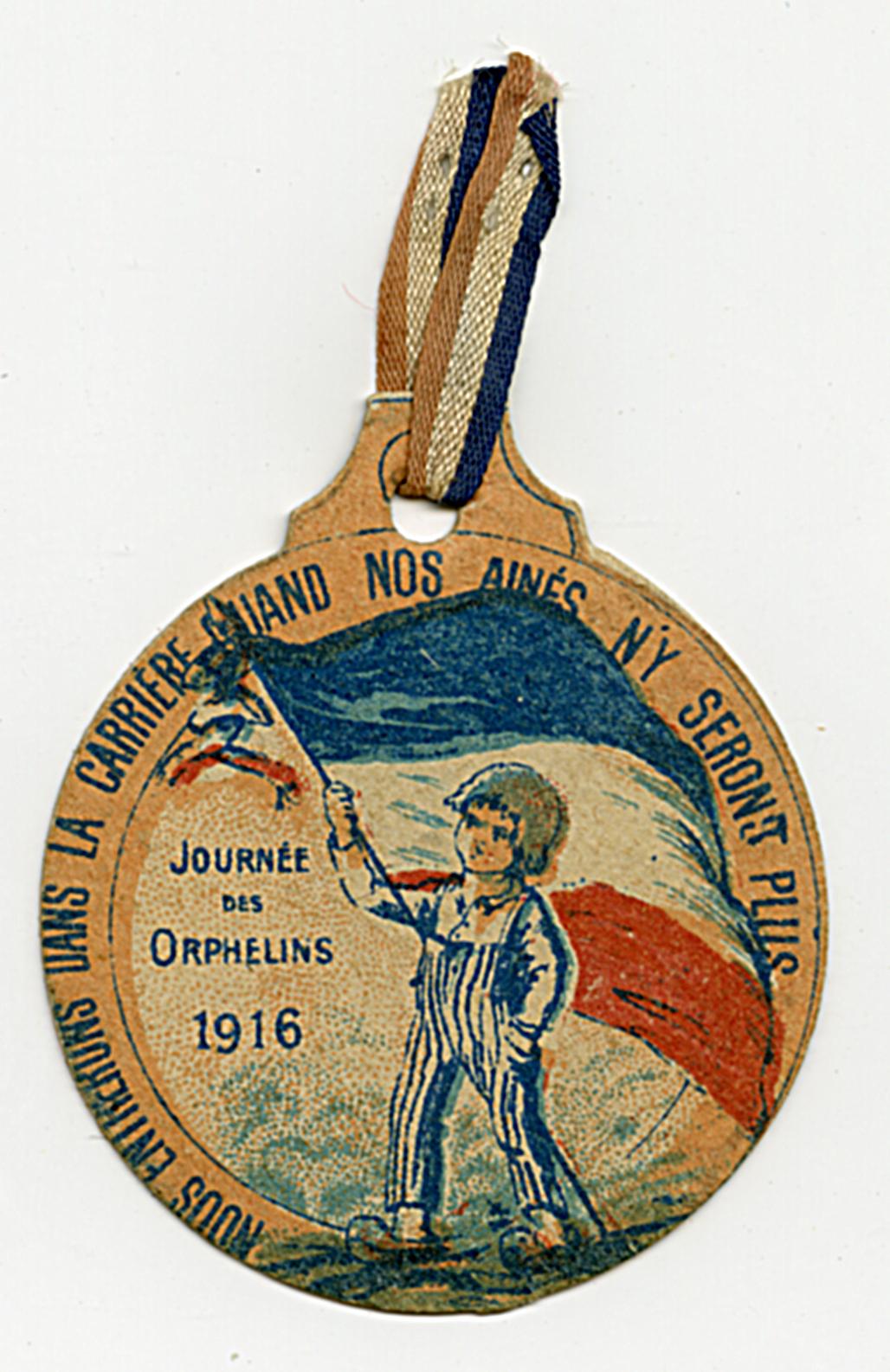 Il s’agit d’un insigne réalisé à l’occasion d’une campagne de quête organisée pour la « Journée des orphelins » les 1er et 2 novembre 1916.