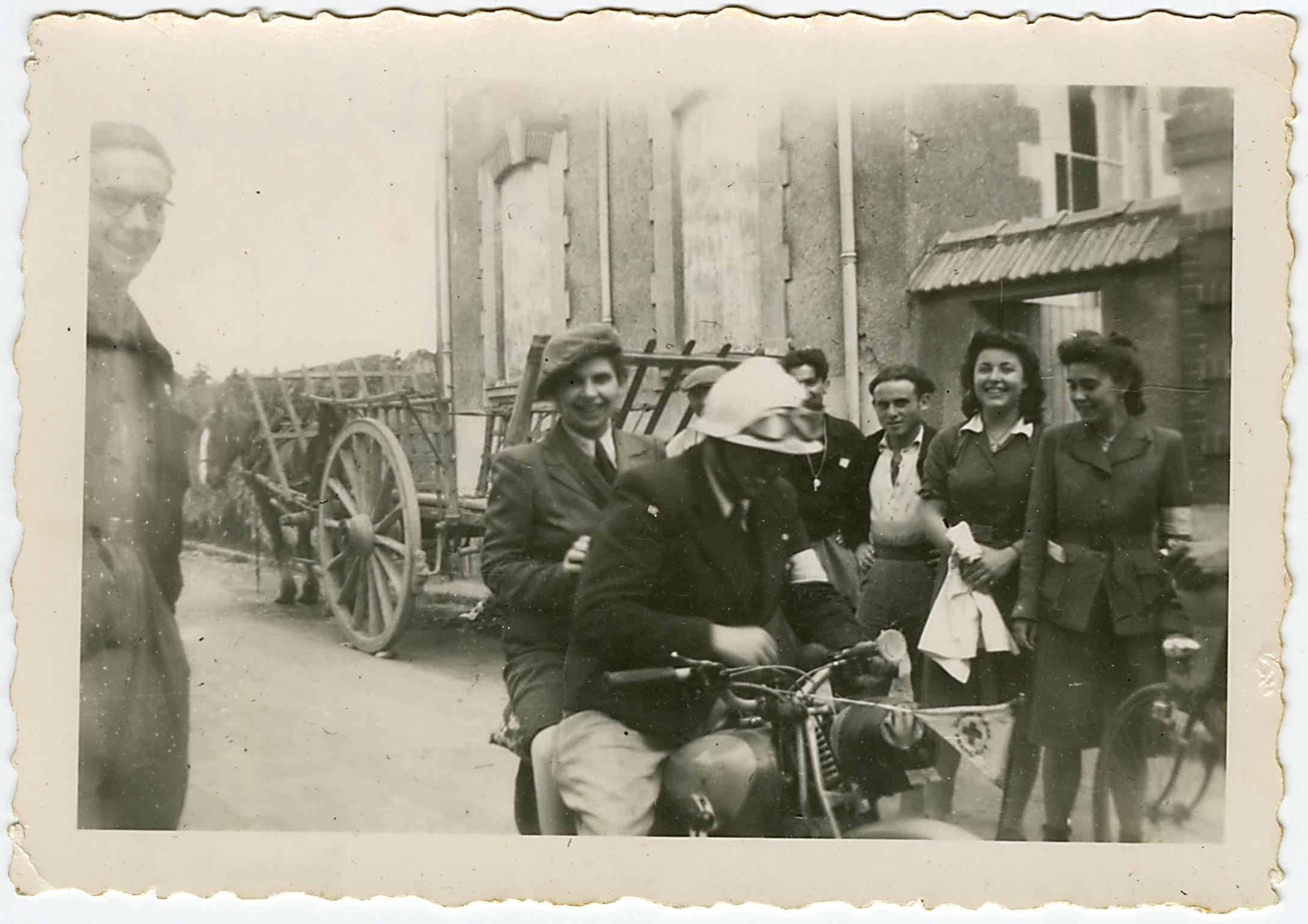 Cette photographie représente un homme et une femme à bord d’une moto décorée d’un fanion de la Croix-Rouge française, entourés d’un groupe de personnes. Il s’agit de la visite des responsables de la Croix-Rouge française à bord d’une moto au poste de Saint-Sébastien, en 1943.