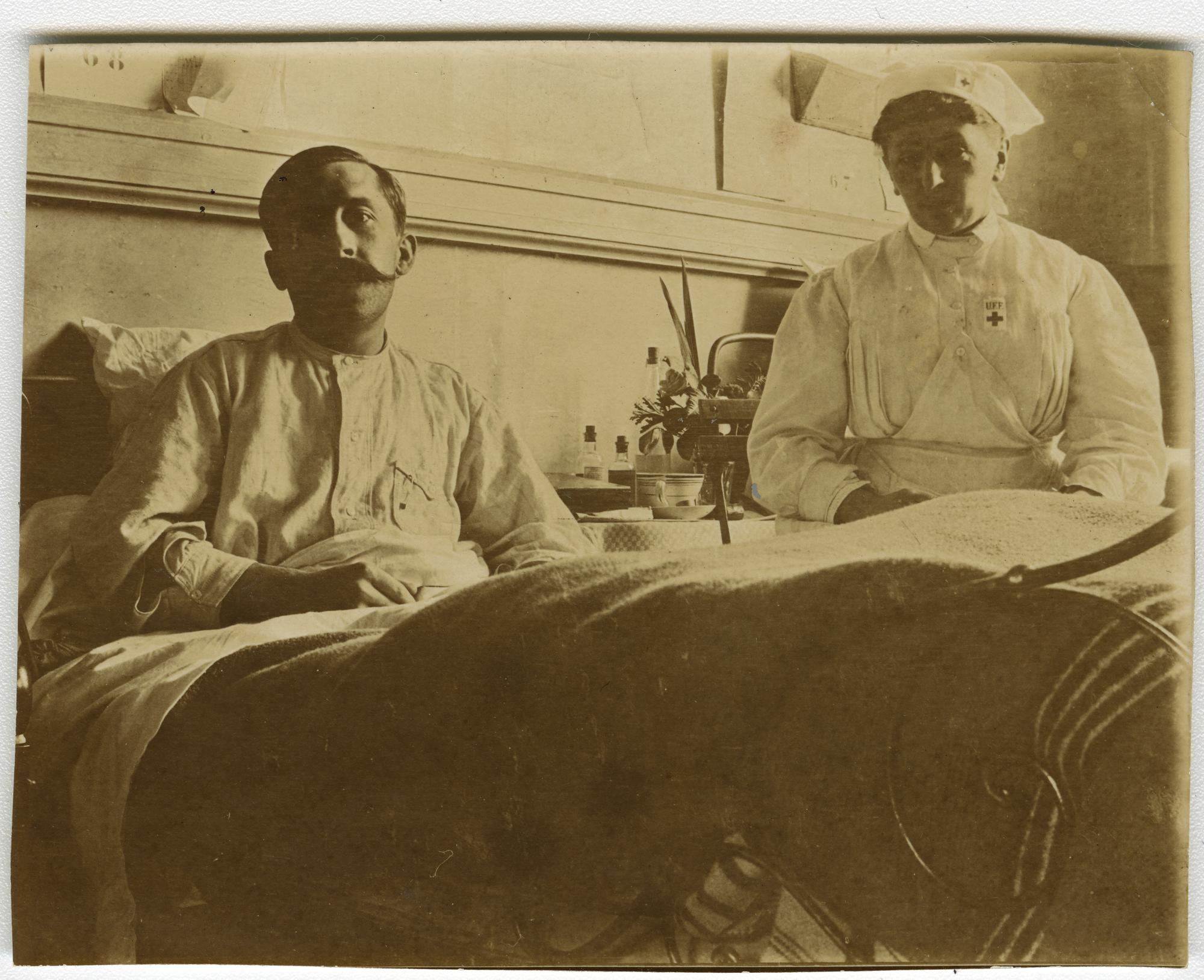 La place des femmes dans la guerre est souvent associée aux rôles qu’elles tinrent dans les entreprises, en remplacement des hommes. Pourtant, innombrables sont les images où on les voit aux côtés des malades et des mourants, apportant les premiers soins. Certaines sont juste derrière les lignes des champs de bataille, mais la plupart demeurent à l’arrière, dans les villes qui accueillent les blessés pour des soins plus longs et de la rééducation. C’est le cas de Nantes. Si les images semblent apaisées par la présence de ces figures féminines, elles ne parviennent pas à occulter l’extraordinaire brutalité de la guerre.