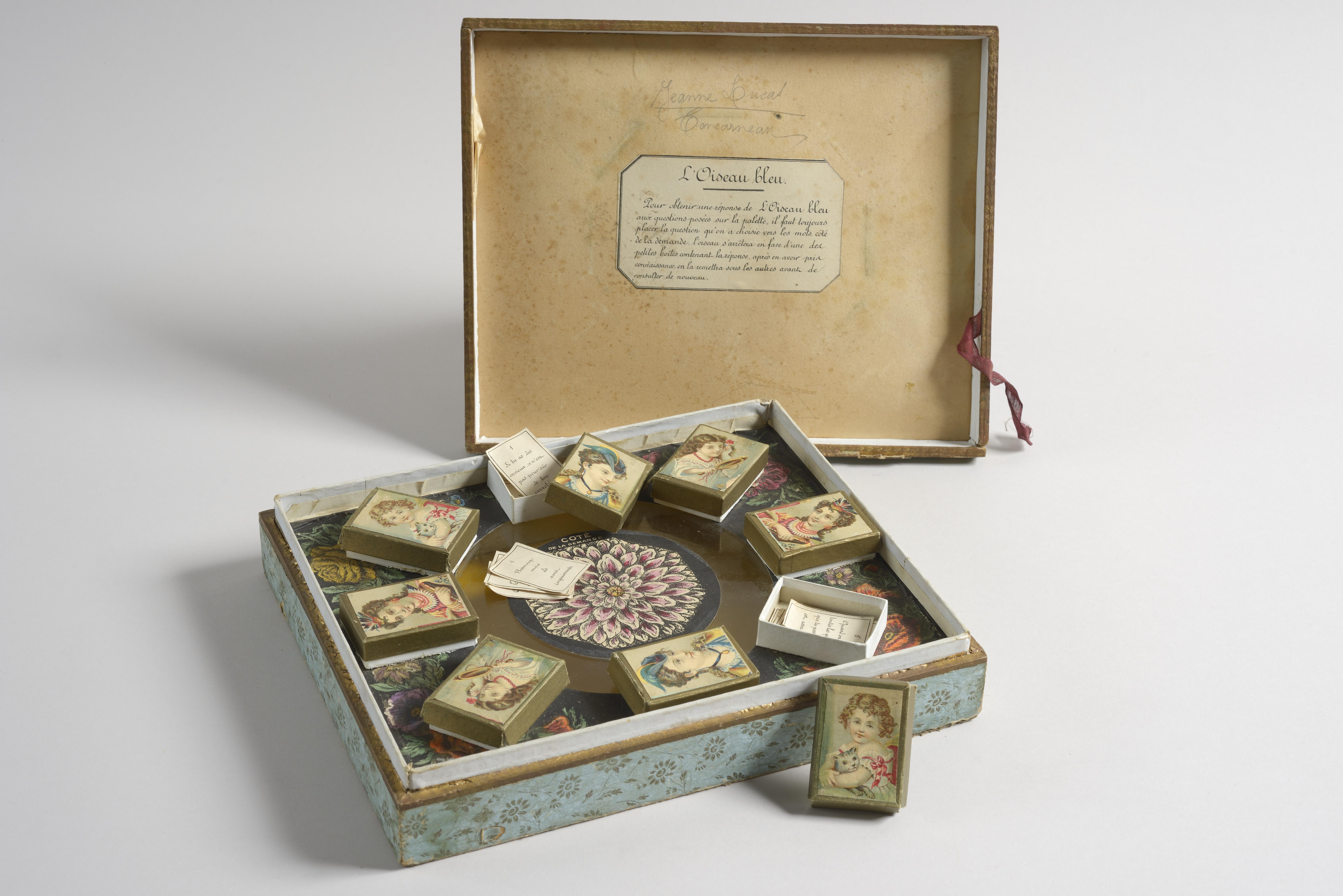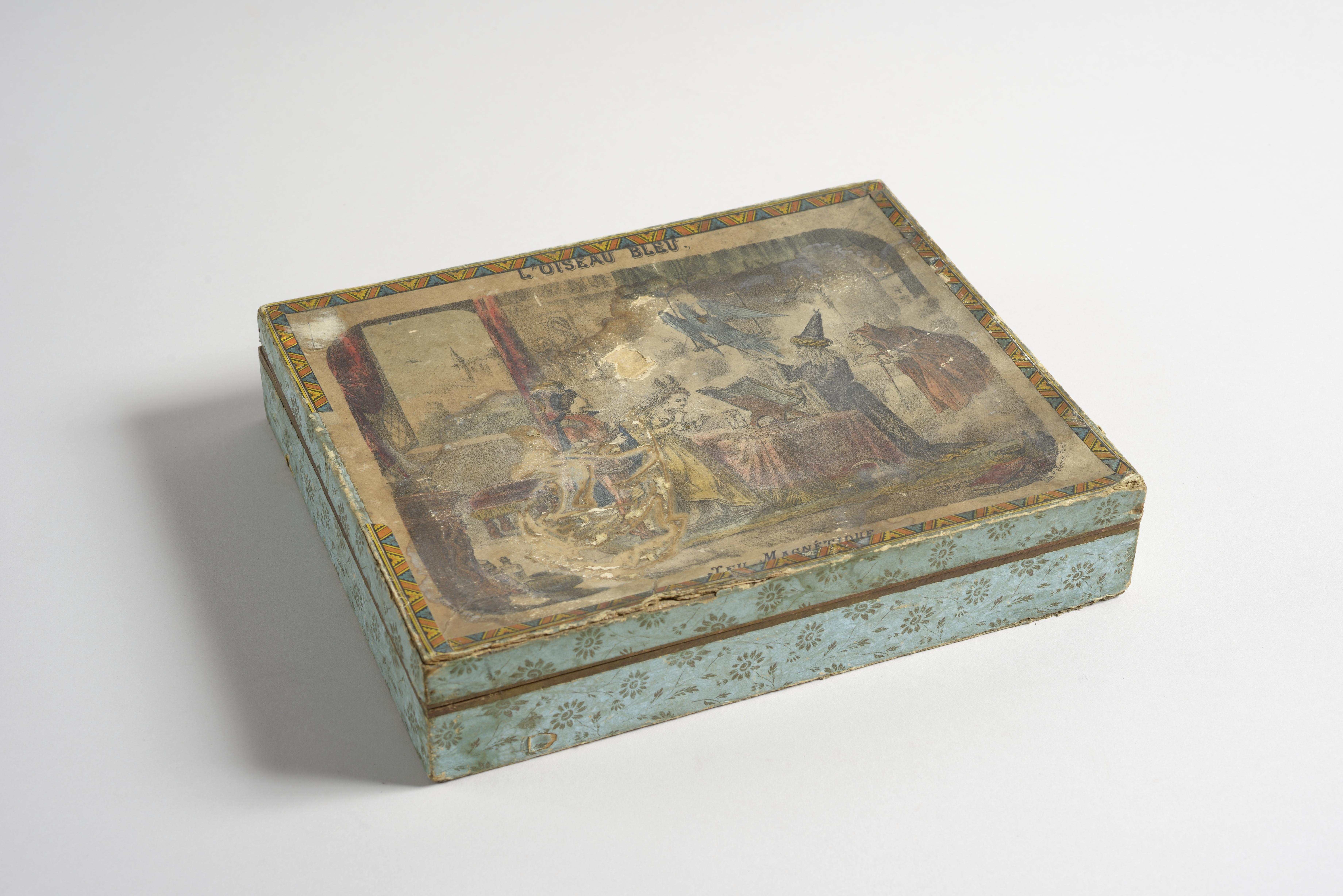 Sur le couvercle de la boîte sont représentés un couple en costume, un magicien et une sorcière, dans un cabinet de magie ou d’alchimie. Par la fenêtre, on aperçoit un château.