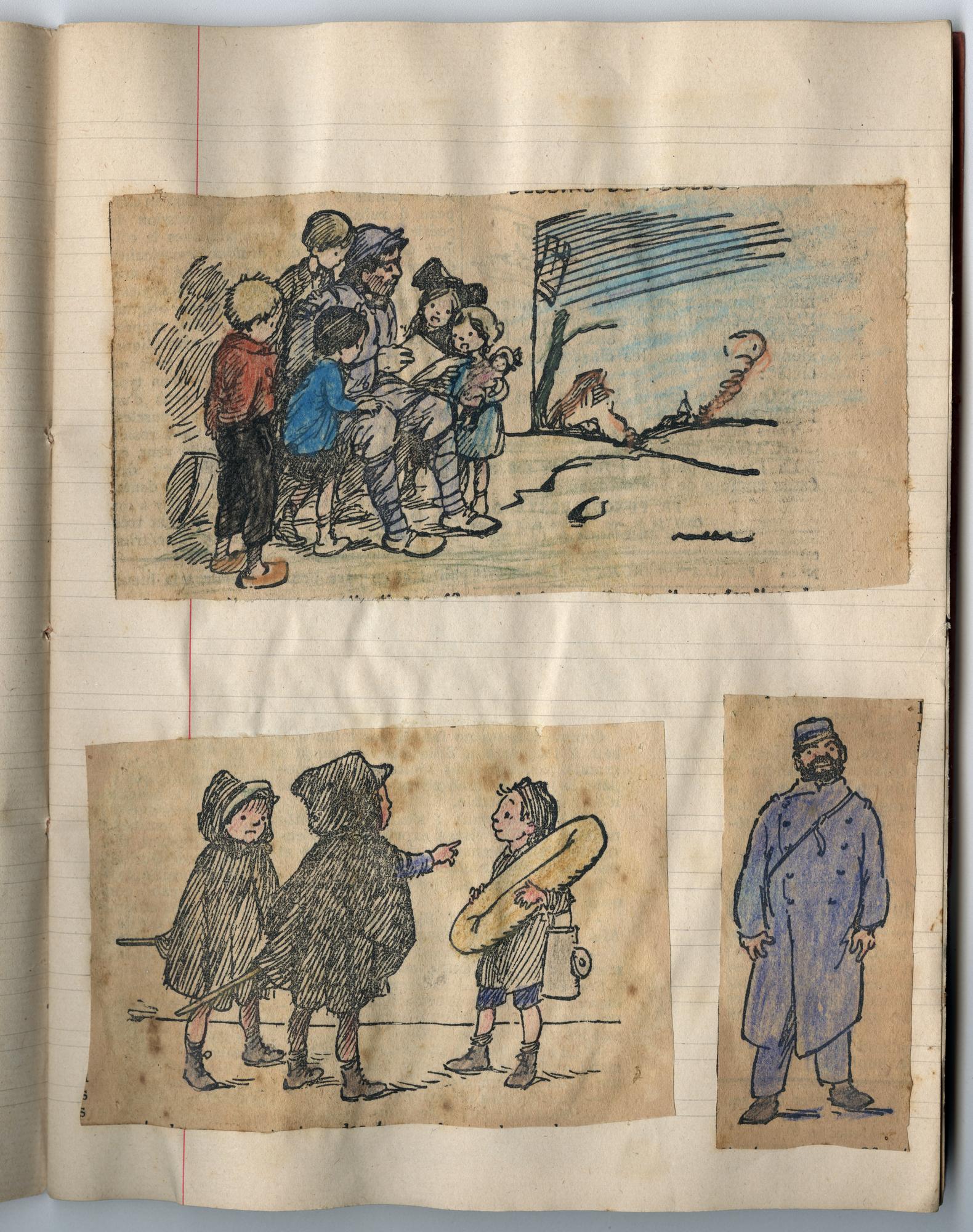 Il s’agit de dessins de Francisque Poulbot en rapport avec la Première Guerre mondiale, découpés dans des journaux par deux enfants , Simone Guérin et son frère, et collés dans un cahier afin de former un cahier de coloriage.