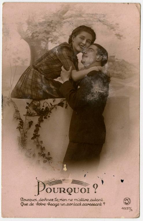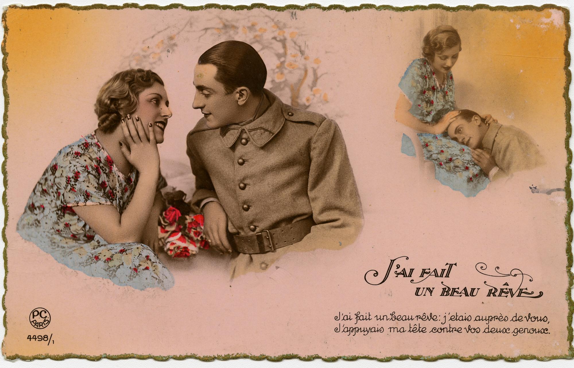 Cette carte postale a été envoyée par Lucien Pinault à sa fiancée, Amélie, le 19 avril 1940. Lucien Pinault rejoint, en juillet 1939, le 160e régiment d’infanterie de forteresse dont la mission consiste, comme les quarante autres unités du même type, à protéger les fortifications de la ligne Maginot, ligne défensive qui court des frontières de la Suisse à celles du Luxembourg. Au moment de la déclaration de guerre, il y est donc déjà affecté. Sa correspondance amoureuse avec sa fiancée, Amélie, témoigne de ce que sont les débuts de l’affrontement : un entre-deux fait d’attente, d’inaction et d’espoir.
