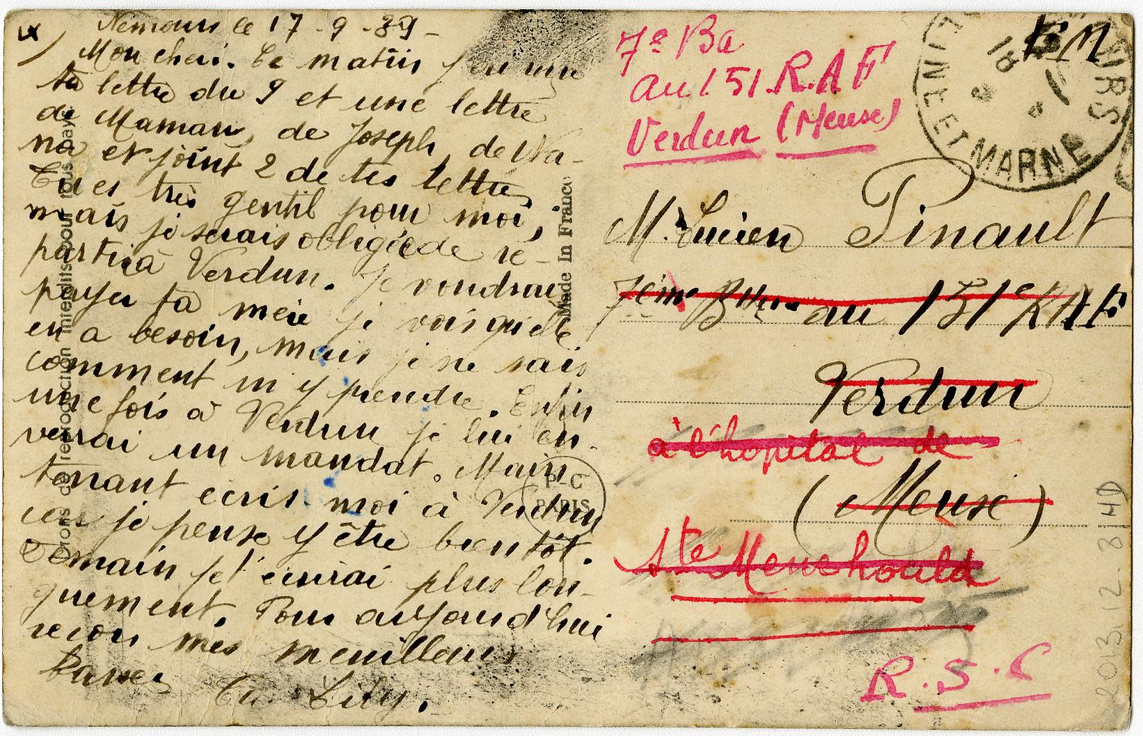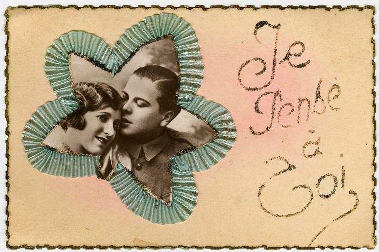 Cette carte postale porte sur son une correspondance amoureuse de Lucien Pinault – »Lulu » -à sa fiancée Amélie – »Lily ».