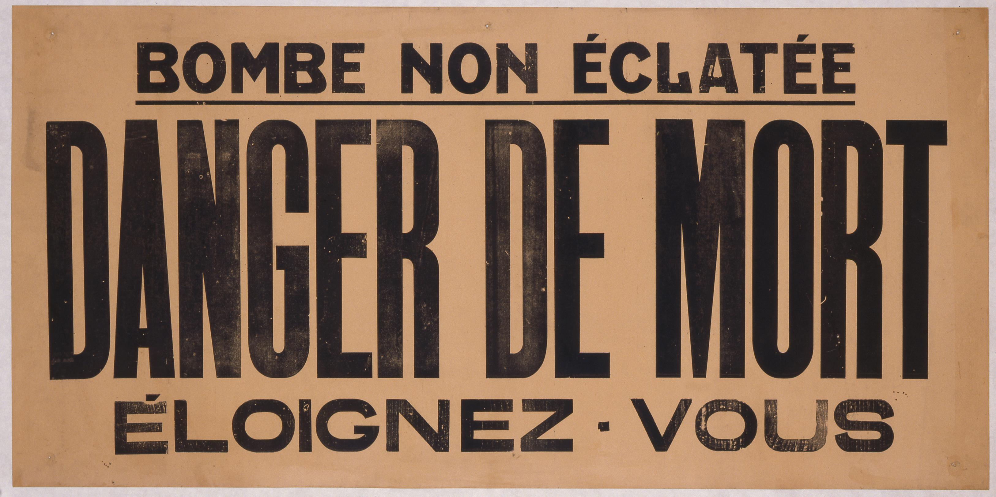Cette affiche a probablement été placardée dans les rues de Nantes suite à un bombardement aérien, afin de signaler un danger d’explosion à proximité.