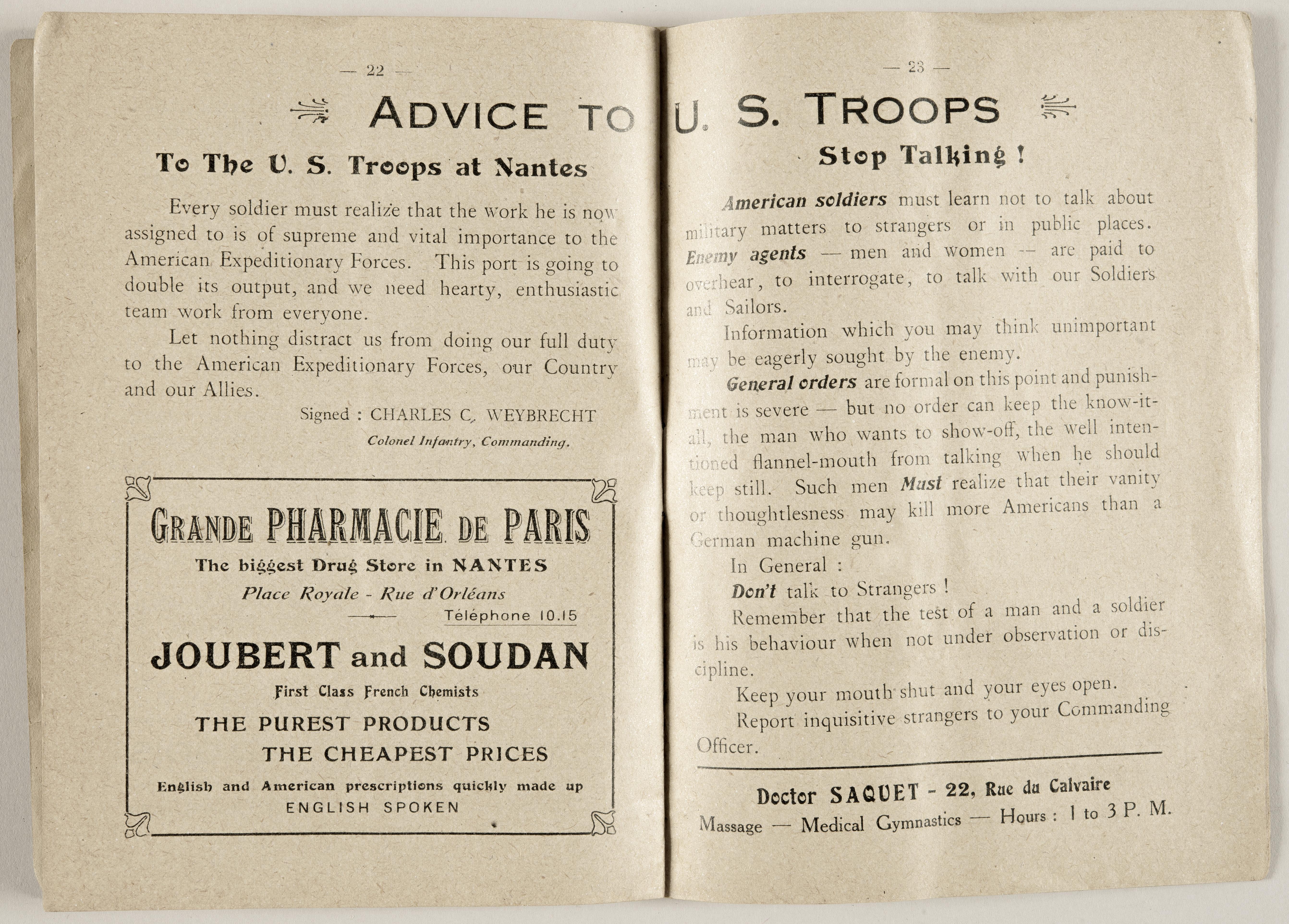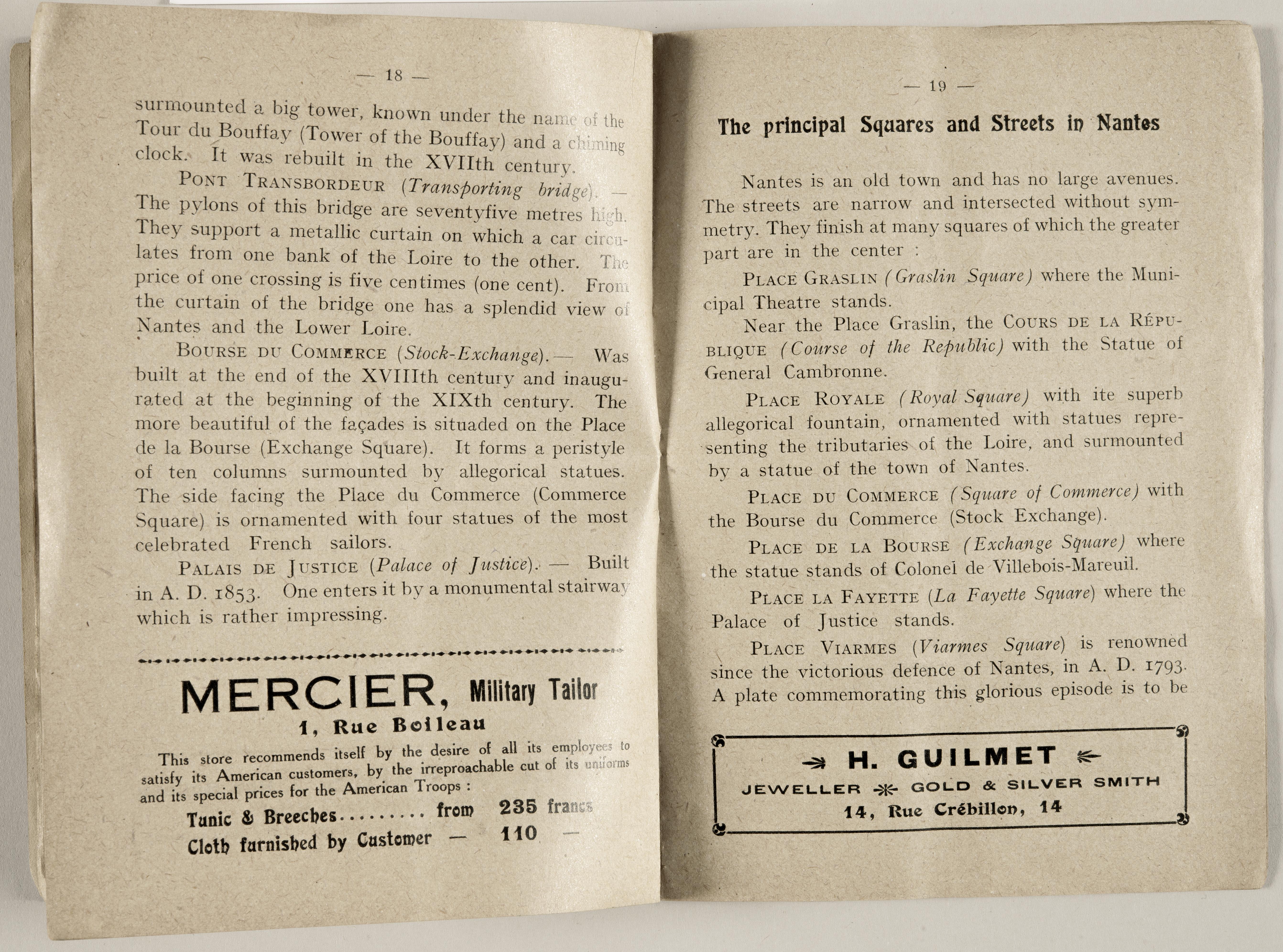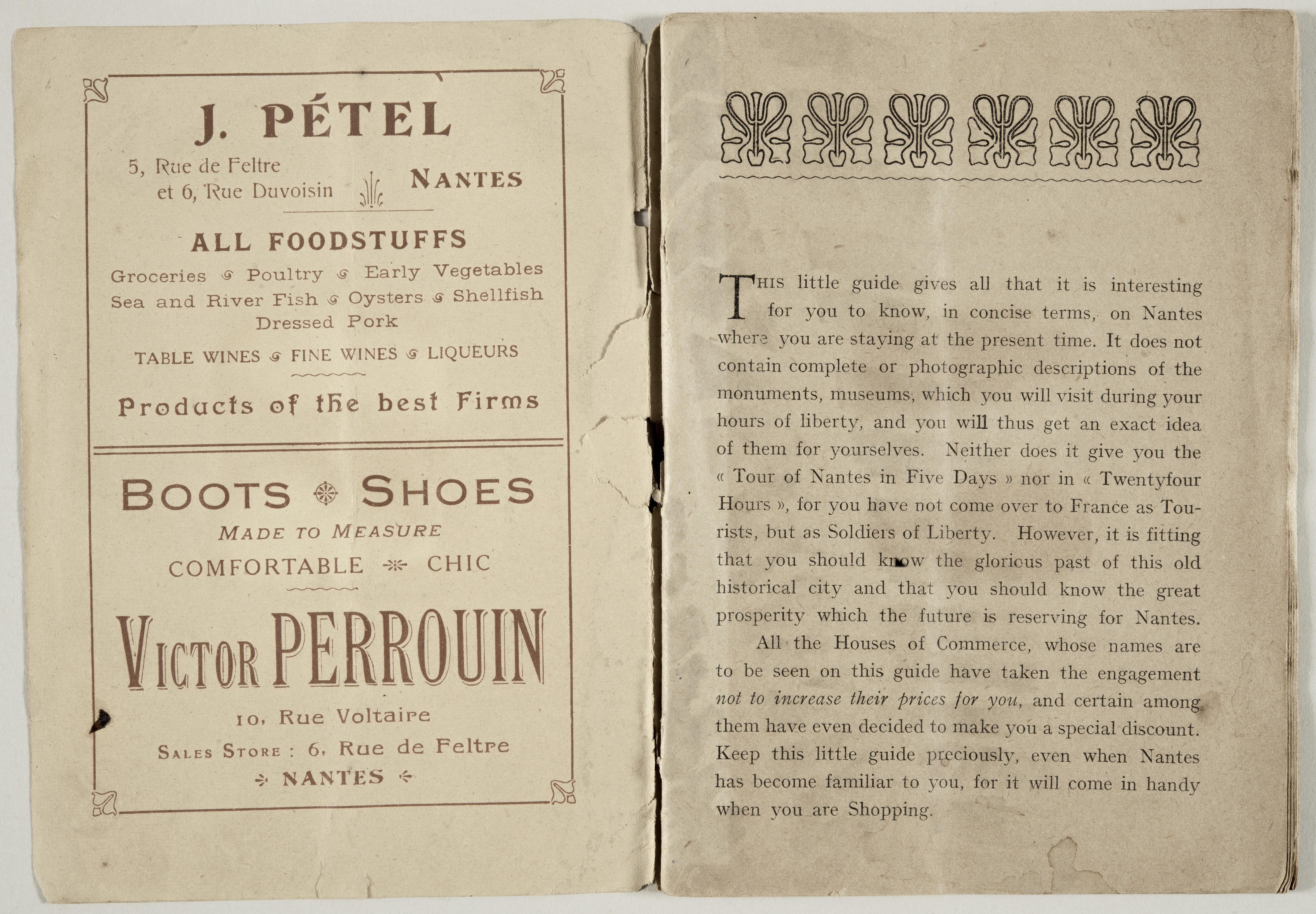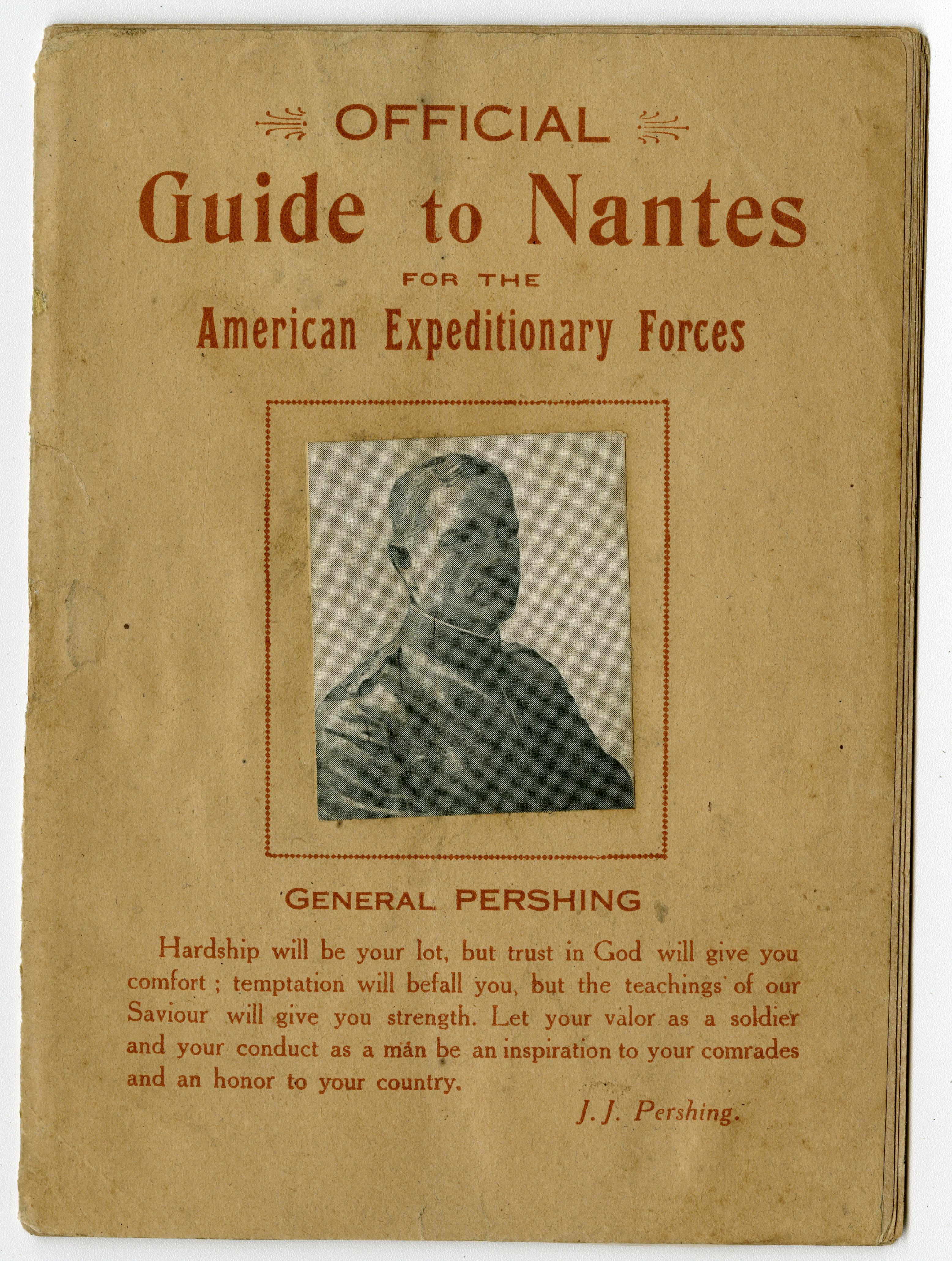 Le général des armées des États-Unis John Pershing accompagne le corps expéditionnaire américain à Saint-Nazaire en juin 1917. Ce guide, où il s’adresse aux recrues nouvellement arrivées, est destiné à aider les jeunes soldats américains dans leur découverte de l’estuaire. Il précise cependant, dès la première page : « vous n’êtes pas venus en France en tant que touristes mais comme soldats de la Liberté ». Plus loin, il précise : « Toutes les maisons de commerce dont les noms figurent dans ce guide ont pris l’engagement de ne pas augmenter leurs prix pour vous, et certaines ont même décidé de vous proposer un prix plus avantageux. » Les dernières pages comportent des avertissements, la méfiance à l’encontre de l’espion et plus encore de l’espionne étant de rigueur : « ne parlez pas aux étrangers […] gardez votre bouche fermée et vos yeux ouverts ».