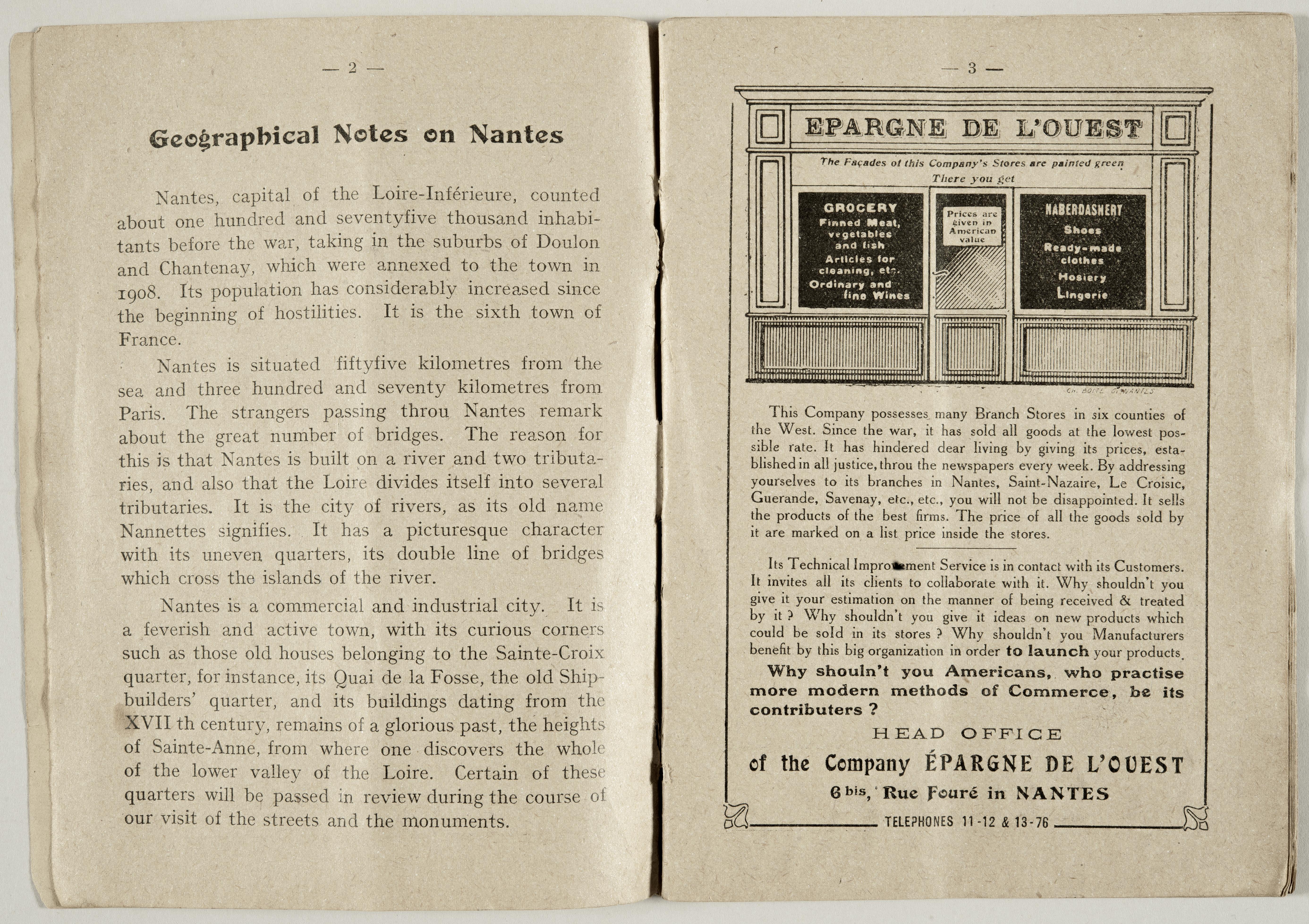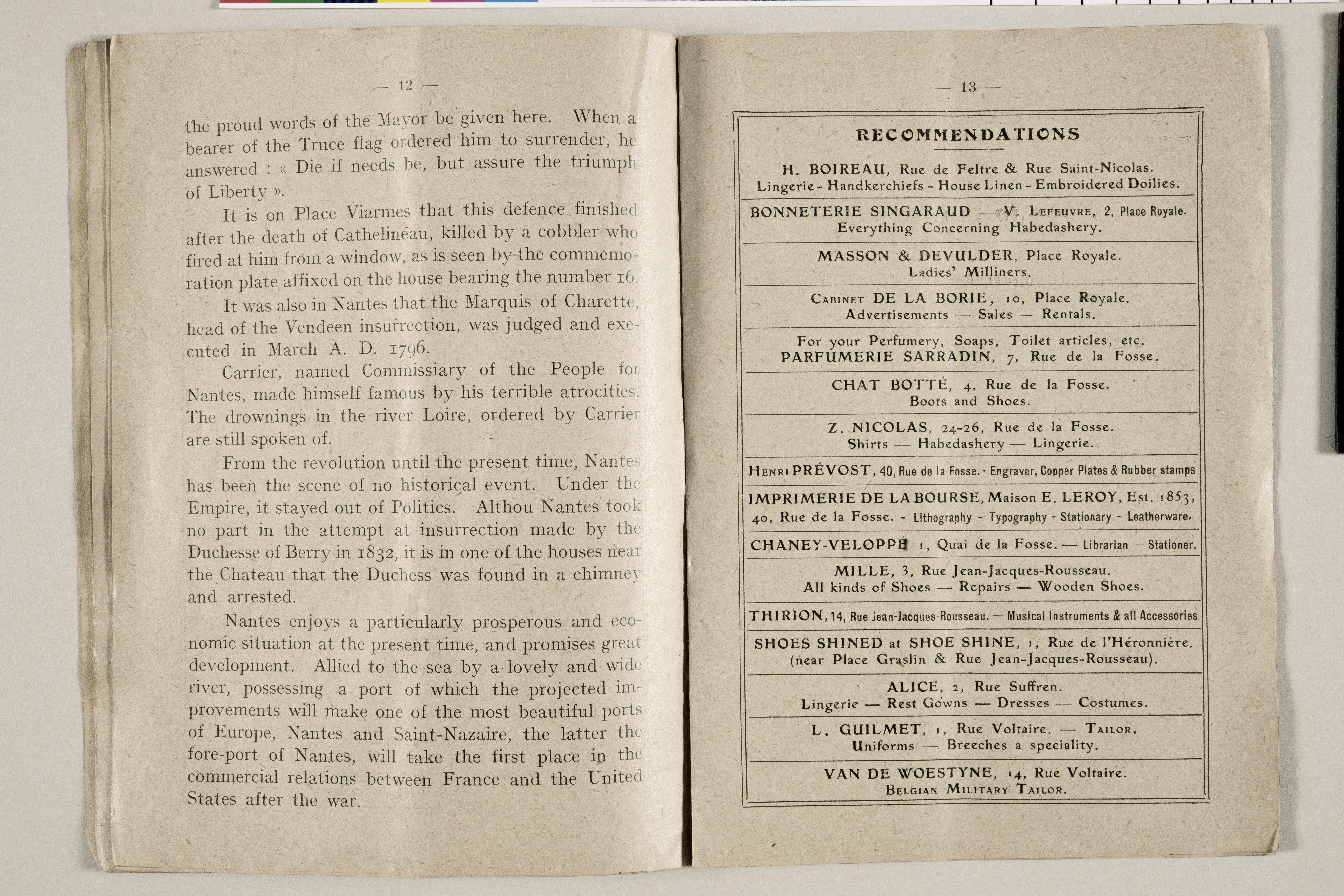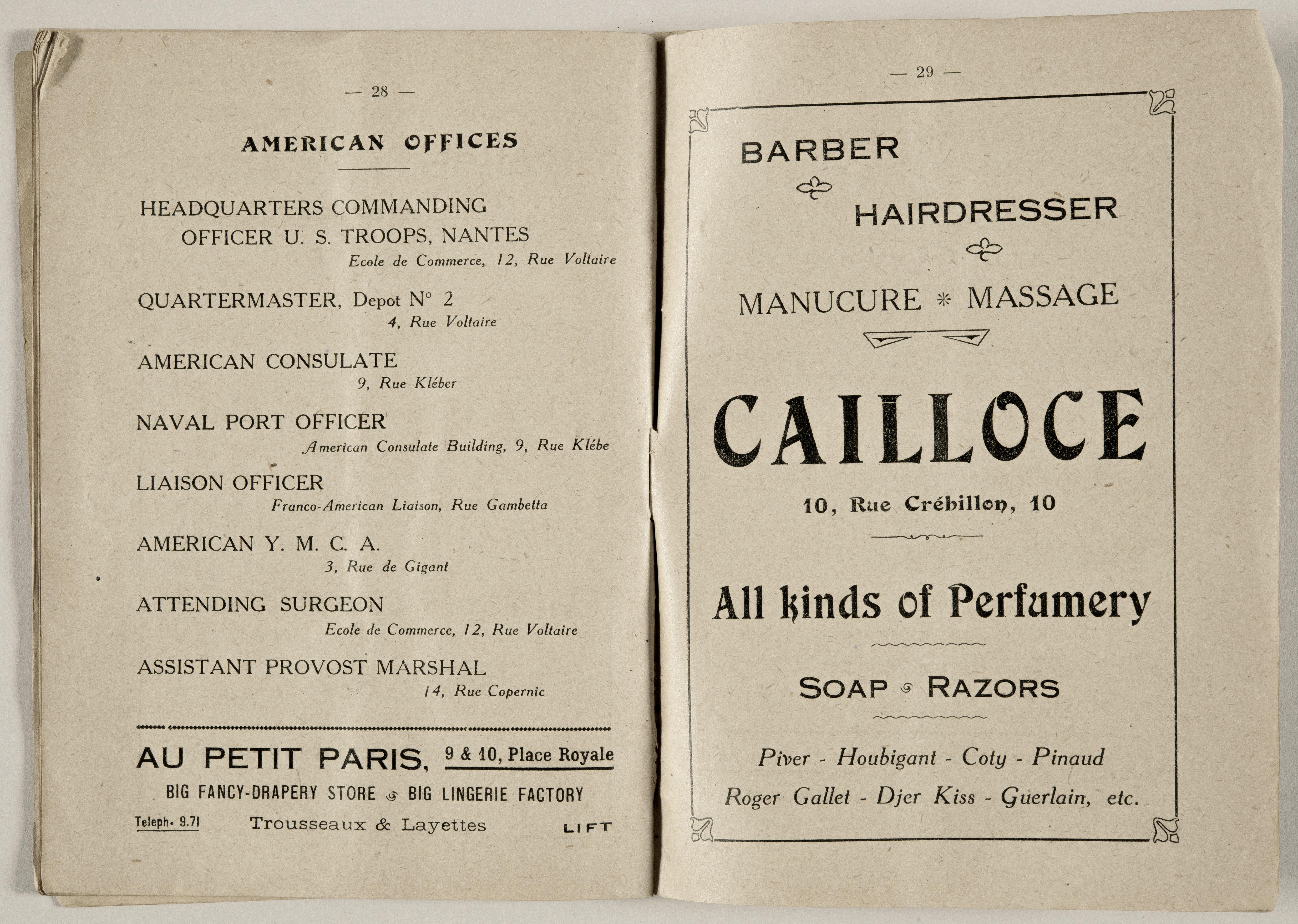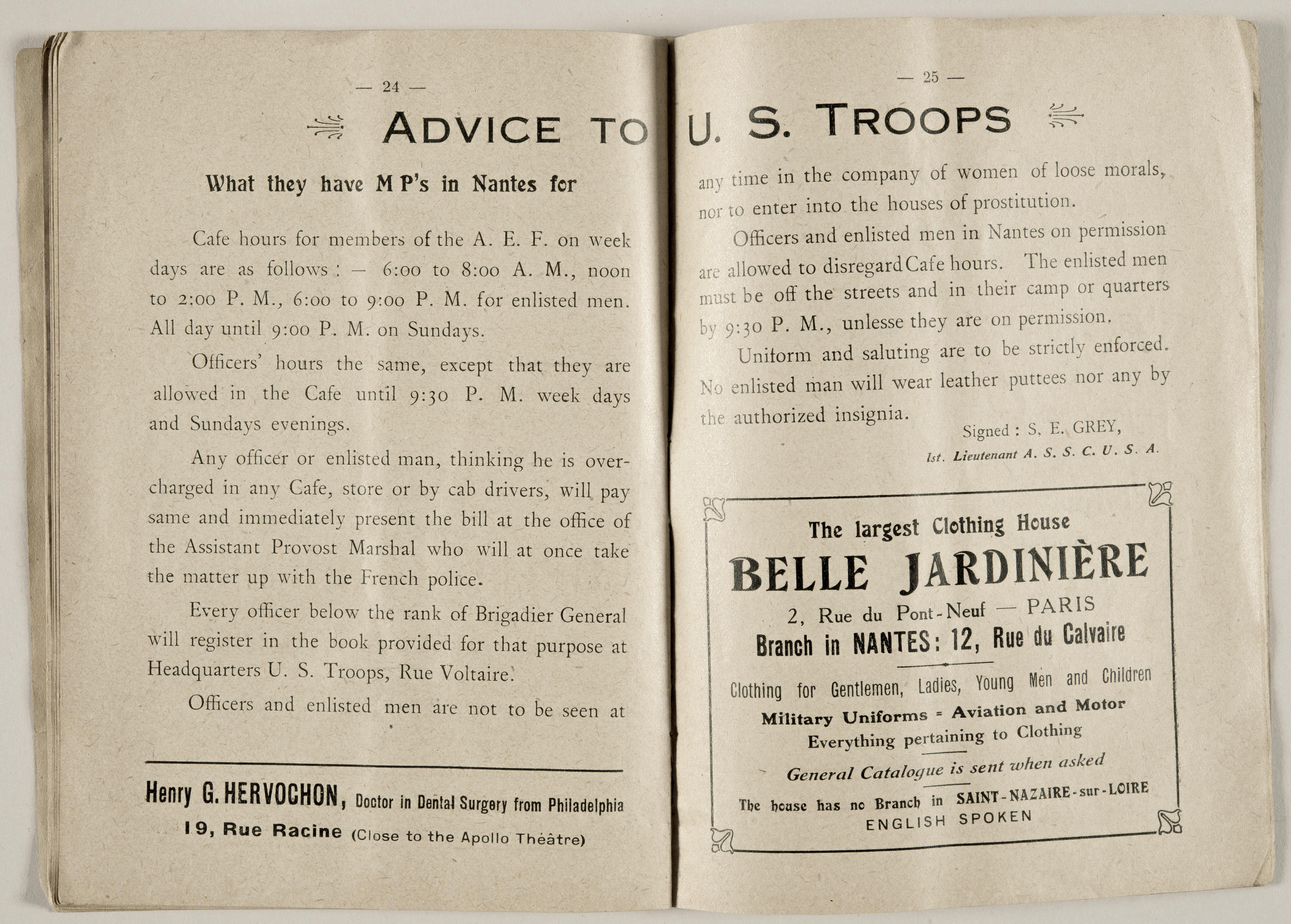 Le général des armées des États-Unis John Pershing accompagne le corps expéditionnaire américain à Saint-Nazaire en juin 1917. Ce guide, où il s’adresse aux recrues nouvellement arrivées, est destiné à aider les jeunes soldats américains dans leur découverte de l’estuaire. Il précise cependant, dès la première page : « vous n’êtes pas venus en France en tant que touristes mais comme soldats de la Liberté ». Plus loin, il précise : « Toutes les maisons de commerce dont les noms figurent dans ce guide ont pris l’engagement de ne pas augmenter leurs prix pour vous, et certaines ont même décidé de vous proposer un prix plus avantageux. » Les dernières pages comportent des avertissements, la méfiance à l’encontre de l’espion et plus encore de l’espionne étant de rigueur : « ne parlez pas aux étrangers […] gardez votre bouche fermée et vos yeux ouverts ».
