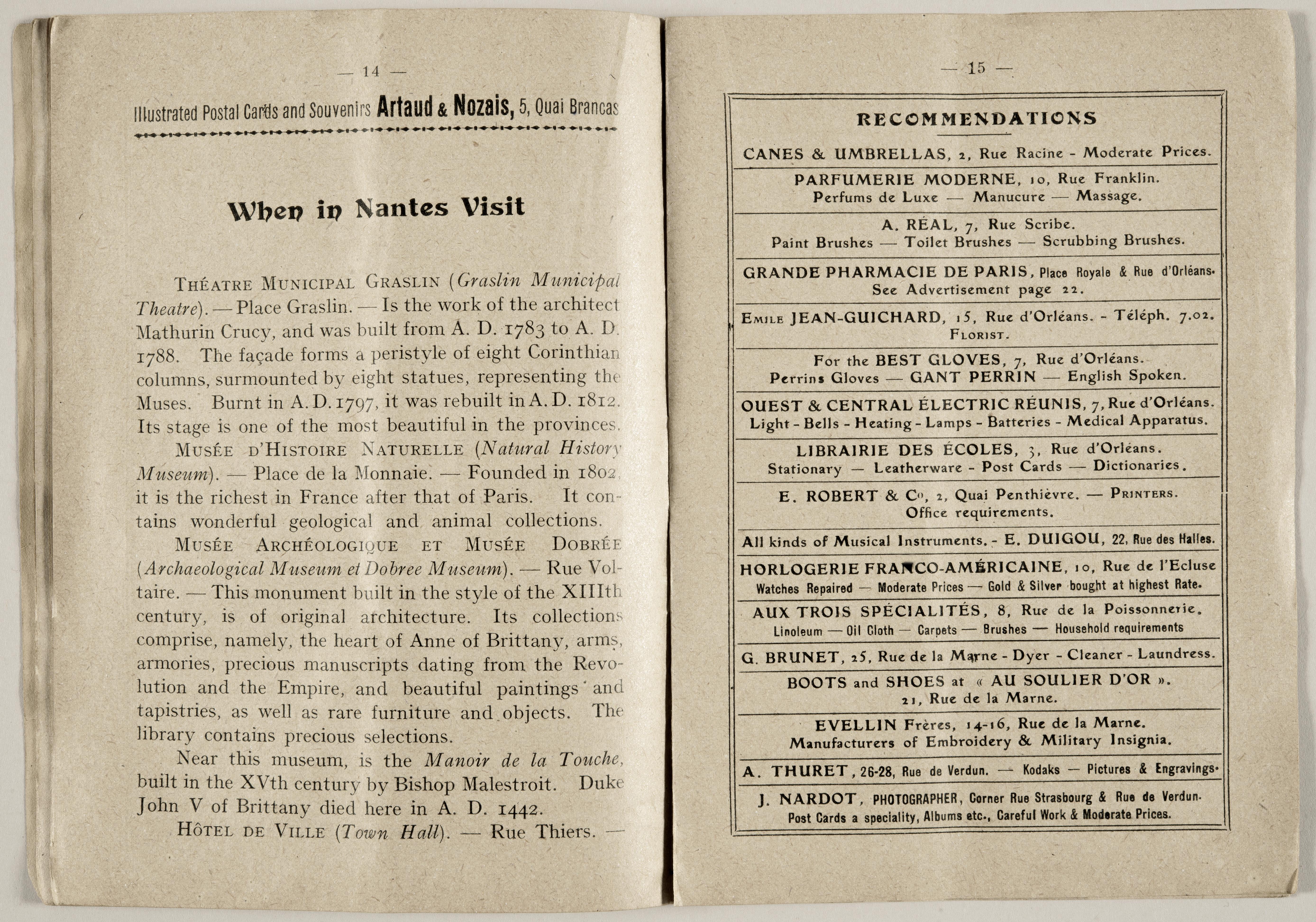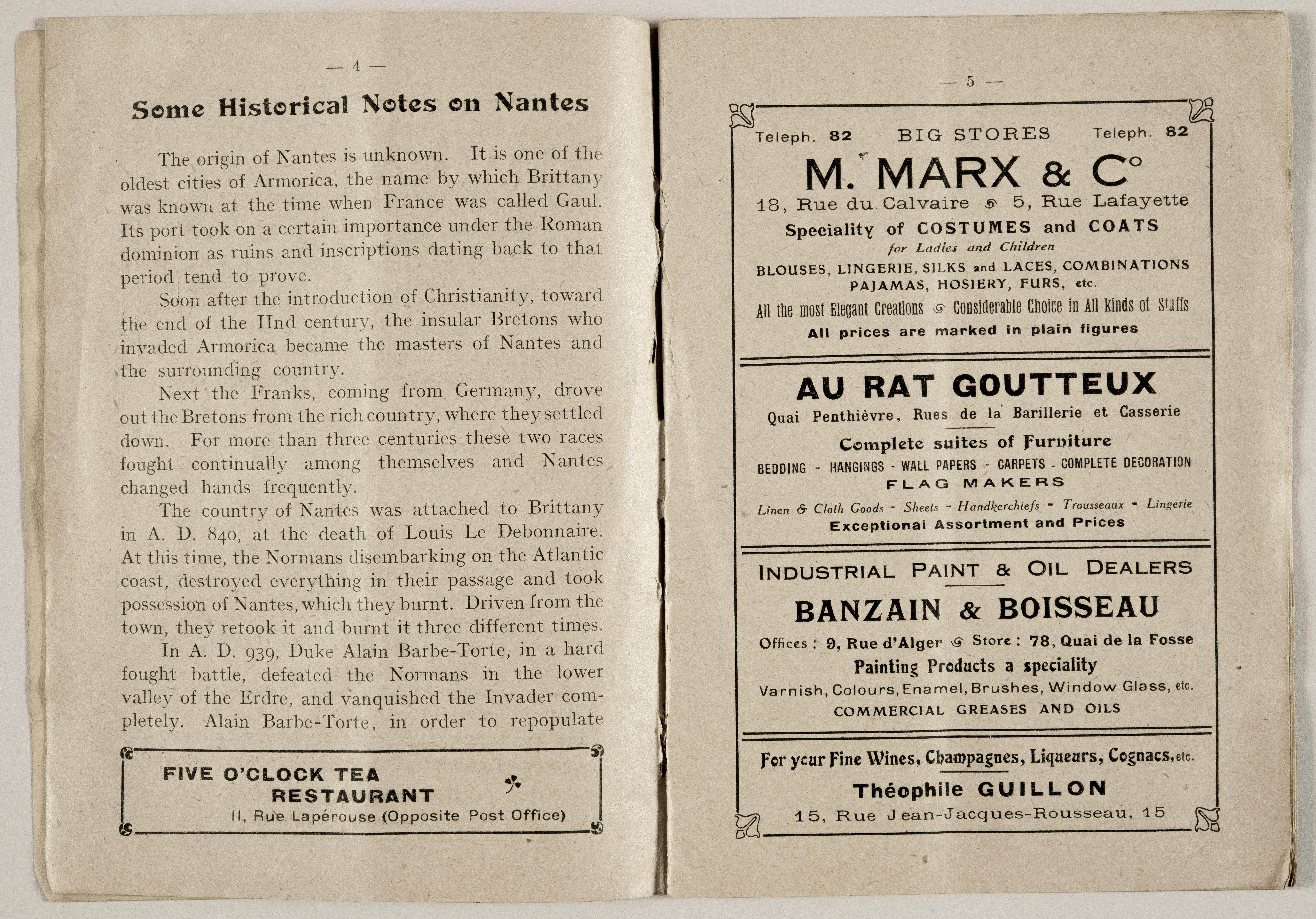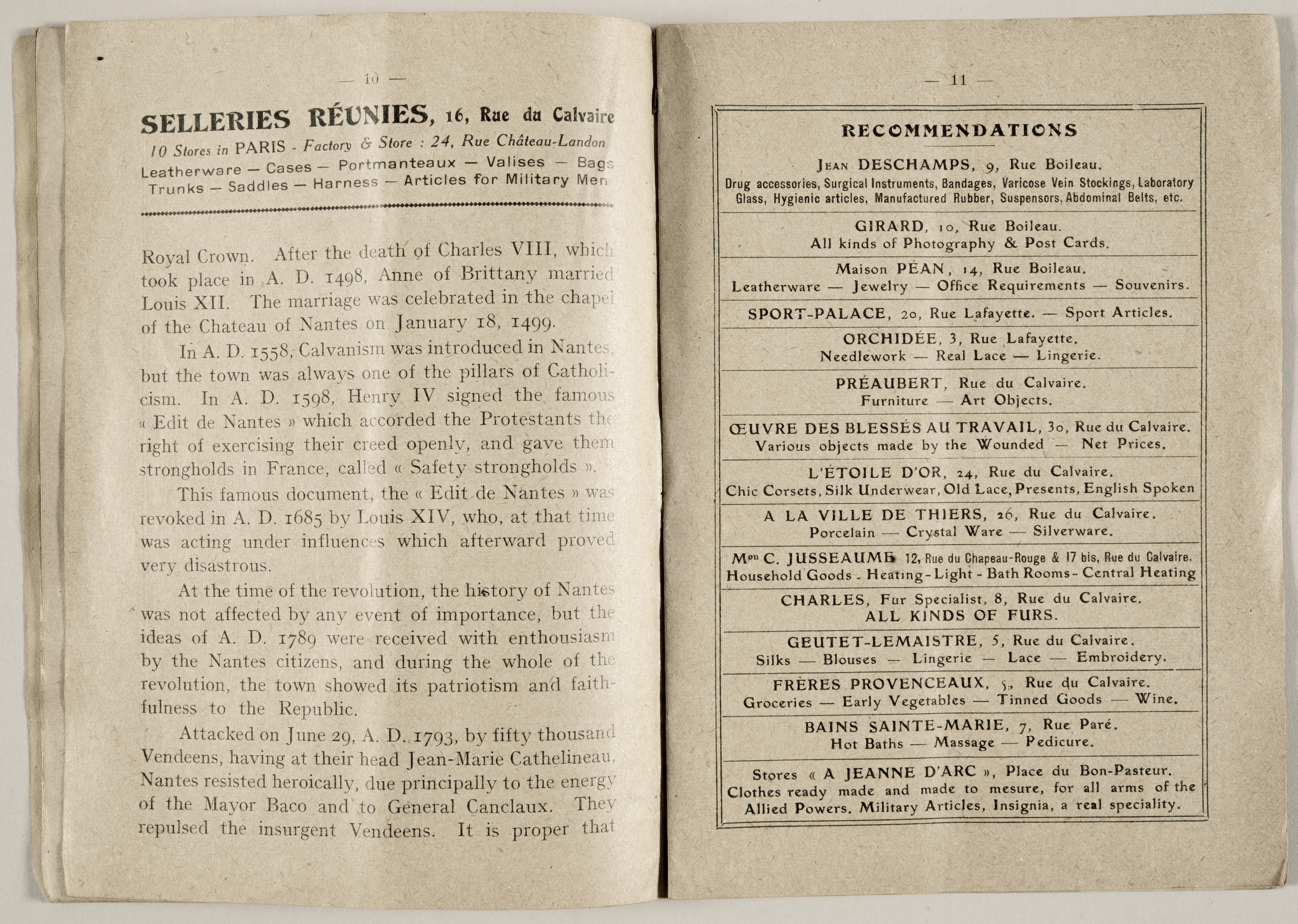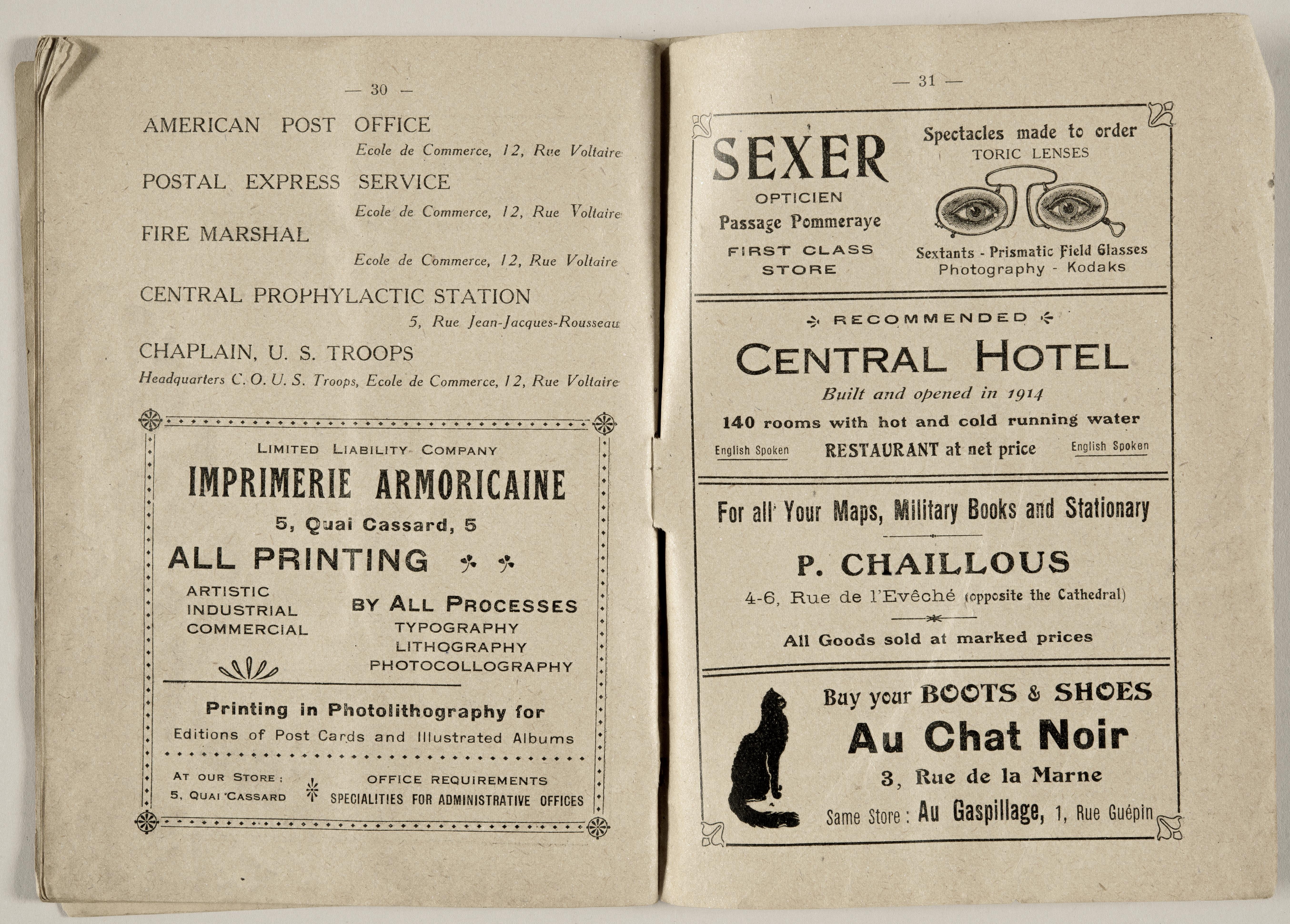 Le général des armées des États-Unis John Pershing accompagne le corps expéditionnaire américain à Saint-Nazaire en juin 1917. Ce guide, où il s’adresse aux recrues nouvellement arrivées, est destiné à aider les jeunes soldats américains dans leur découverte de l’estuaire. Il précise cependant, dès la première page : « vous n’êtes pas venus en France en tant que touristes mais comme soldats de la Liberté ». Plus loin, il précise : « Toutes les maisons de commerce dont les noms figurent dans ce guide ont pris l’engagement de ne pas augmenter leurs prix pour vous, et certaines ont même décidé de vous proposer un prix plus avantageux. » Les dernières pages comportent des avertissements, la méfiance à l’encontre de l’espion et plus encore de l’espionne étant de rigueur : « ne parlez pas aux étrangers […] gardez votre bouche fermée et vos yeux ouverts ».