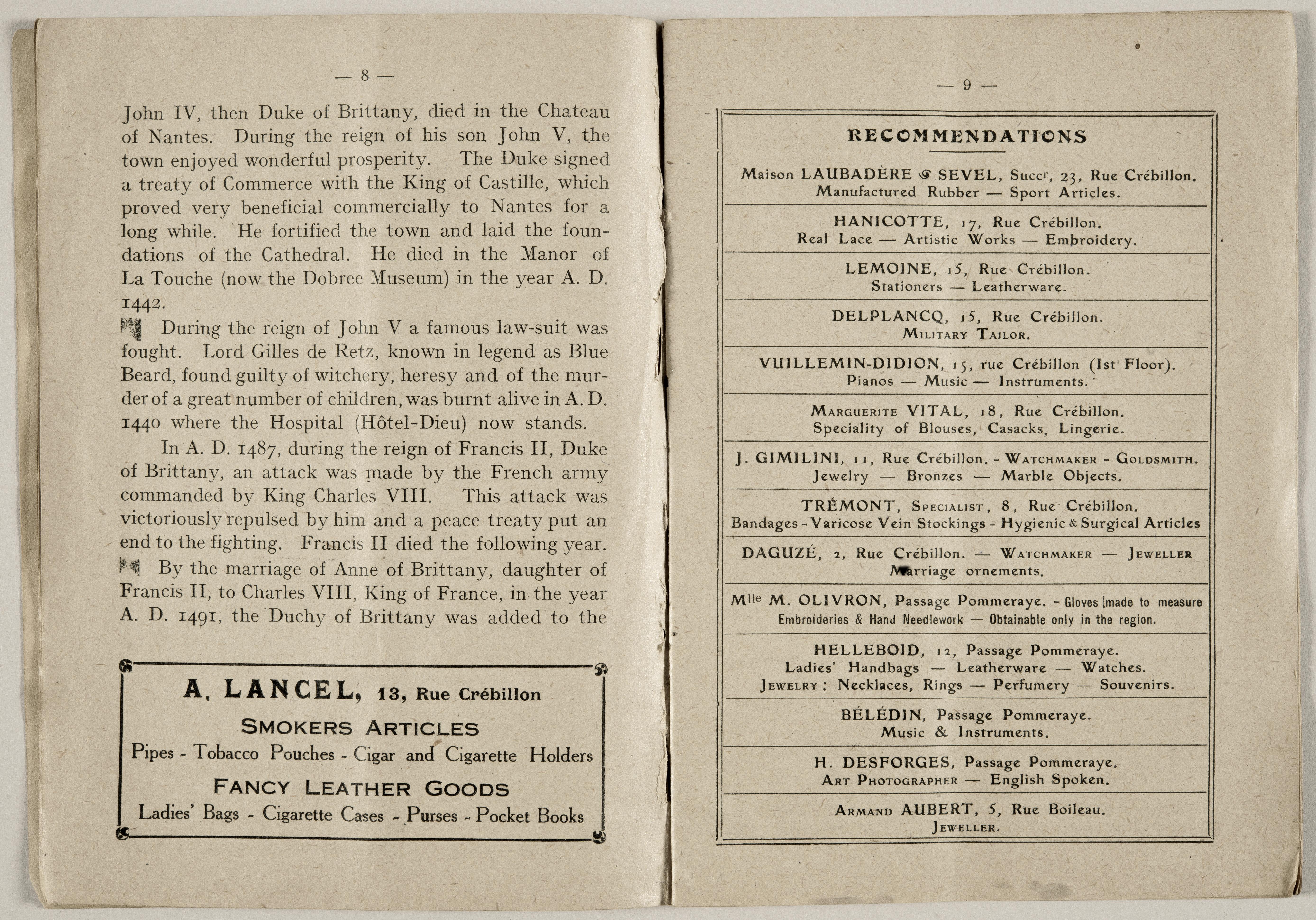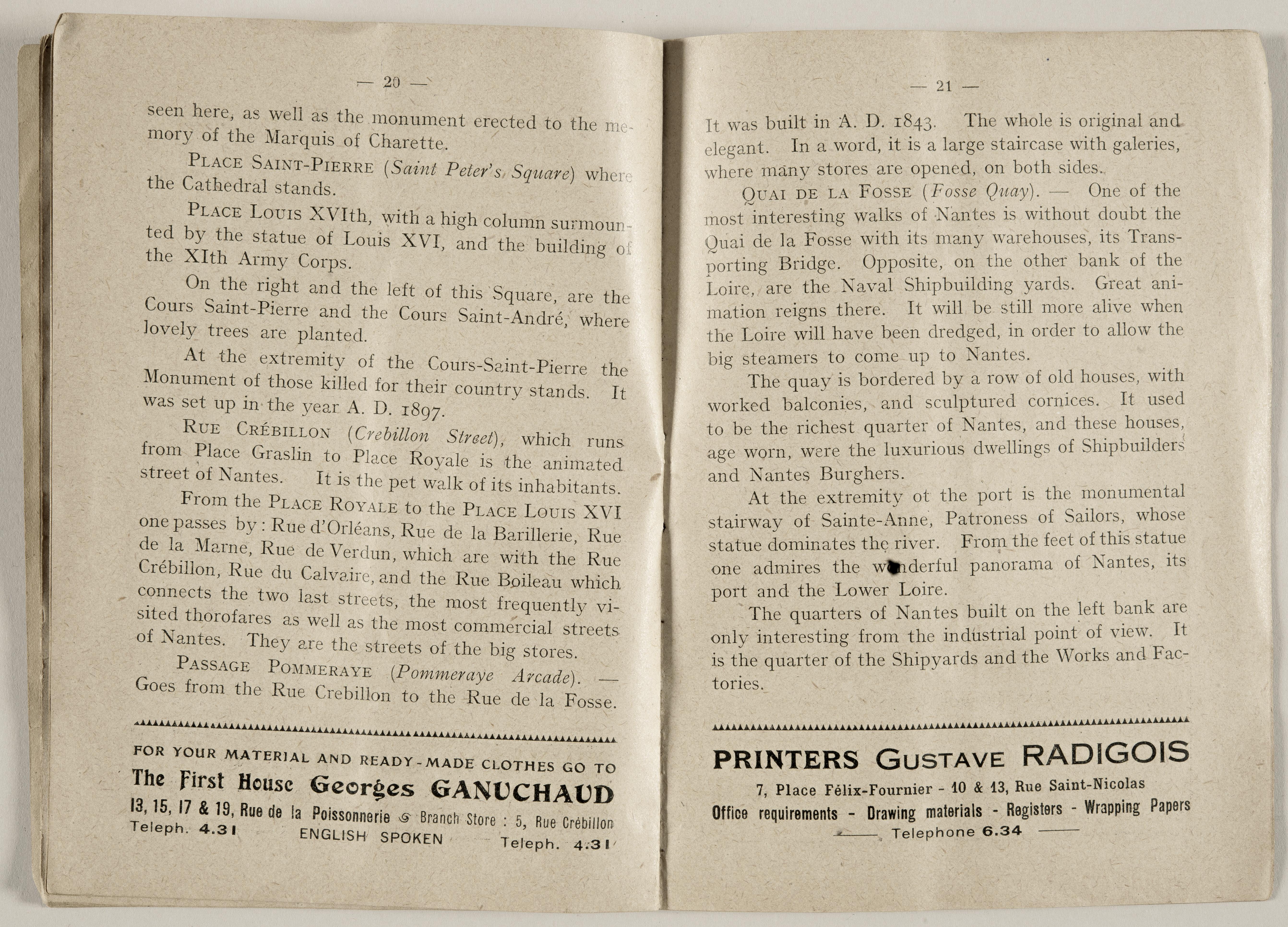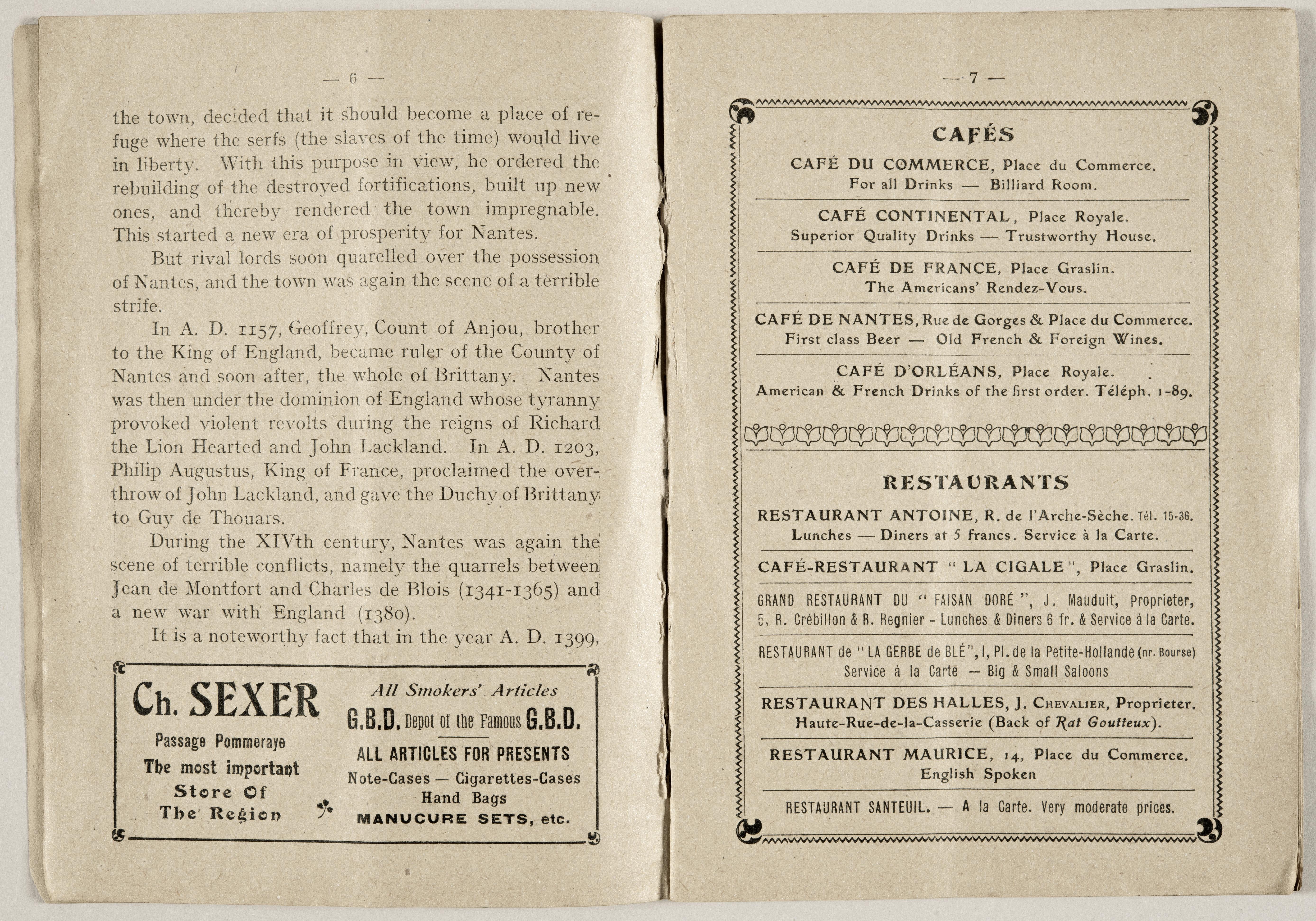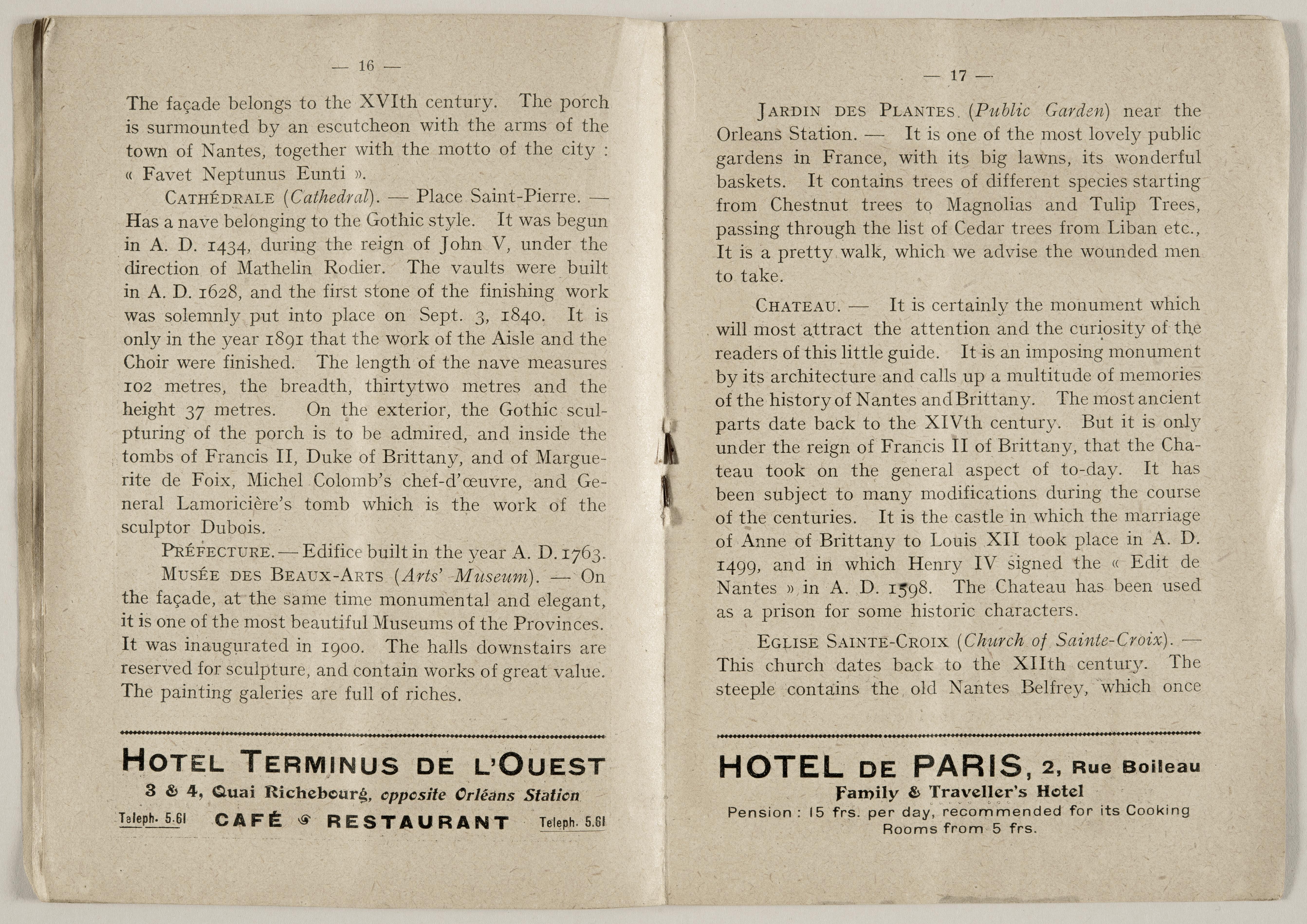 Le général des armées des États-Unis John Pershing accompagne le corps expéditionnaire américain à Saint-Nazaire en juin 1917. Ce guide, où il s’adresse aux recrues nouvellement arrivées, est destiné à aider les jeunes soldats américains dans leur découverte de l’estuaire. Il précise cependant, dès la première page : « vous n’êtes pas venus en France en tant que touristes mais comme soldats de la Liberté ». Plus loin, il précise : « Toutes les maisons de commerce dont les noms figurent dans ce guide ont pris l’engagement de ne pas augmenter leurs prix pour vous, et certaines ont même décidé de vous proposer un prix plus avantageux. » Les dernières pages comportent des avertissements, la méfiance à l’encontre de l’espion et plus encore de l’espionne étant de rigueur : « ne parlez pas aux étrangers […] gardez votre bouche fermée et vos yeux ouverts ».