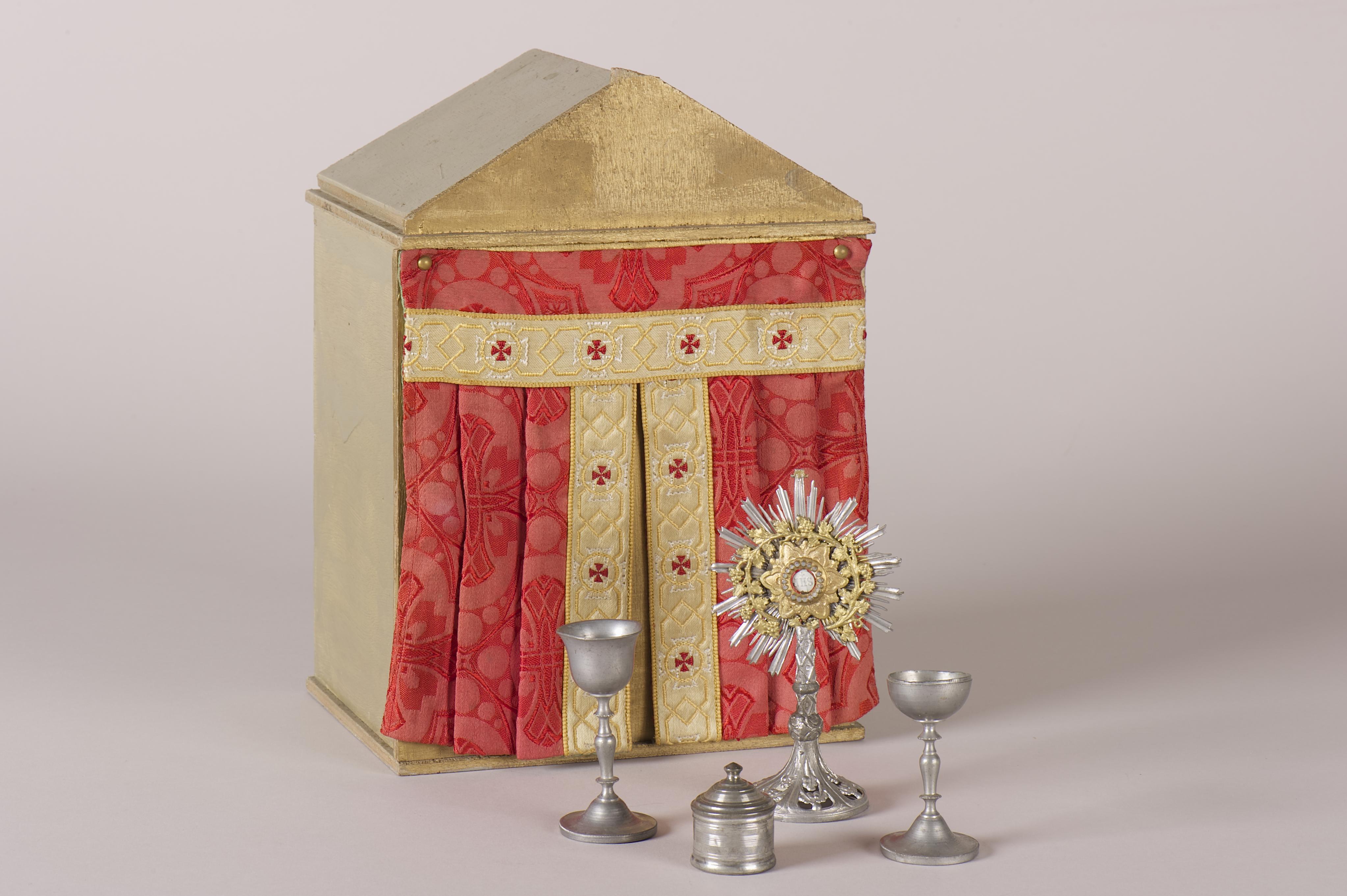 Ce tabernacle miniature est composé de cinq objets liturgiques permettant de « jouer à la messe » : un tabernacle, deux calices, un ciboire et un ostensoir.