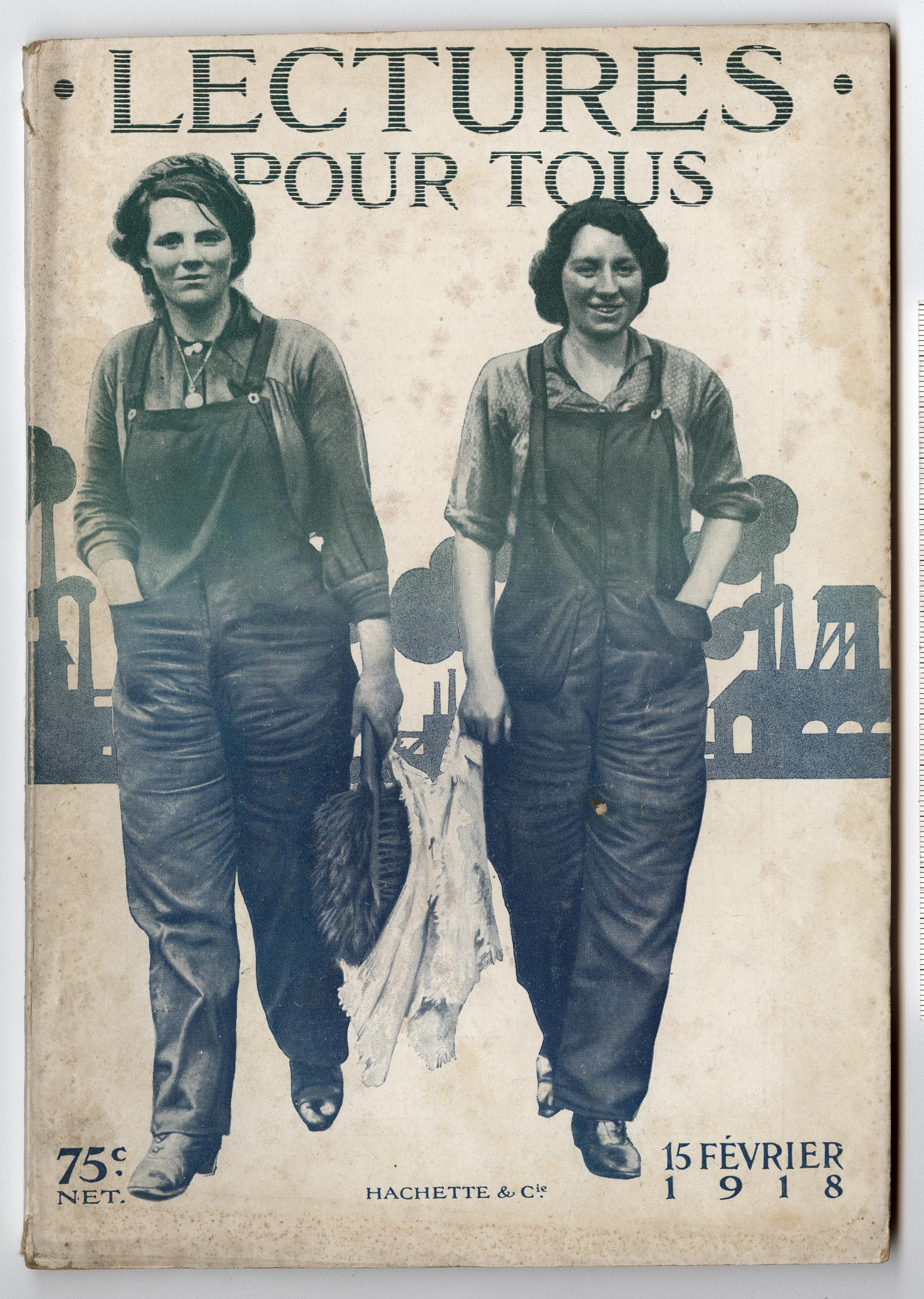 La couverture présentent deux femmes en bleus de travail, et une illustration d’usine à l’arrière-plan, évoquant le travail des femmes durant le conflit.