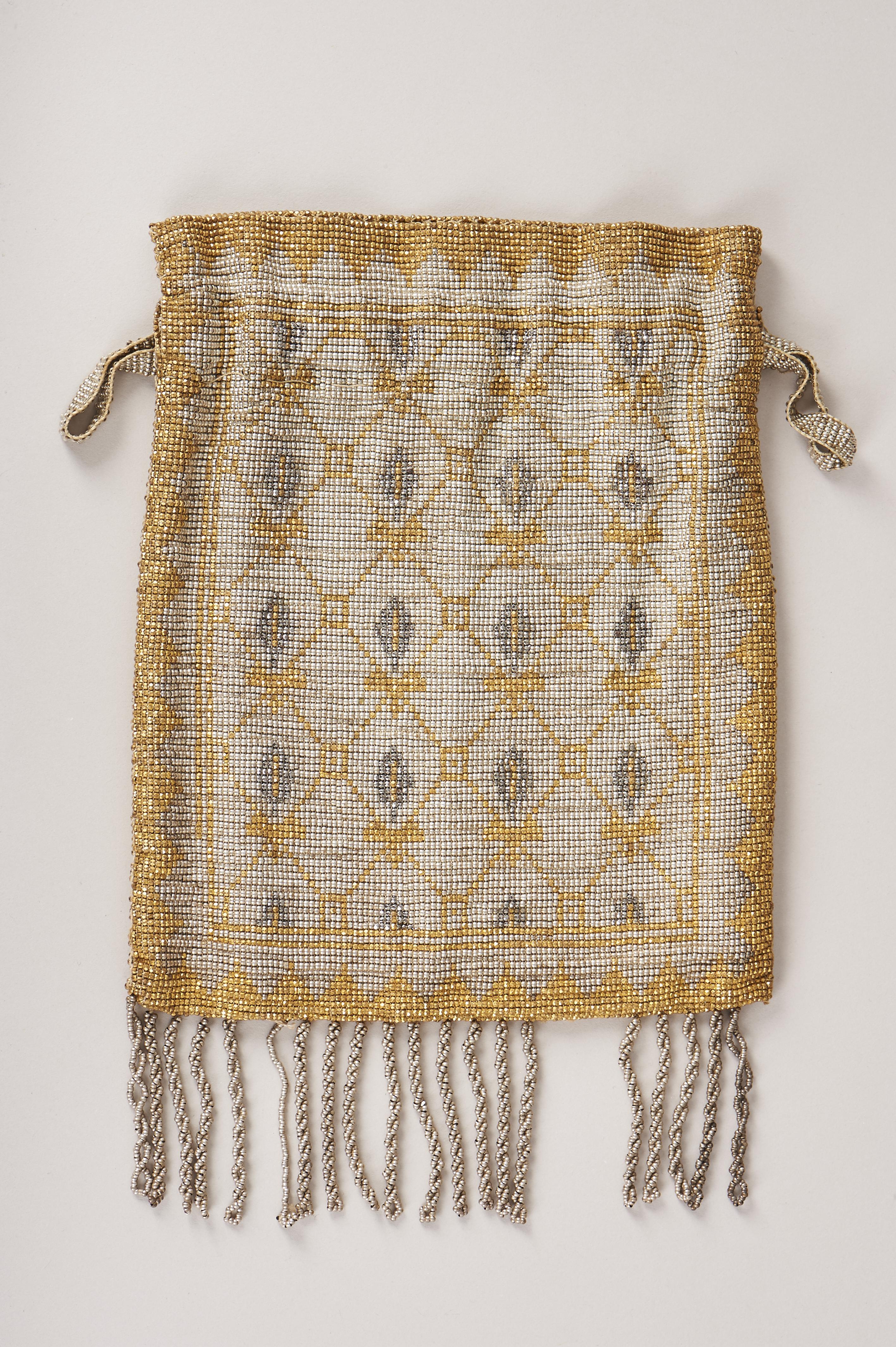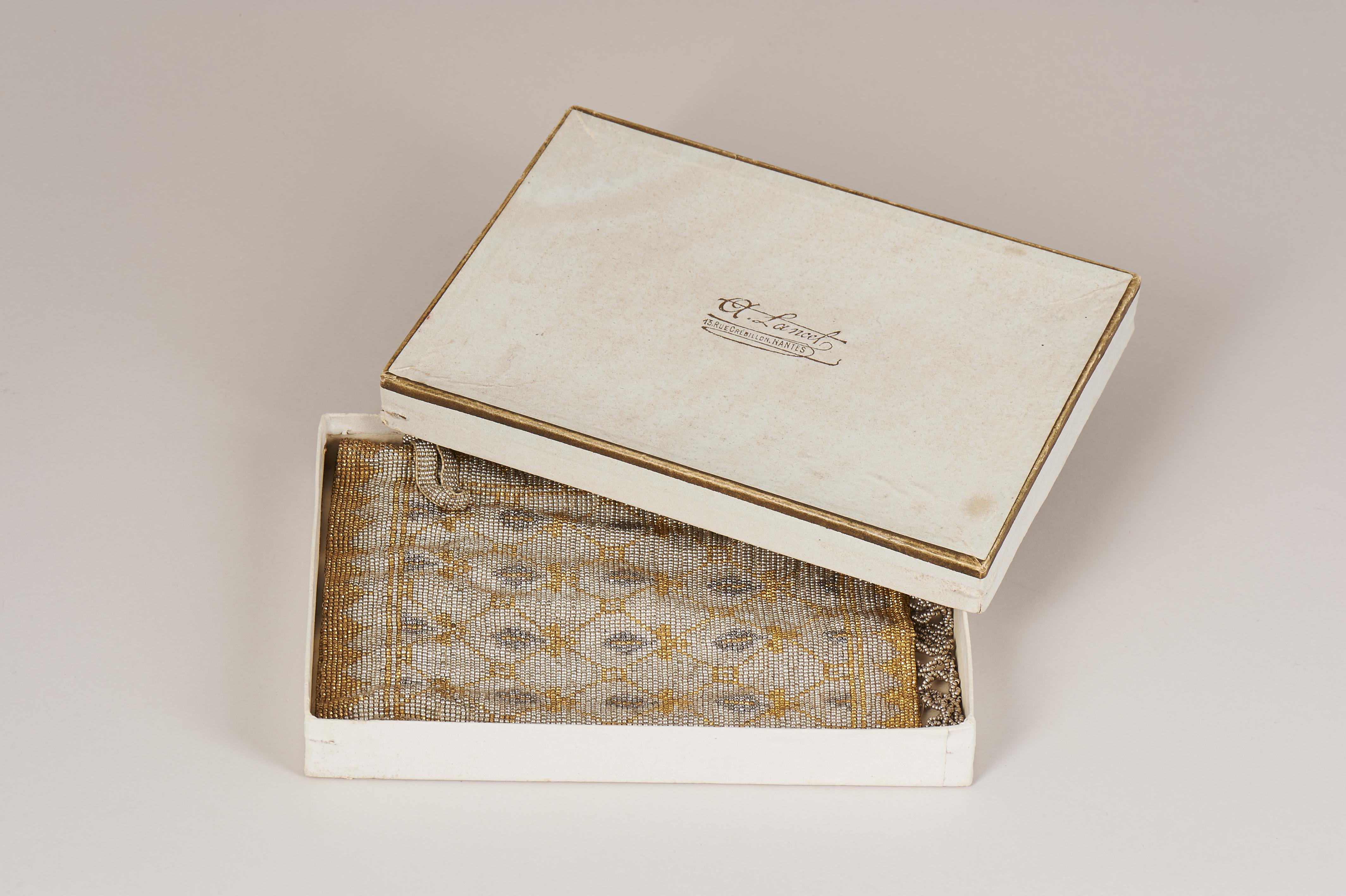 Il s’agit d’une pochette en perles, à franges perlées, de type réticule, se fermant à l’aide d’un cordon perlé. Elle est conservée dans sa boîte d’origine, marquée du nom du commerce A. Lancel, 13 rue Crébillon à Nantes.