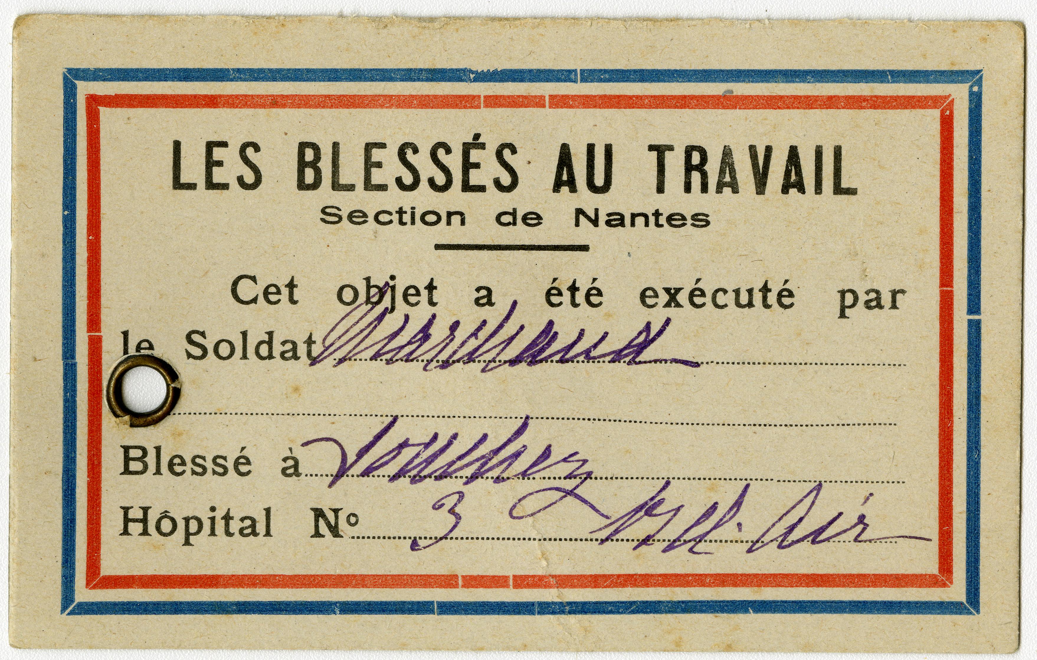 Elle est réalisée par un soldat, Marchand, blessé à Souchez lors de la première Guerre mondiale, et hospitalisé à l’hôpital n°3 Bel-Air à Nantes. Elle est achetée par Eugènie Tirot (1867-1948), épouse de l’industriel Paul Tirot (1869-1942), durant la Première Guerre mondiale, probablement avec une pochette perlée à franges de la maison Lancel, dans le magasin Lancel du 13 rue Crébillon à Nantes, comme soutien à l’effort de guerre, et à ses trois fils au front.