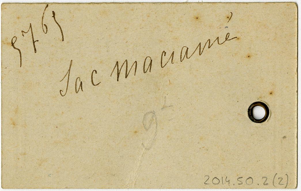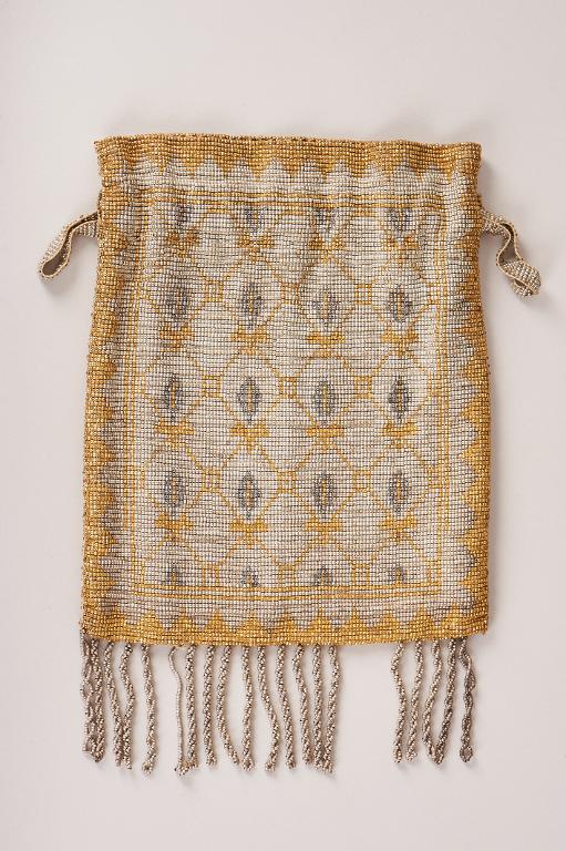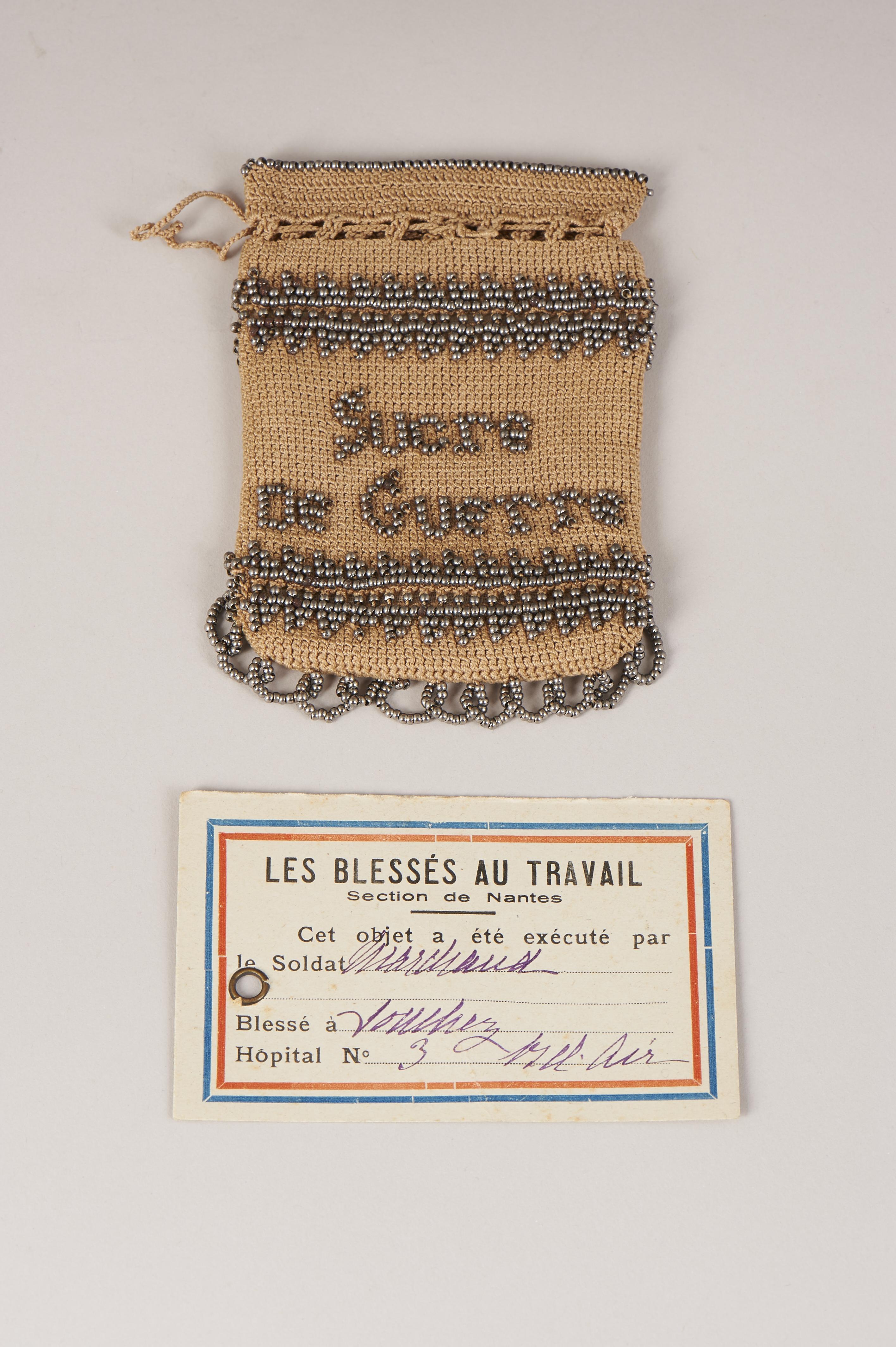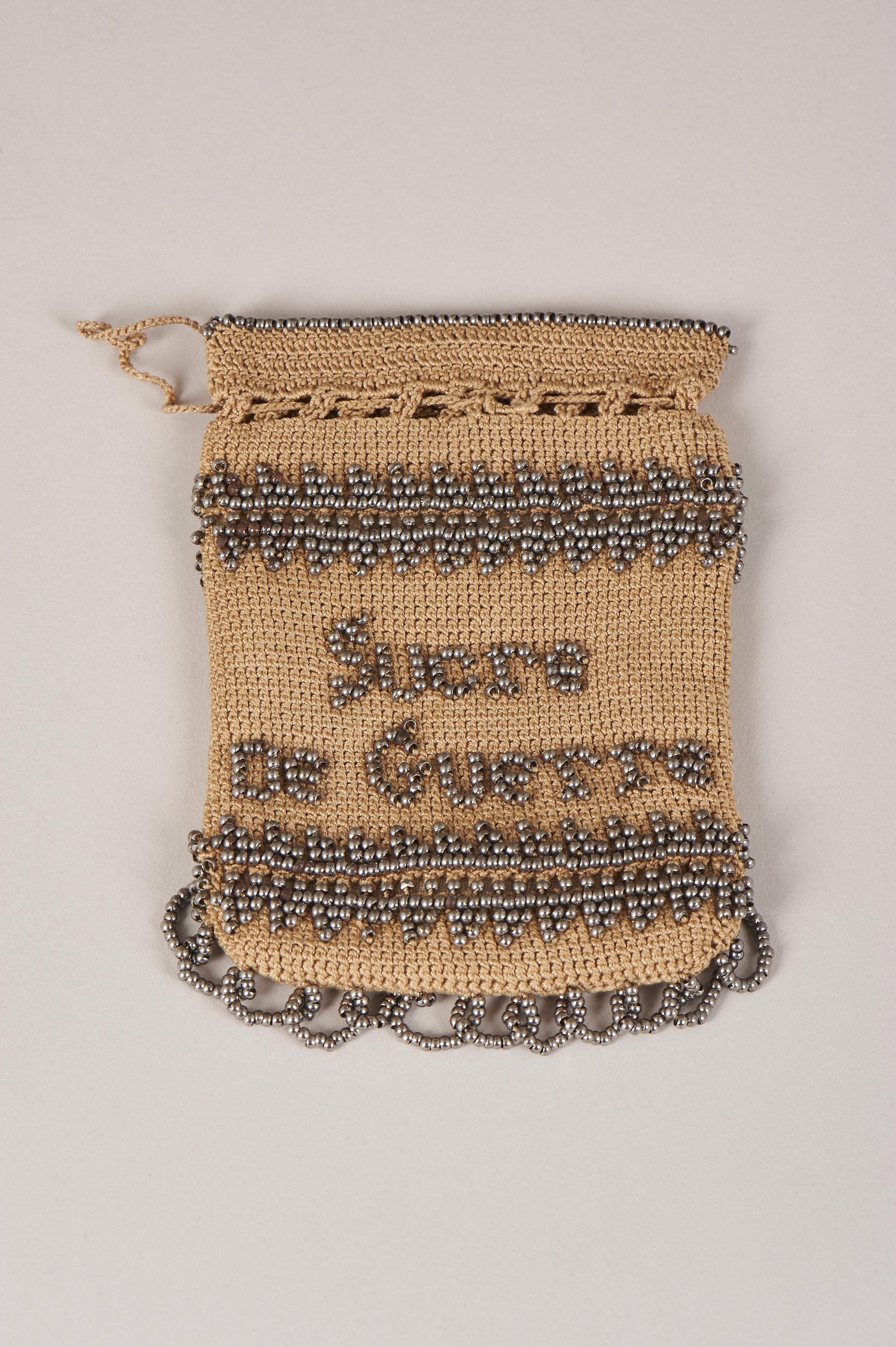 Il s’agit d’une pochette en macramé doublé de coton, et recouvert de perles argentées. Elle est accompagnée d’une étiquette « Les Blessés au travail ».
