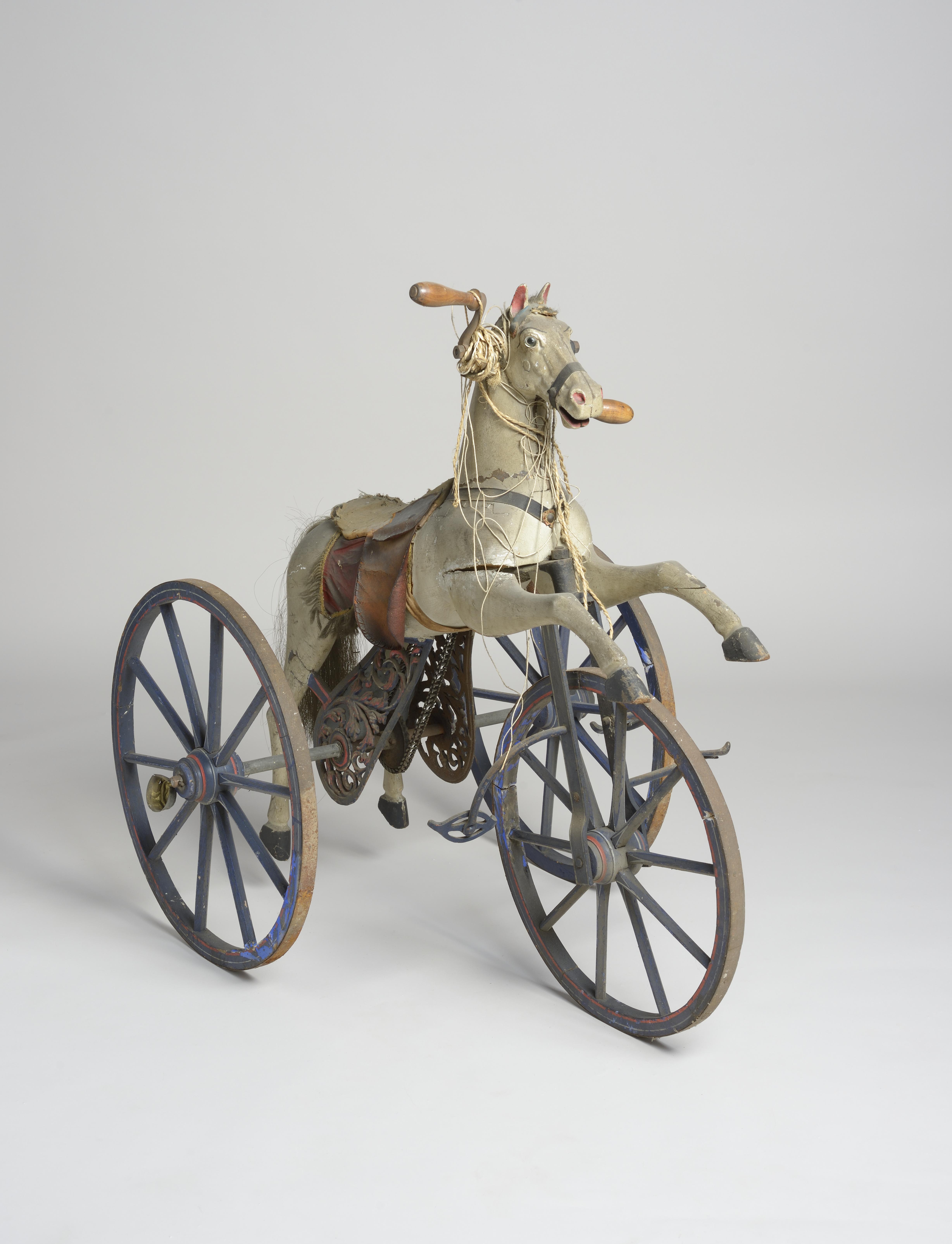Ce cheval mécanique est un tricycle pour enfant en bois peint, utilisé comme jouet dans la région nantaise à la fin du 19e siècle.
