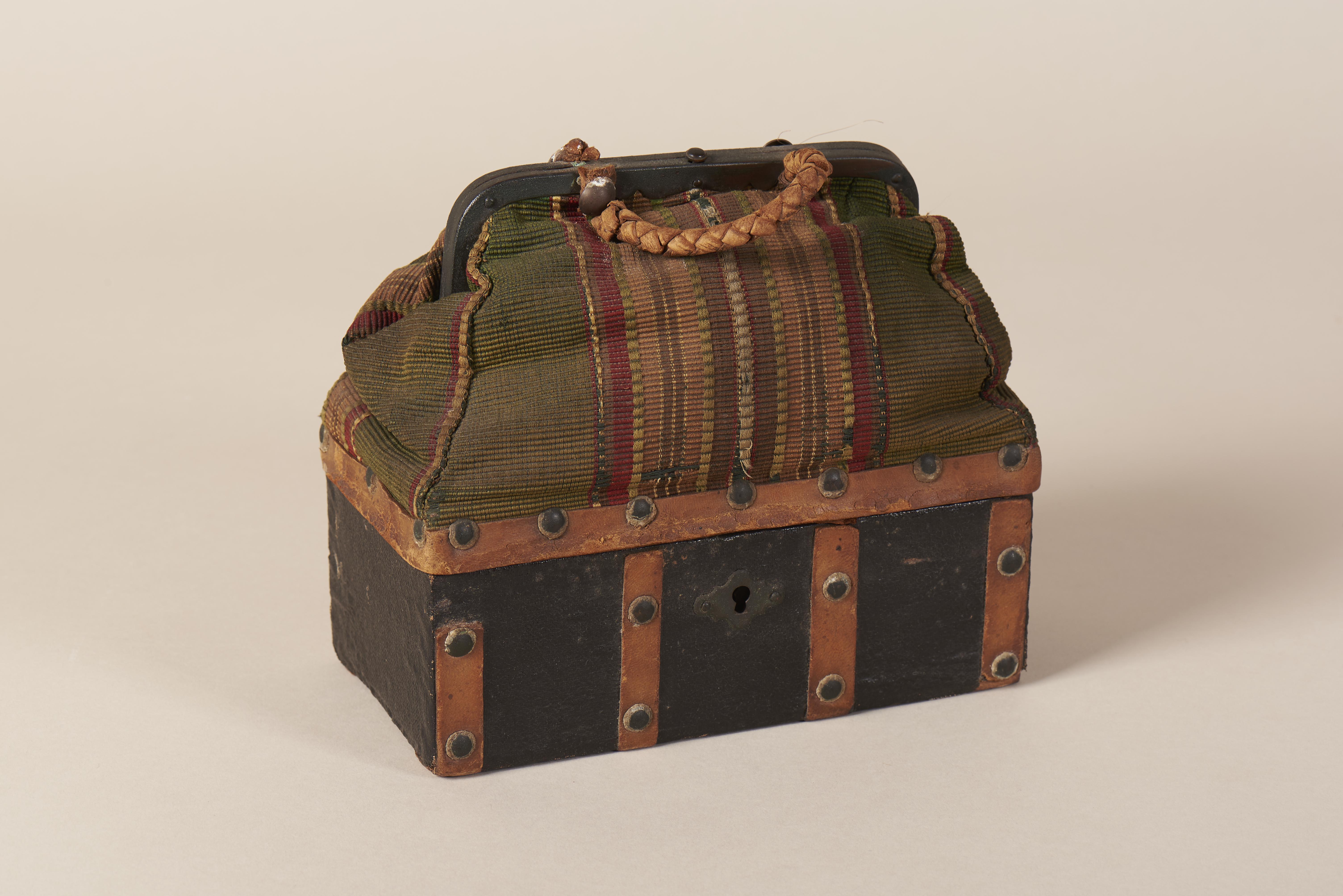 Cet élégant jouet pour enfant de la fin du 19e siècle est une petite mallette pour poupée sur base coffrée.
