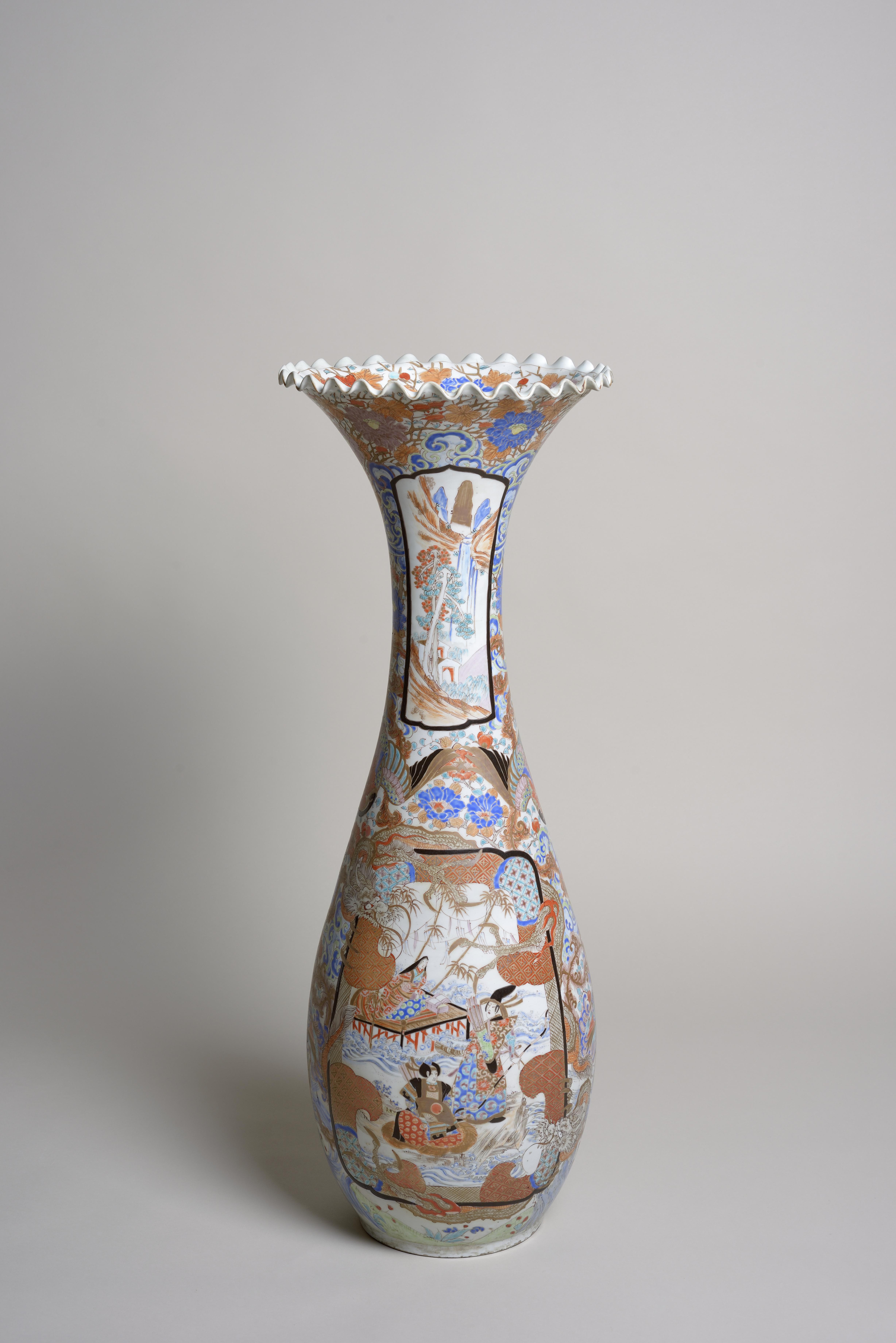 Ce vase cornet, impressionnant par sa taille, est de style Imari. La porcelaine Imari est élaborée et exportée par le Japon au début du 18e siècle. Cette production est destinée à une clientèle européenne, alors amatrice de ce décor chargé, aux dominantes de rouge de fer, de bleu de cobalt et d’or.