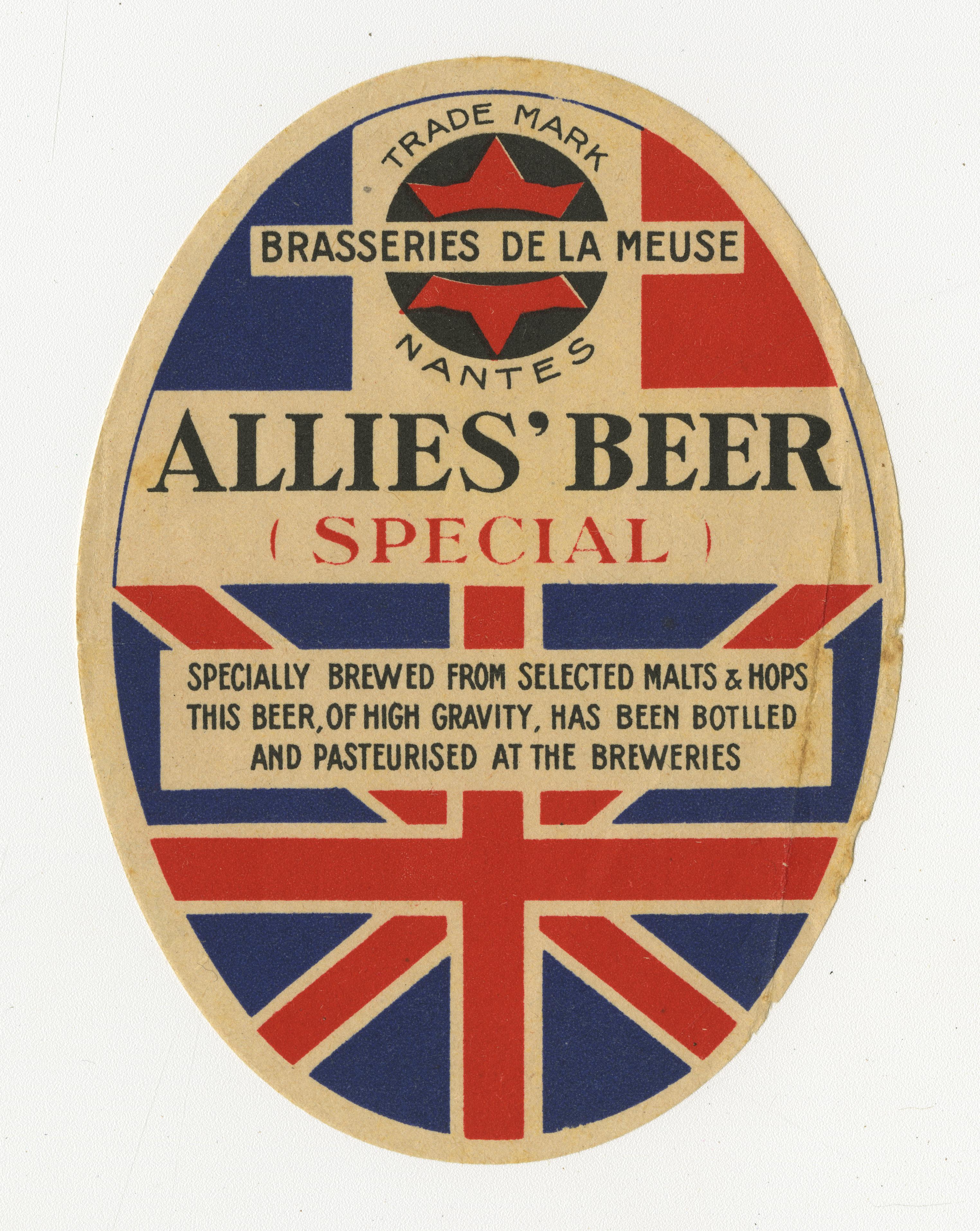 Il s’agit d’une étiquette de bouteille de bière « des Alliés » produite par les Brasseries de la Meuse. Les Brasseries de la Meuse brassent en effet dès la Libération une bière spéciale, destinée à ravitailler les troupes anglaises, américaines et canadiennes présentes dans la région.
