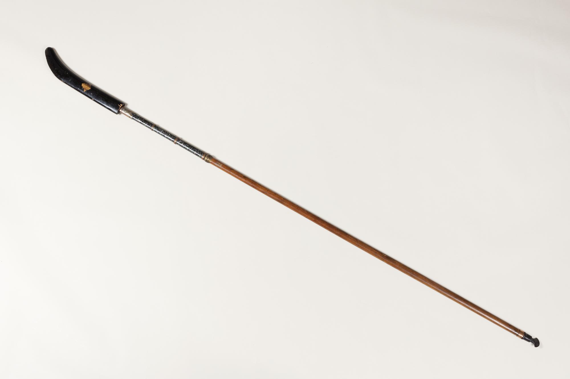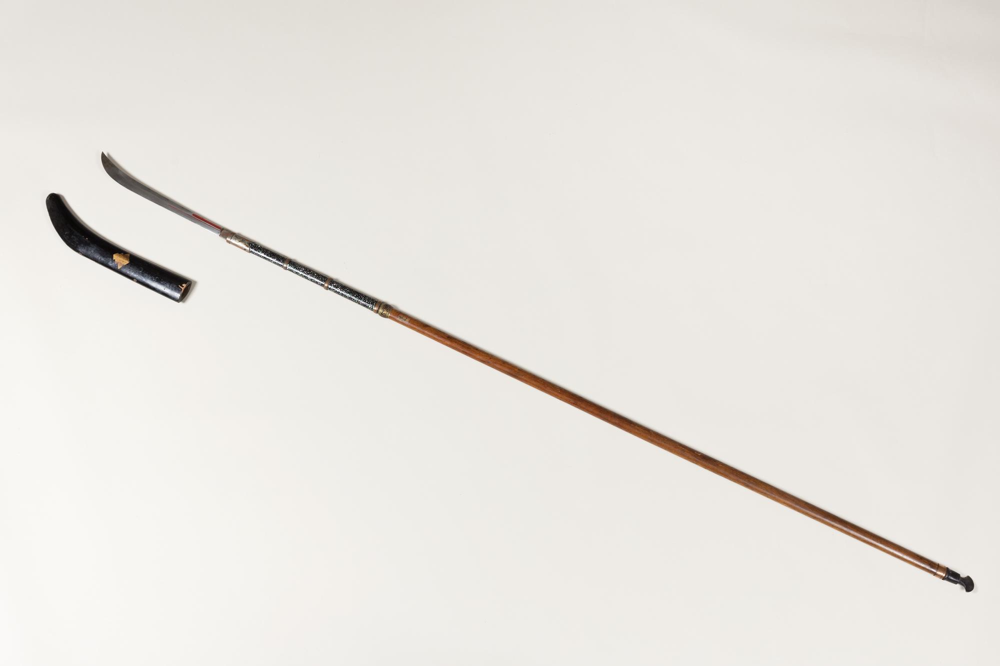 Il s’agit d’une naginata, arme japonaise constituée d’un manche de bois et d’une lame courbe à un seul tranchant. Les naginatas sont à l’origine des armes de hast, utilisées sur les champs de bataille pour désarmer les ennemis ou couper les jarrets des chevaux. Ces armes deviennent inefficaces avec l’apparition des armes à feux. Elles continuent cependant d’être produites et employées, notamment par les médecins et les femmes ou filles de samouraïs pendant la période Edo (1600 – 1868). Le changement d’usage implique une évolution des formes : la longueur est réduite et le manche gagne en ornementation. Les naginatas deviennent alors un article essentiel dans les trousseaux des jeunes filles, constitués pour leur mariage. Il s’agit d’une des rares armes japonaises dont la pratique a été largement enseignée aux femmes.