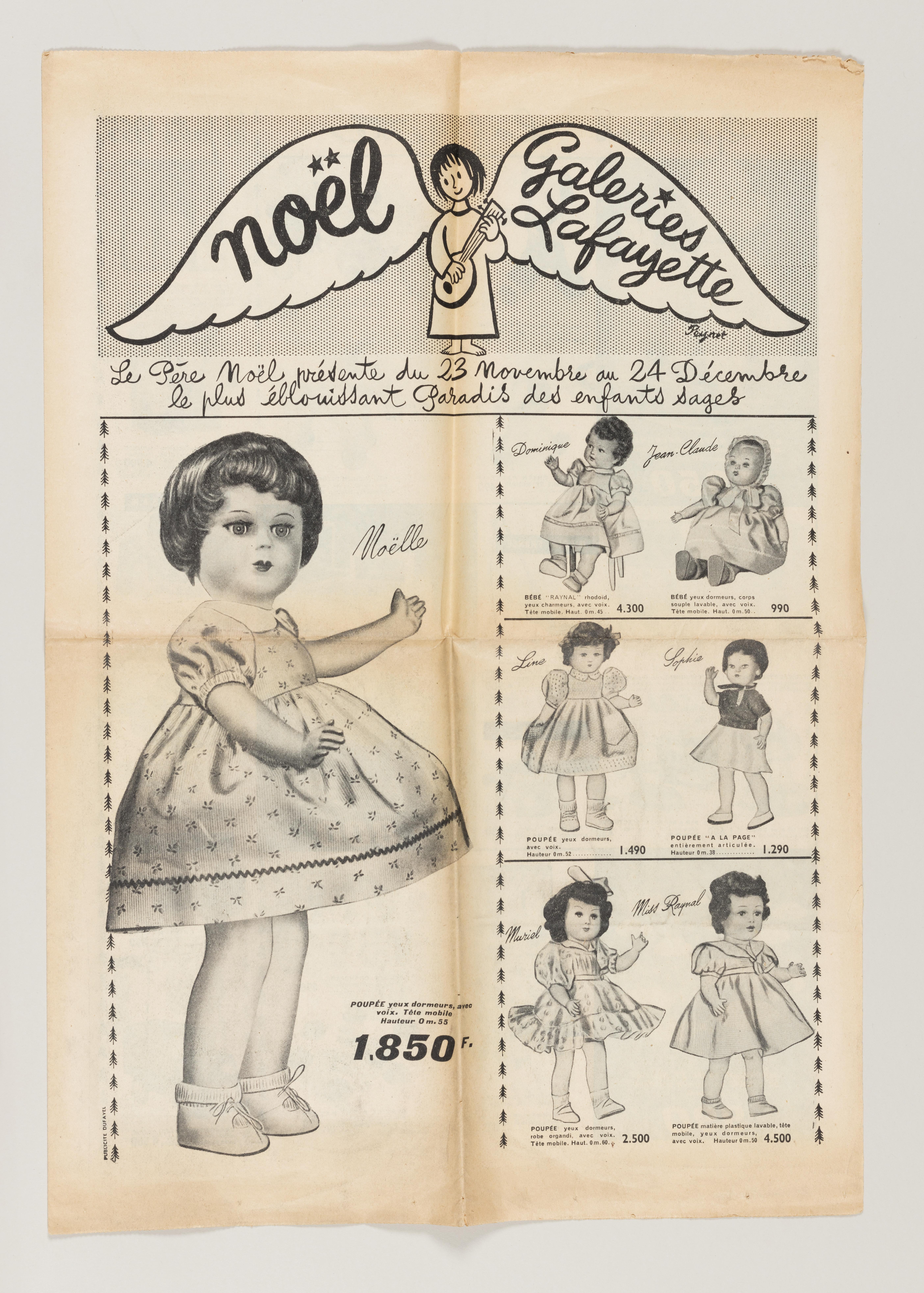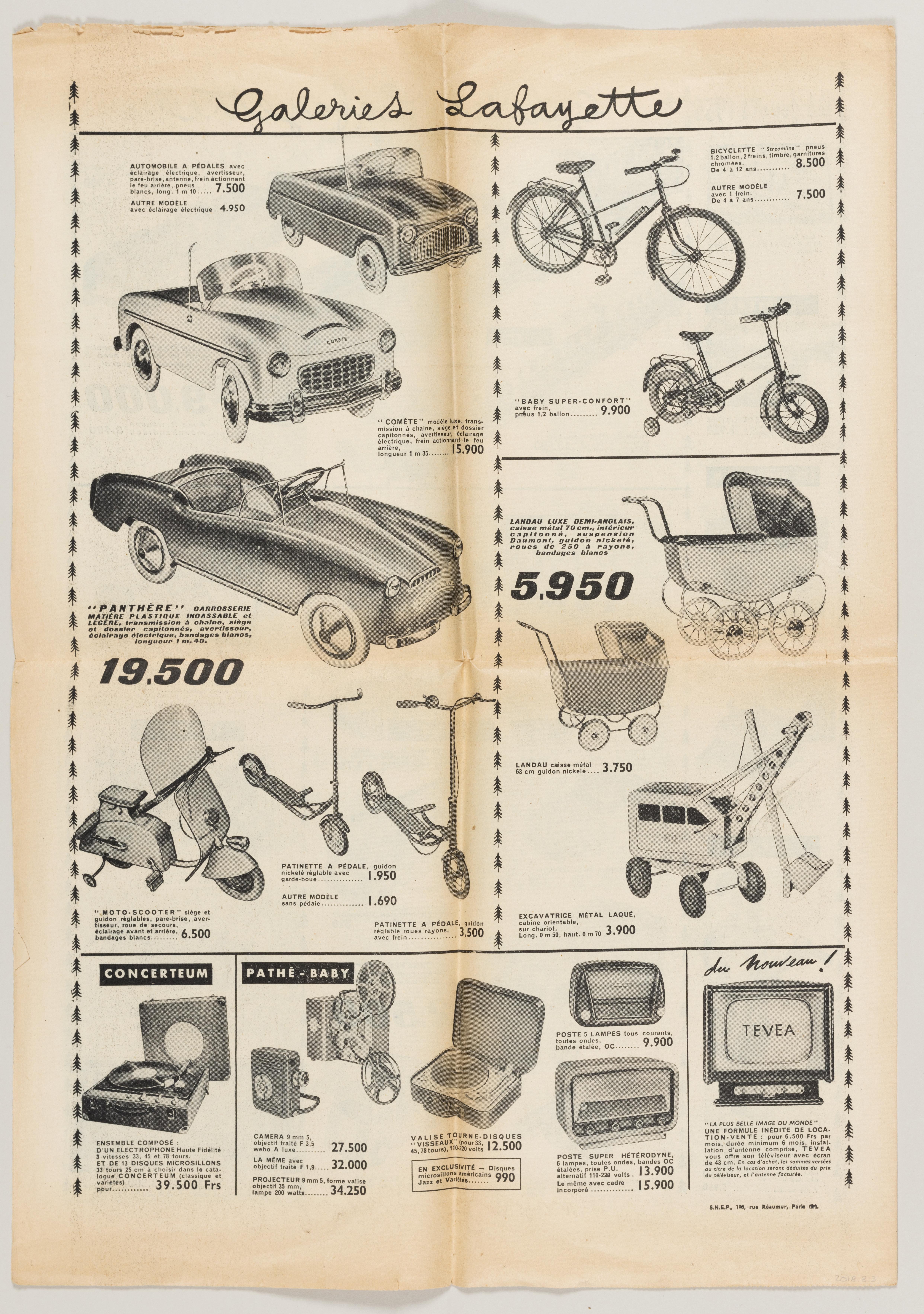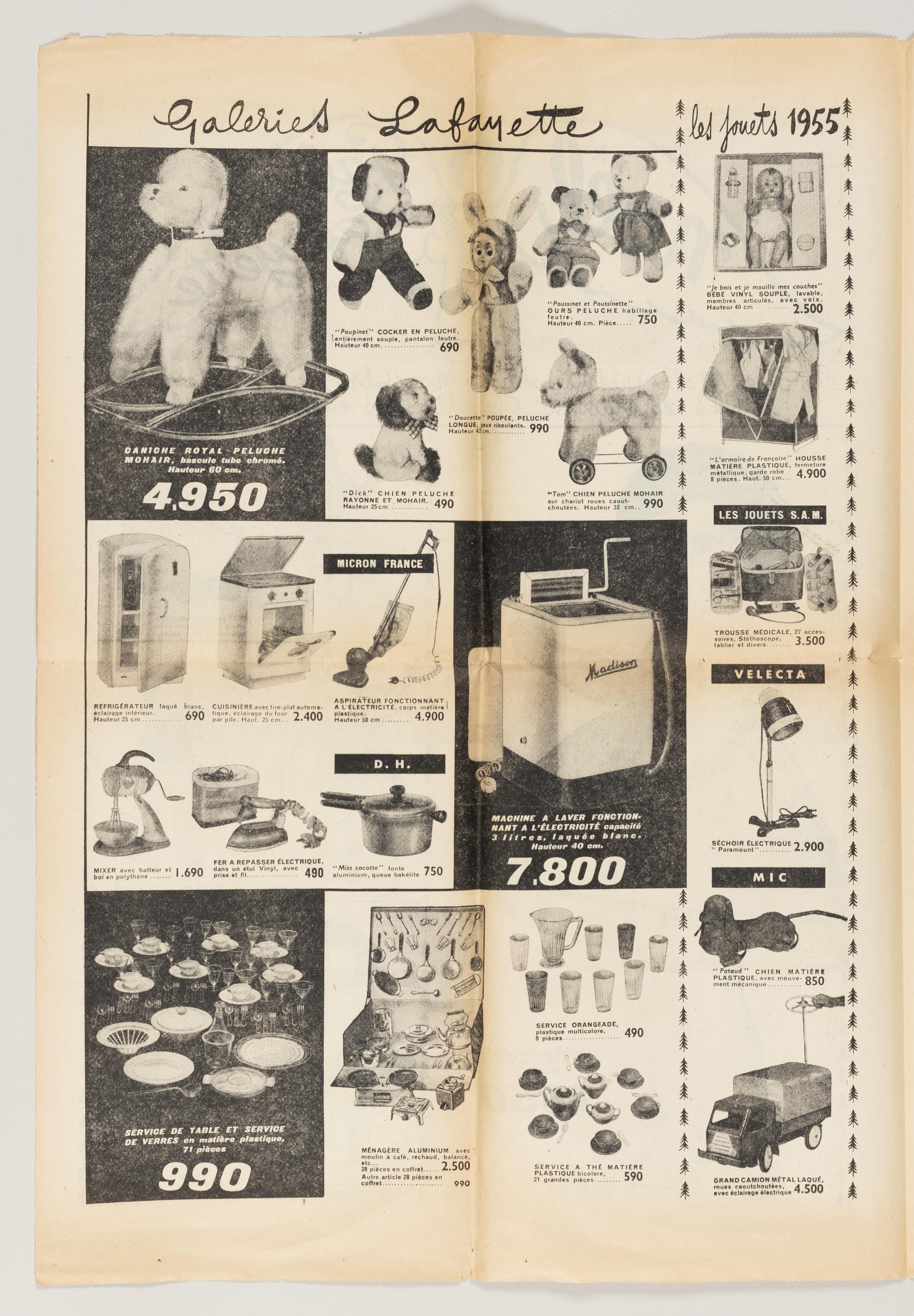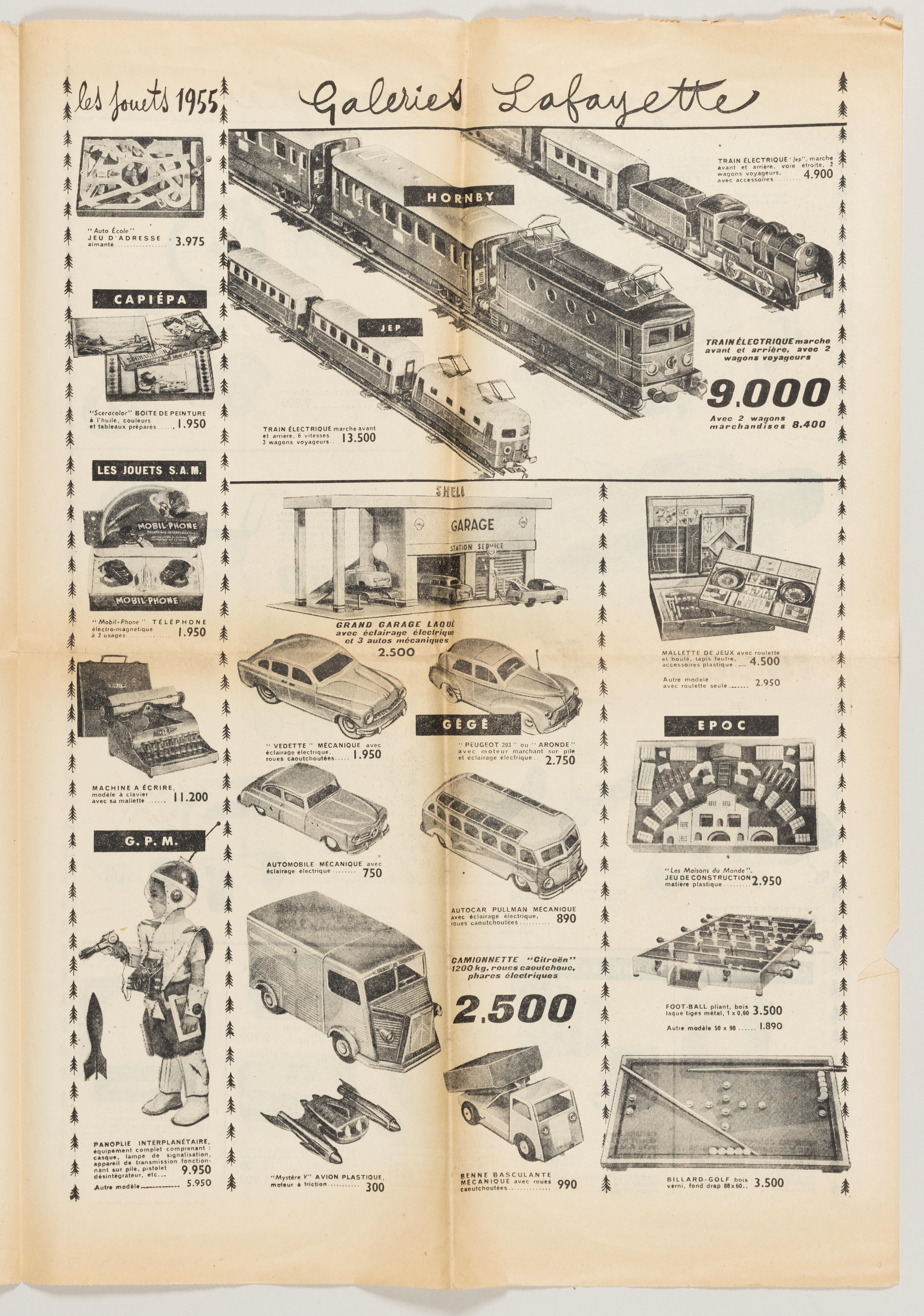 Il s’agit d’un catalogue de jouets édité par le magasin parisien Les Galeries Lafayette, à l’occasion de Noël en 1955.