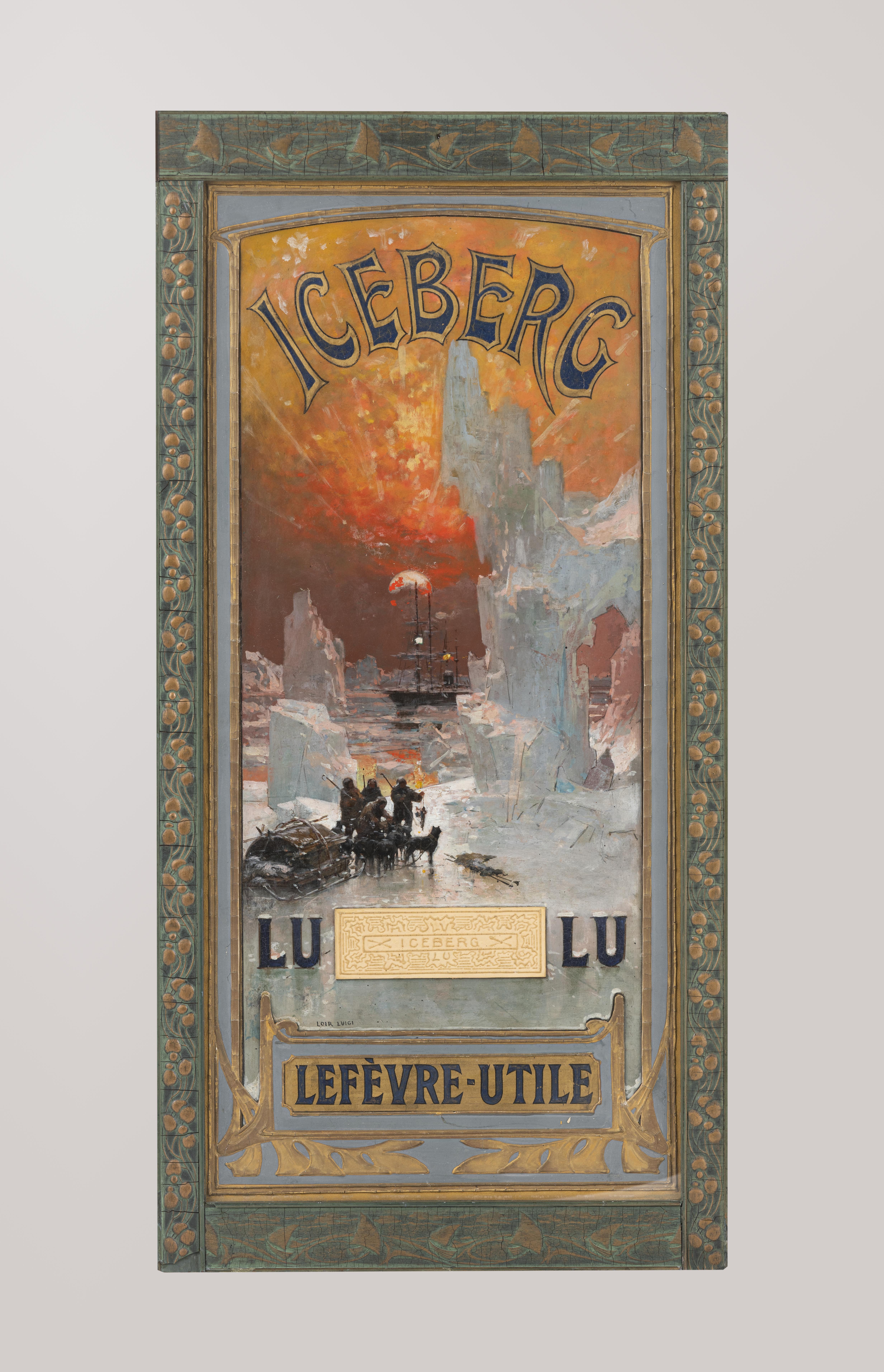 La boîte de gaufrettes Iceberg est mise en vente en avril 1903, accompagnée de panneaux et affichettes publicitaires déclinés à partir de l’œuvre de Luigi Loir.