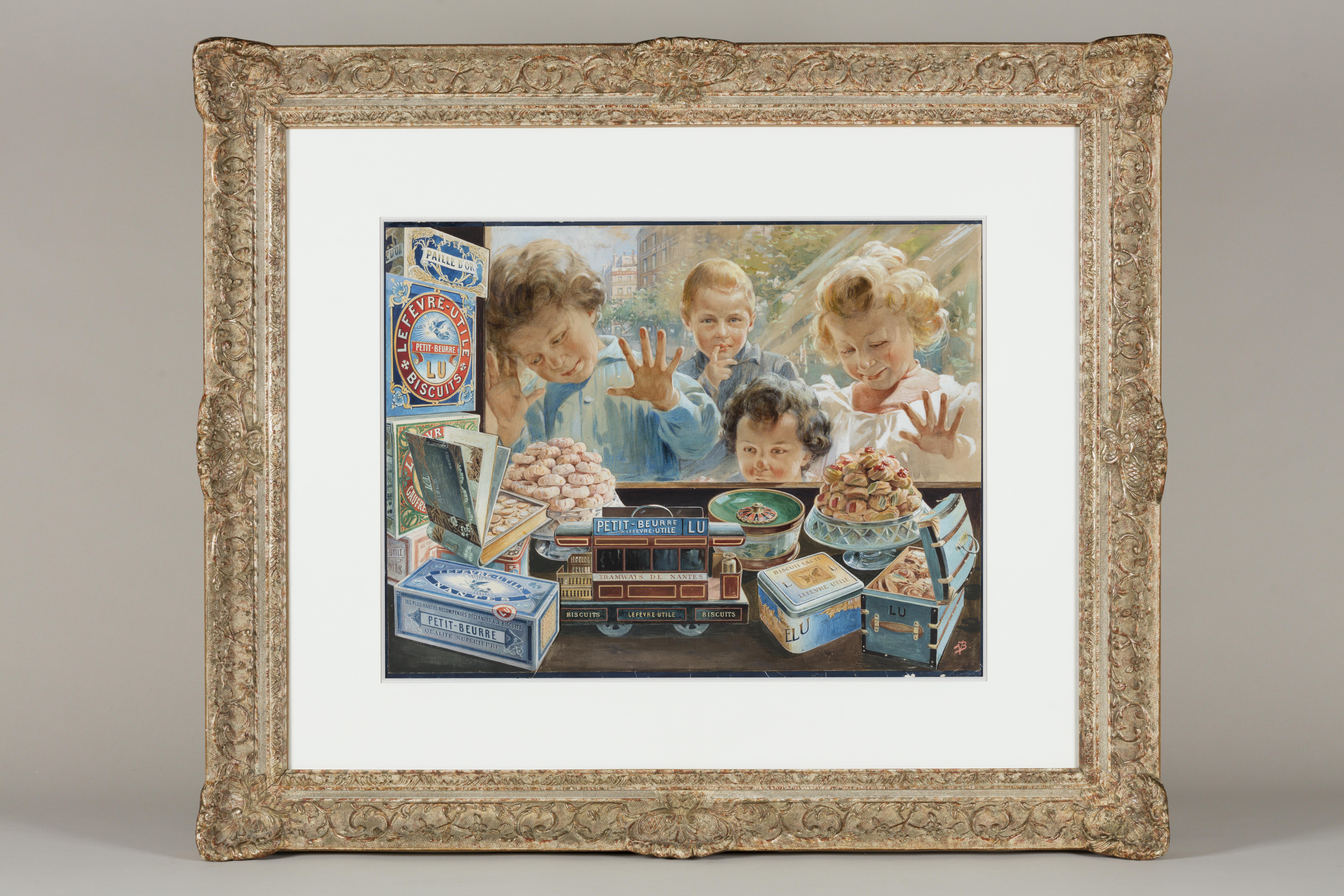 En octobre 1903, Louis Lefèvre-Utile commande une image publicitaire à l’illustrateur Vincent Bocchino. L’artiste envoie ses premières esquisses, qui séduisent l’industriel : il s’agit d’enfants émerveillés devant une vitrine garnie de boîtes de biscuits. Cependant, Louis Lefèvre-Utile souhaite que chaque boîte soit parfaitement identifiable pour le consommateur, et il se charge lui-même de l’élaboration de cette partie de la composition. En octobre 1904, il partage ses croquis avec Bocchino via l’imprimeur Champenois. Ce n’est qu’en janvier 1906 que la composition finale est validée et mise sous presse. Cependant, soucieux du détail, Louis Lefèvre-Utile s’aperçoit qu’il manque la mention « Grand Prix » sur la boîte de Petit-Beurre, et demande donc à ce qu’elle soit ajoutée.