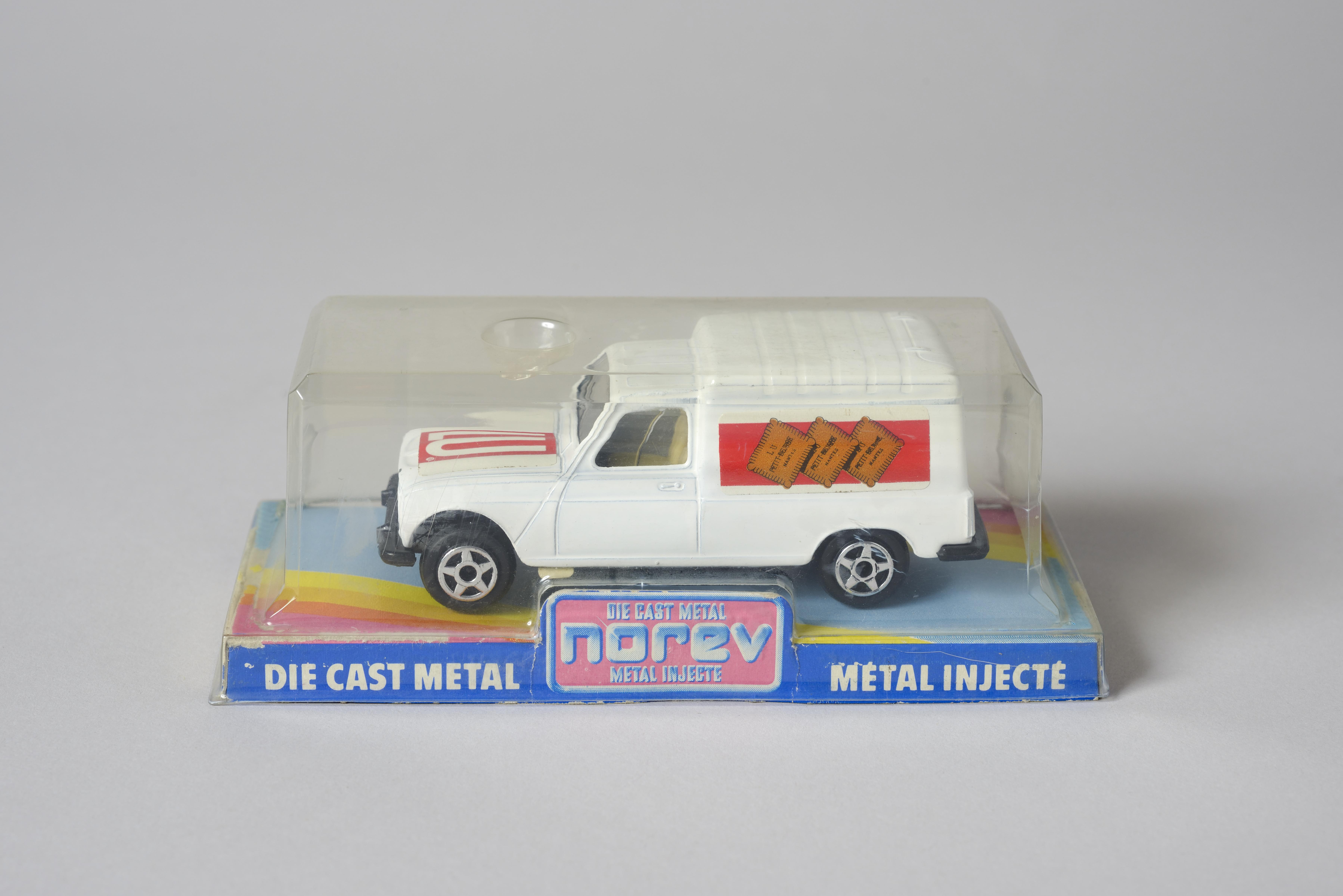 Cette voiture miniature conservée dans son emballage est un jouet d’enfant. Il s’agit d’un produit publicitaire LU, orné du logo de l’entrepruise sur le capot avant et de trois biscuits « petit-beurre » sur le côté. Le modèle reproduit est une fourgonnette Renault 4.