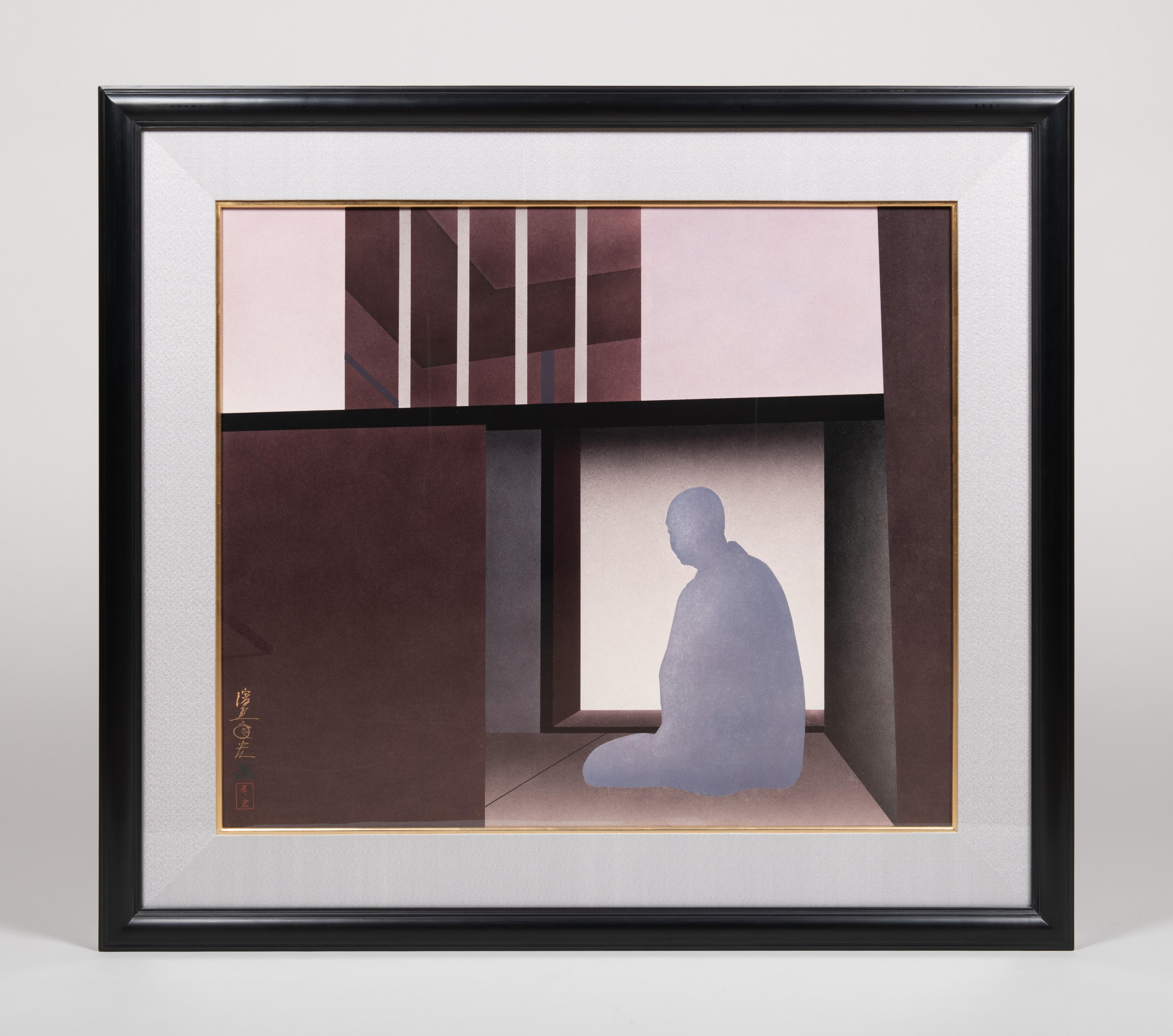 Dans l’encadrement d’une porte, est représentée la silhouette bleutée d’un homme assis en tailleur sur un tatami. Cette œuvre évoque Sen no Rikyu (1522-1591), le maître de thé le plus connu de l’histoire japonaise. Sa silhouette prend place dans le Tai-an du temple Myoki-an situé dans la ville d’Oyamazaki-cho (Otokuni-gun dans la préfecture de Kyoto), lieu où il a passé les derniers jours de sa vie. Le Tai-an est un pavillon de thé fait de chaume et de torchis classé trésor national. Sa surface correspond à celle de deux tatamis (3,24 m²). On y pénètre par le nijiri guchi (entrée basse) en s’inclinant selon le cérémonial du sado (l’art de la cérémonie du thé), par lequel les personnes invitées sont accueillies sur un pied d’égalité.
