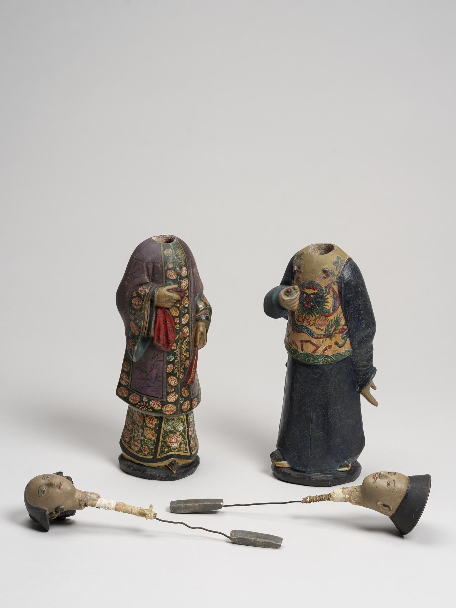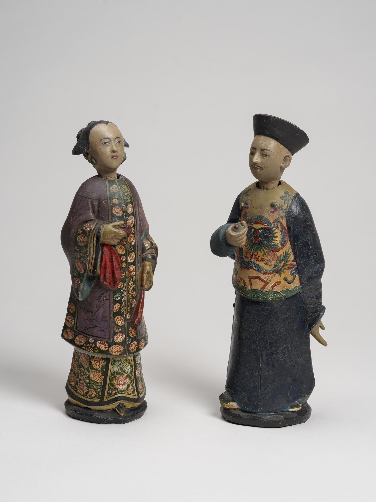 À l’origine destinées au culte des ancêtres, les petites figurines en argile de ce type, représentant un homme et une femme chinois, sont rapportées en Europe au 18e siècle par les officiers de la Compagnie des Indes orientales. Jugées à la fois esthétiques et amusantes, les têtes étant mobiles, leur goût se répand. Dans les années 1780, une production spécifique se développe à Canton afin de fournir les commerces européen et américain jusqu’au début du 19e siècle. Les représentations se diversifient alors, les costumes des différents dignitaires chinois offrant des motifs particulièrement appréciés.
