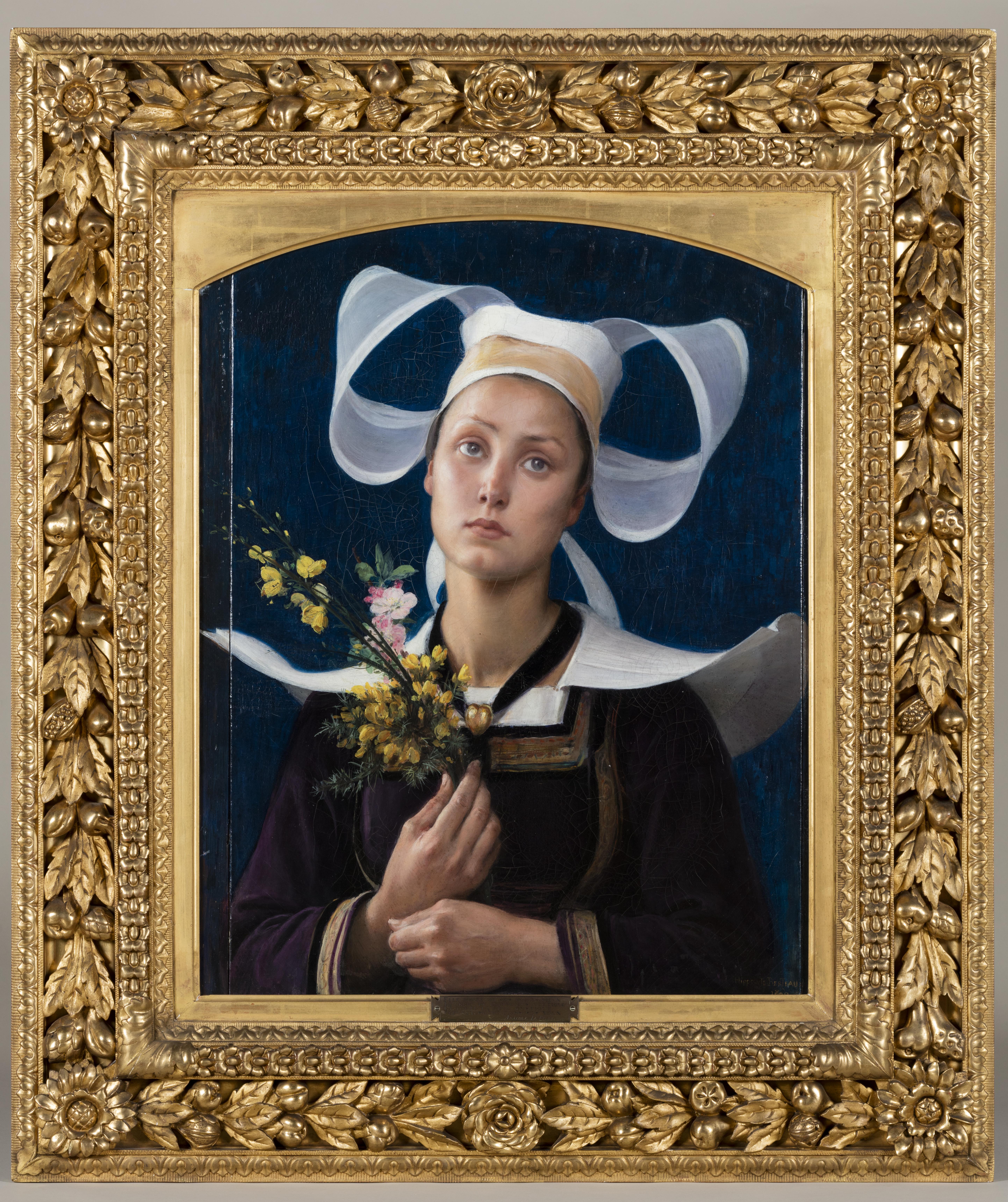 En 1900, le peintre Hippolyte Berteaux est sollicité par la biscuiterie Lefèvre-Utile pour réaliser l’image d’un calendrier publicitaire. Ce portrait idéalisé d’une jeune Bretonne, présentée les yeux levés vers le ciel, se réfère aux représentations traditionnelles de la Vierge. La Bretagne et la ville de Nantes appartiennent aux sujets récurrents dans la communication de l’entreprise. L’association fréquente de ces deux thèmes dans la production artistique et publicitaire de la biscuiterie témoigne de l’attachement des édiles locaux à la culture bretonne.