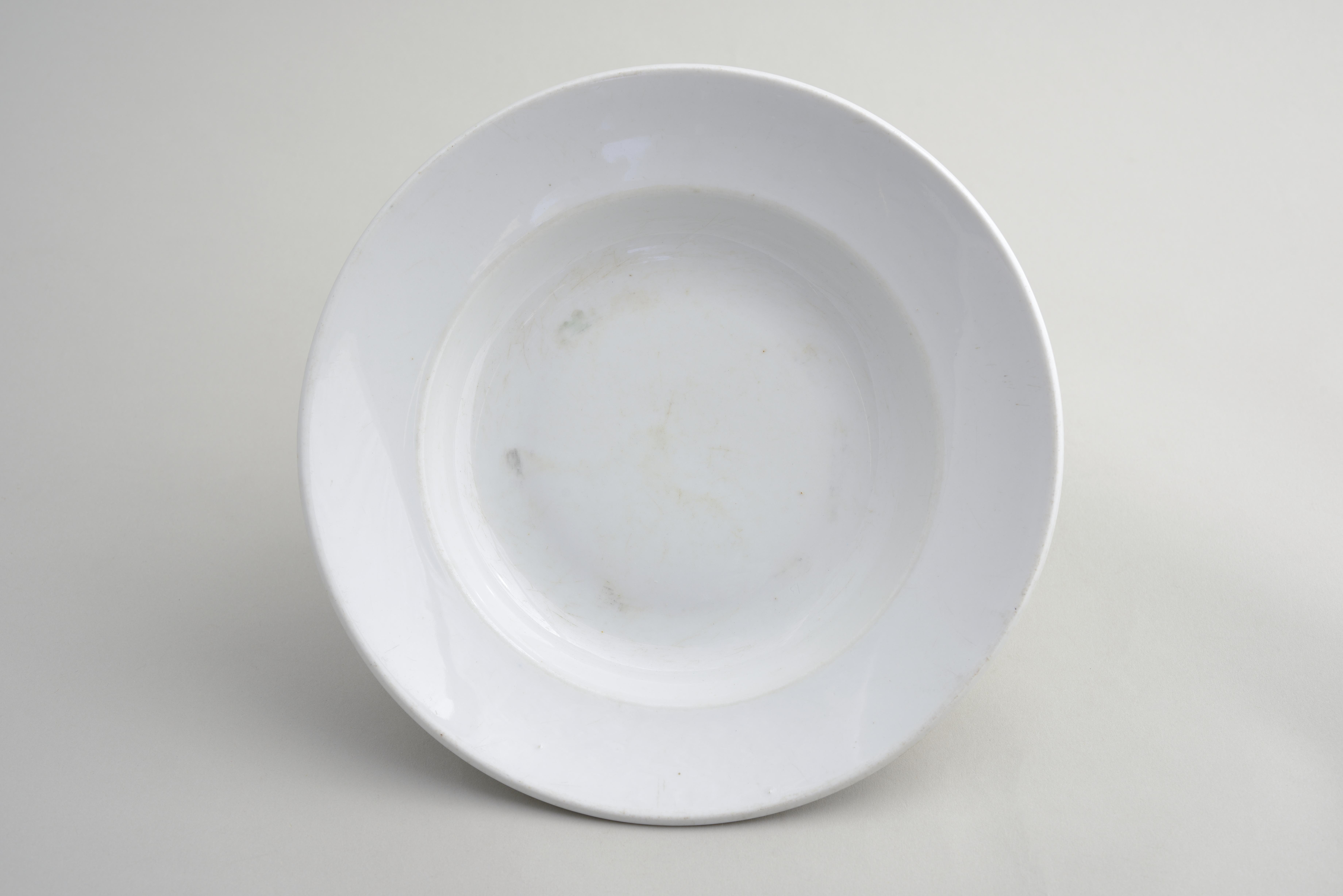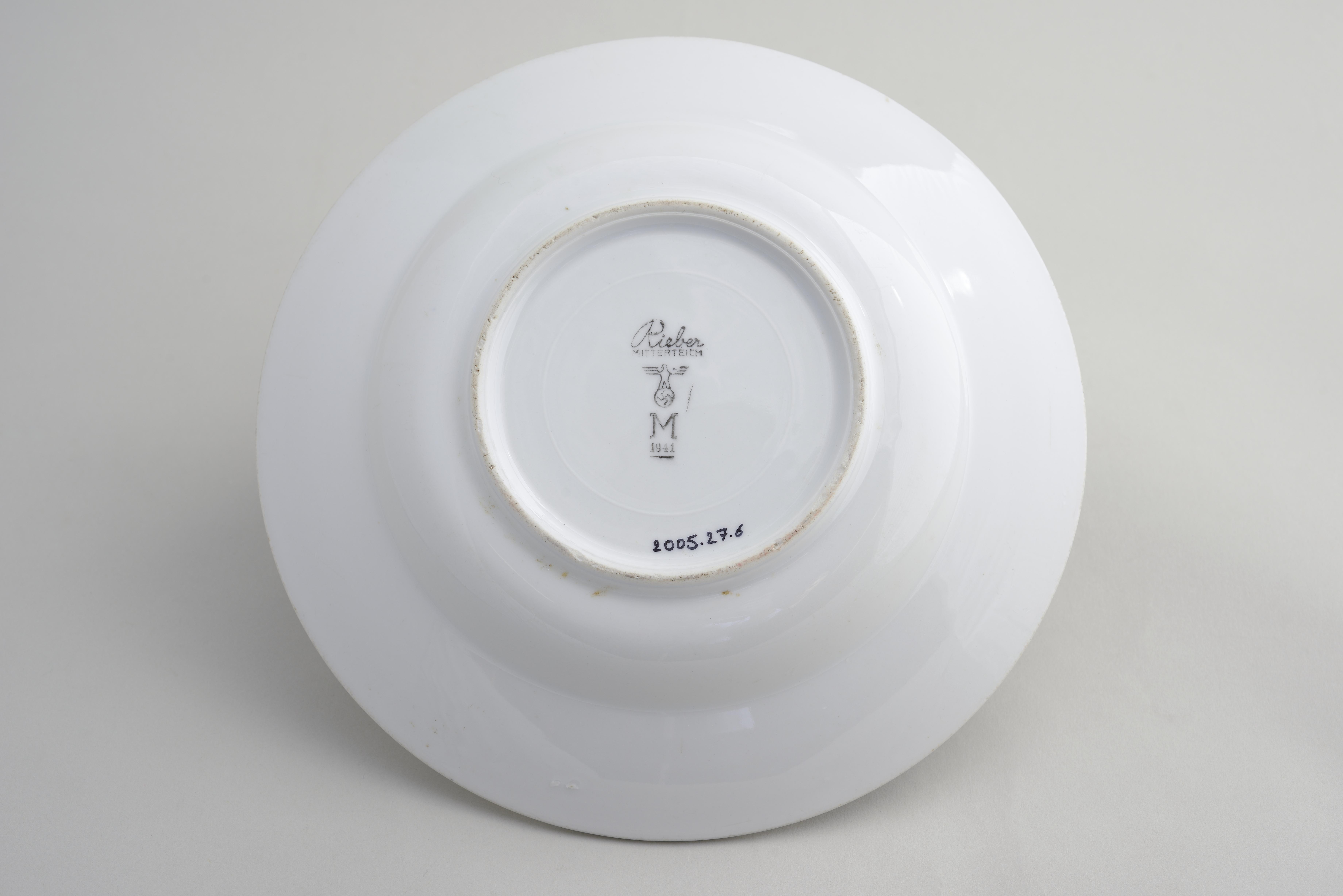 Cette assiette porte sur son revers l’emblème de la Kriegsmarine, marine de guerre allemande sous le IIIème Reich : un M majuscule surmonté d’un aigle nazi. Elle est subtilisée pendant la Seconde Guerre mondiale par Emile Cléro, chaudronnier-soudeur aux Chantiers de Bretagne à Nantes. En 1941, ce dernier est affecté par les autorités allemandes au travail à bord des navires de la Kriegsmarine qui mouillent à Nantes. Ne pouvant plus acheter de vaisselle, il dérobe régulièrement fourchettes, couteaux et assiettes, avec lesquels peut ainsi manger sa famille. Malgré leur caractère anodin, il aurait pu être fusillé pour ces vols répétés, qui témoignent des problèmes rencontrés par les habitants pour trouver ce qui leur est nécessaire.