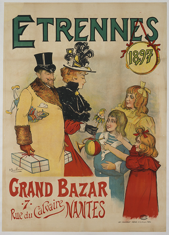 Cette affiche fait la promotion du Grand bazar de la rue du Calvaire, à Nantes. Elle a été réalisée en 1896 pour inviter à l’achat de cadeaux et jouets à destination des enfants, pour les étrennes du début de l’année 1897.