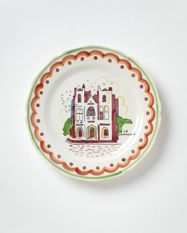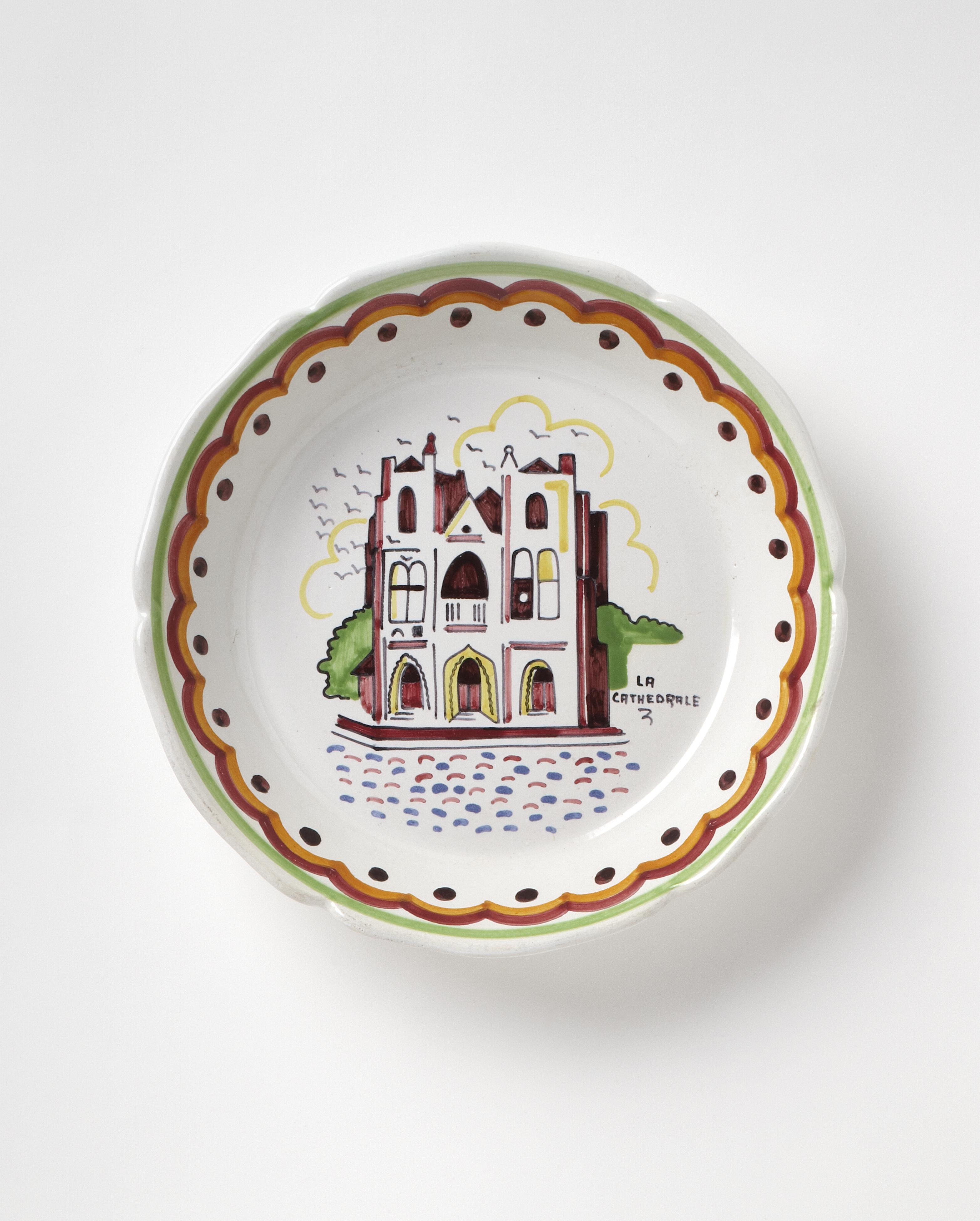 Cette assiette creuse fait partie d’une série réalisée en 1932 par Bernard Roy pour H.B. Quimper, et ayant pour thème les principaux monuments et marqueurs du paysage nantais. Si c’est ici la cathédrale qui est représentée, d’autres assiettes figurent le château des ducs de Bretagne, le Pont de Pirmil, le théâtre Graslin, le port, la Loire, le musée Dobrée, la colonne Saint-Pierre, etc.