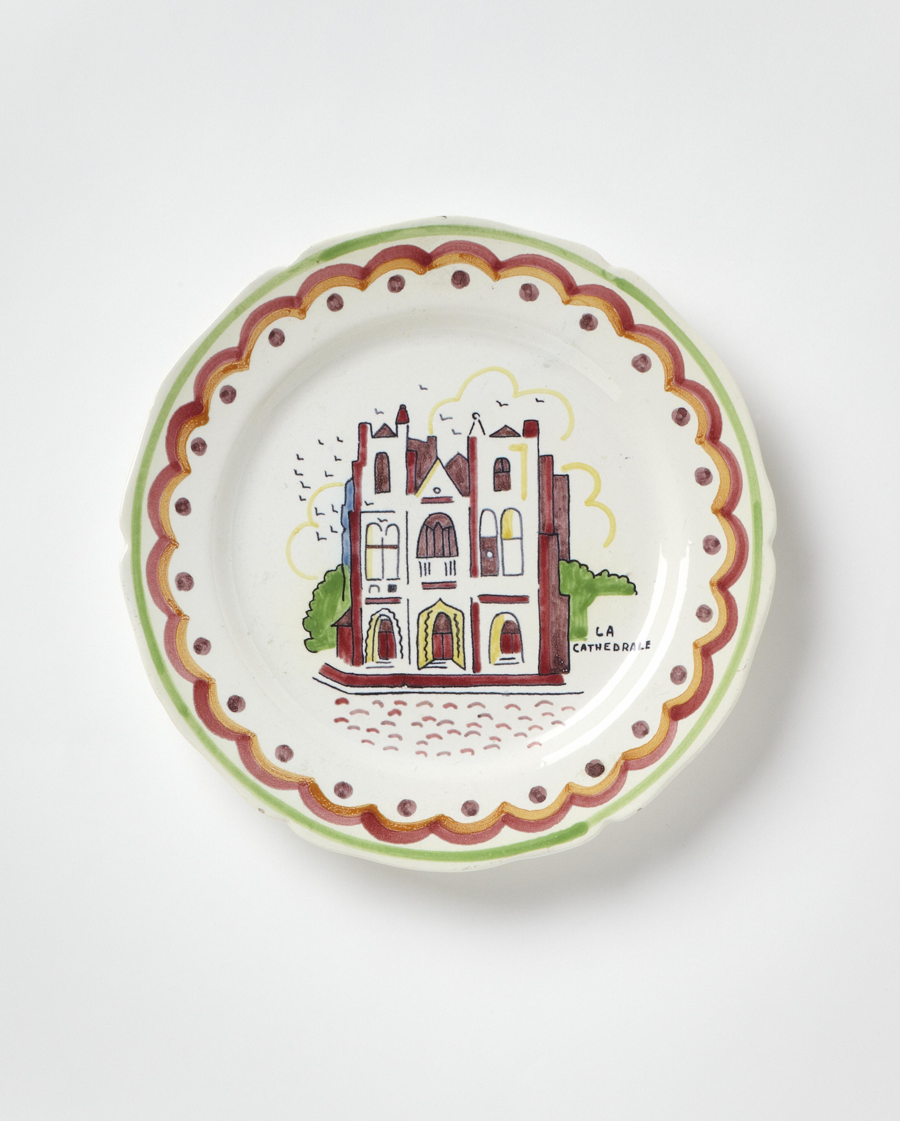 Cette assiette creuse fait partie d’une série réalisée en 1932 par Bernard Roy pour H.B. Quimper, et ayant pour thème les principaux monuments et marqueurs du paysage nantais.