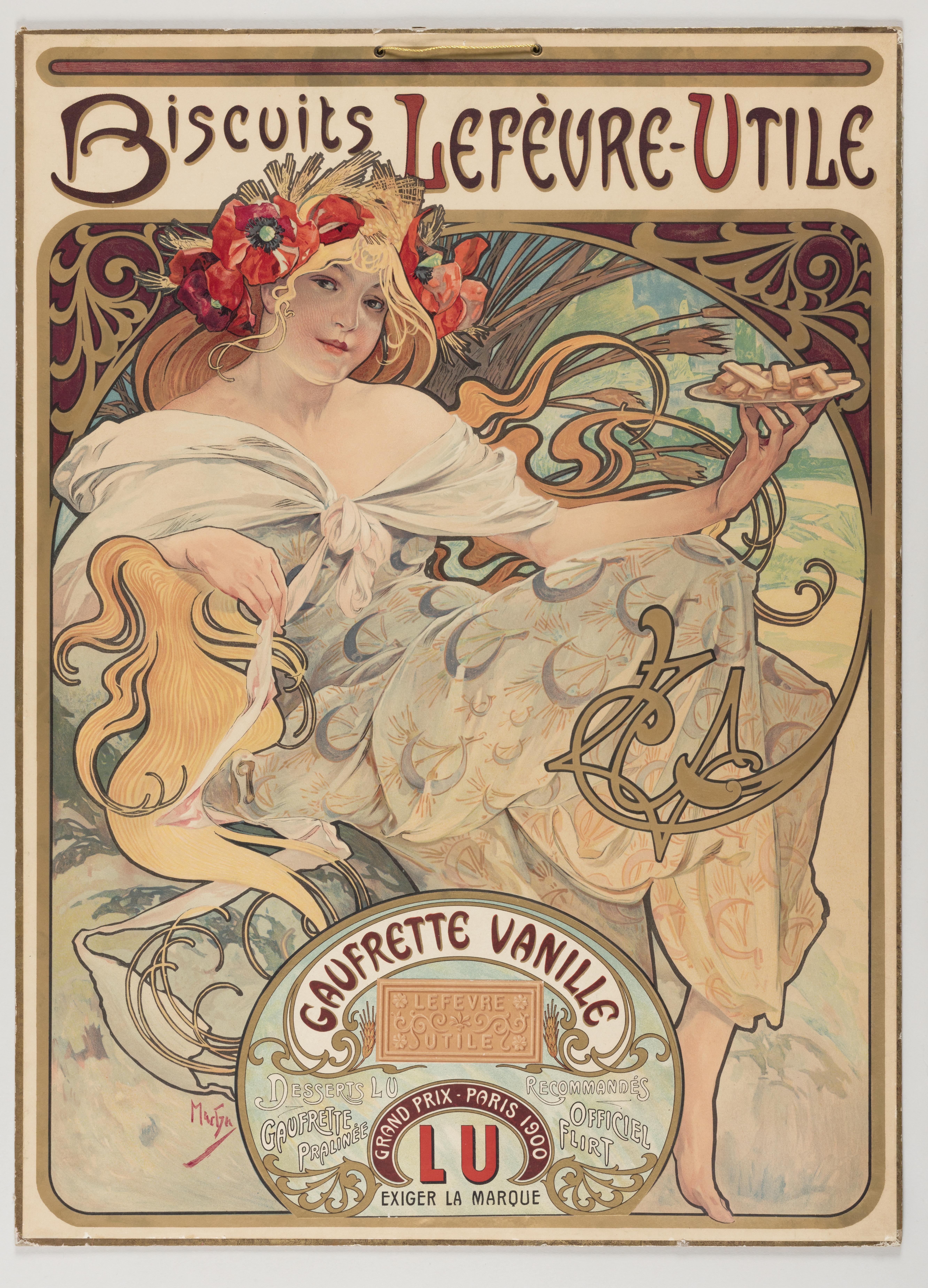 En juin 1896, Champenois qui a déjà fait réaliser par Mucha, pour LU, le tableau publicitaire pour les biscuits Champagne, propose un sujet du même artiste pour les calendriers 1897. Louis Lefèvre-Utile est intéressé par le projet qui constitue une véritable rupture avec les sujets traditionnellement utilisés par la maison LU pour ses calendriers. En effet, le tracé sinueux et stylisé de la chevelure et de l’entourage sont caractéristiques de l’Art nouveau en plein essor à cette époque. De plus, il semblerait que la maison Lefèvre-Utile avait le désir de s’attacher une image plus « artistique », se posant comme un mécène des dernières tendances à la mode sur Paris. LU compte sur ce calendrier novateur pour faire reconnaître son intérêt pour la valeur et la recherche artistique au sein de sa stratégie publicitaire. Paradoxalement, il apparaît dans les archives que cette création n’a pas recueilli le succès escompté auprès des clients de province. Contrairement aux attentes de Louis Lefèvre-Utile, la qualité de ce calendrier n’est reconnue qu’à Paris. Cette composition sera utilisée en 1899 pour le tableau réclame de la gaufrette vanille.