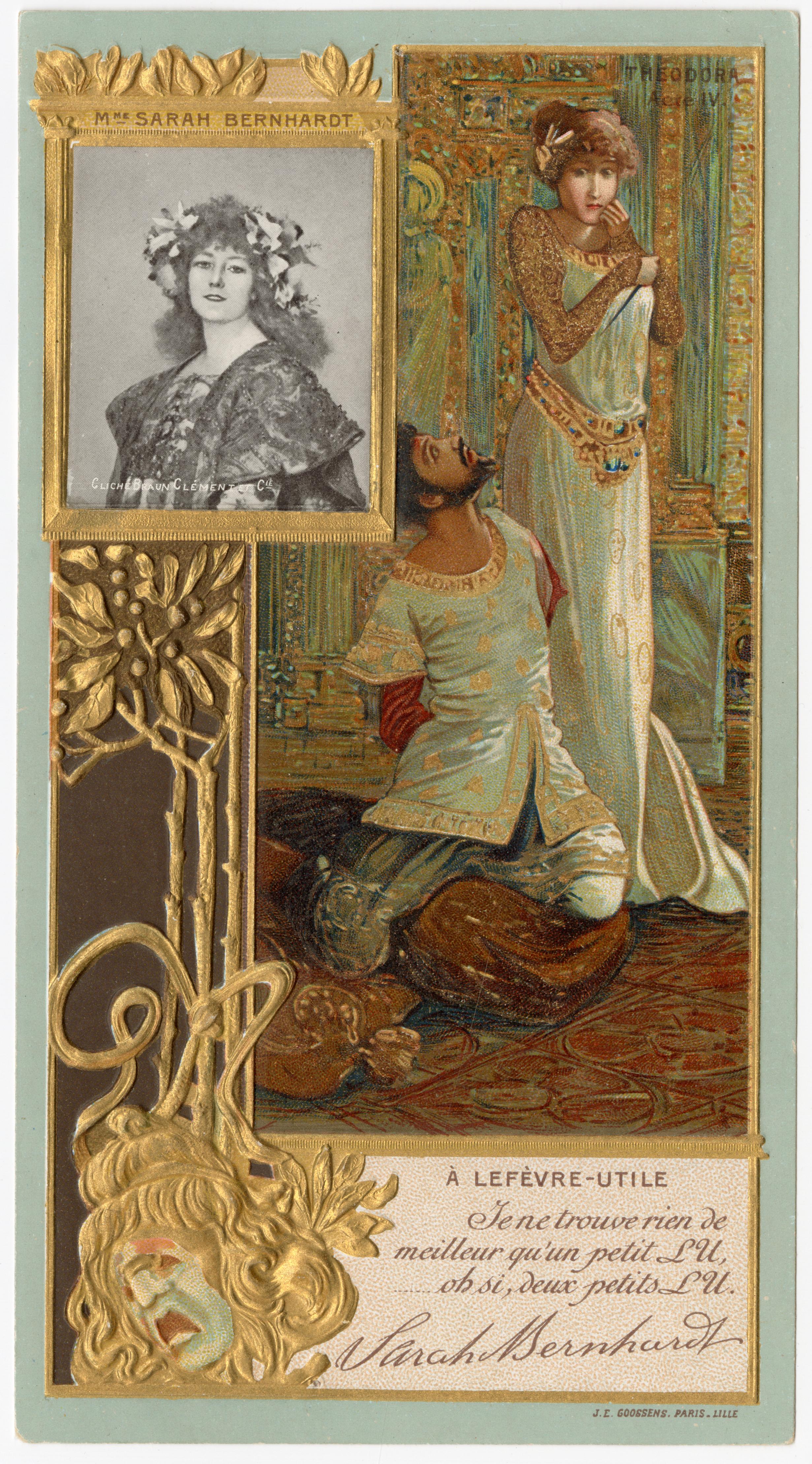 Il s’agit d’une carte-autographe, éditée par la biscuiterie Lefèvre-Utile, représentant Sarah Bernhardt dans l’acte IV de Théodora de Victor Sardou, en 1884.